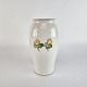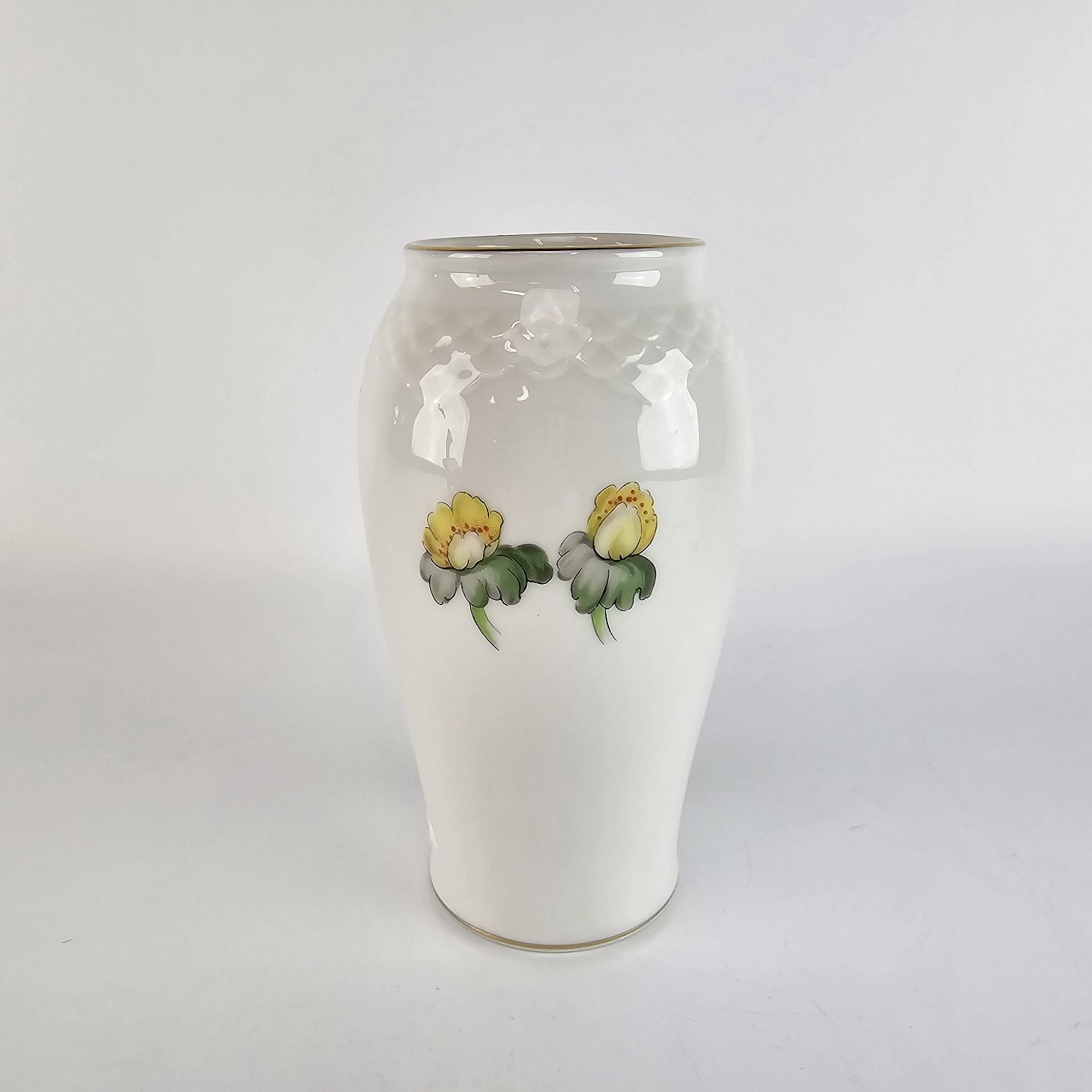 Hvidt porcelæn i skælform med dekoration af gule blomster og guldkant