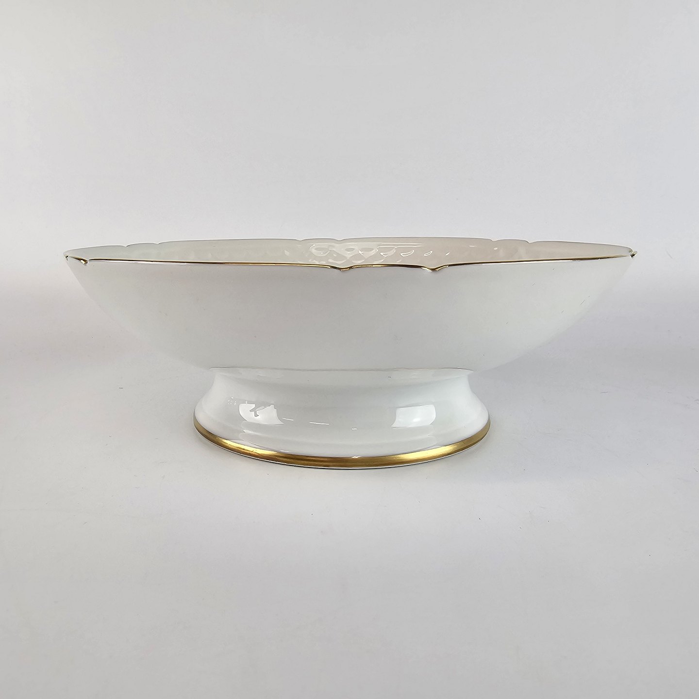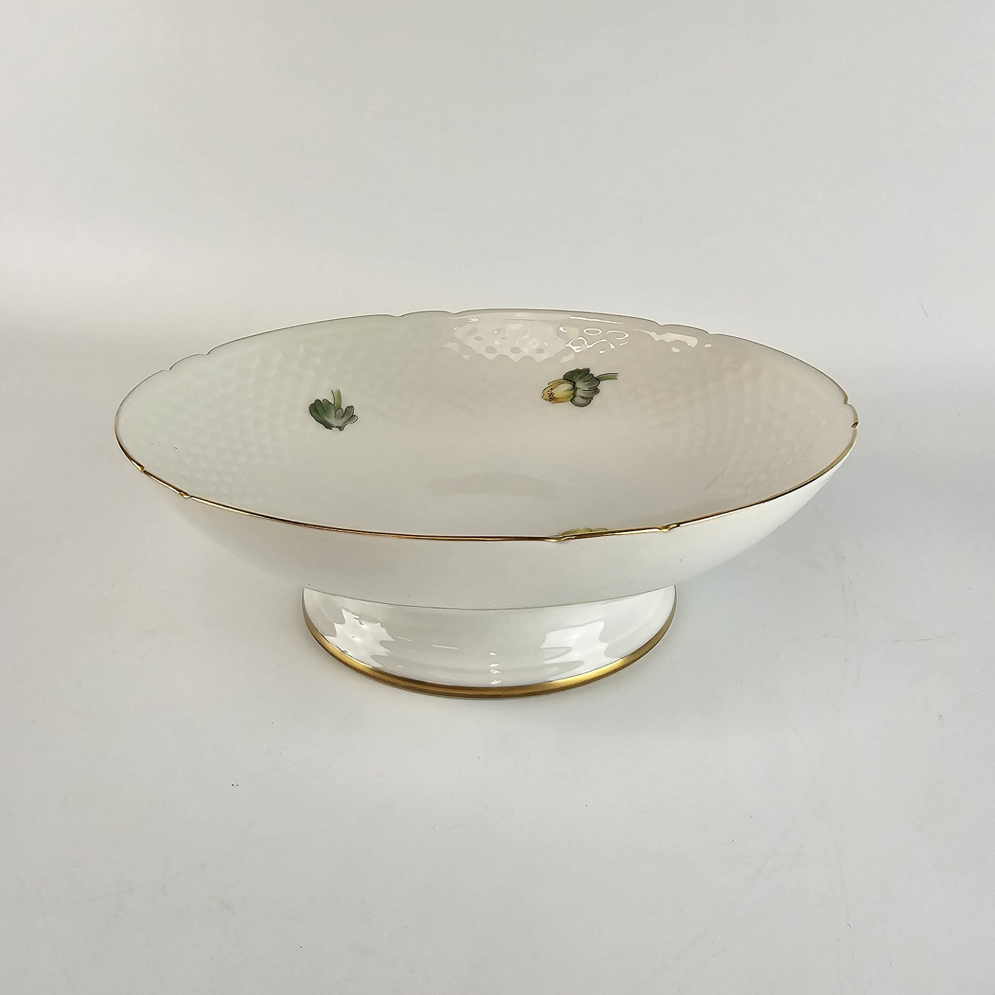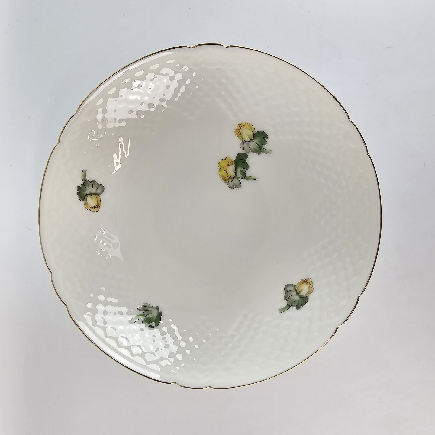 Hvidt porcelæn i skælform med dekoration af gule blomster og guldkant