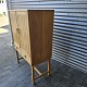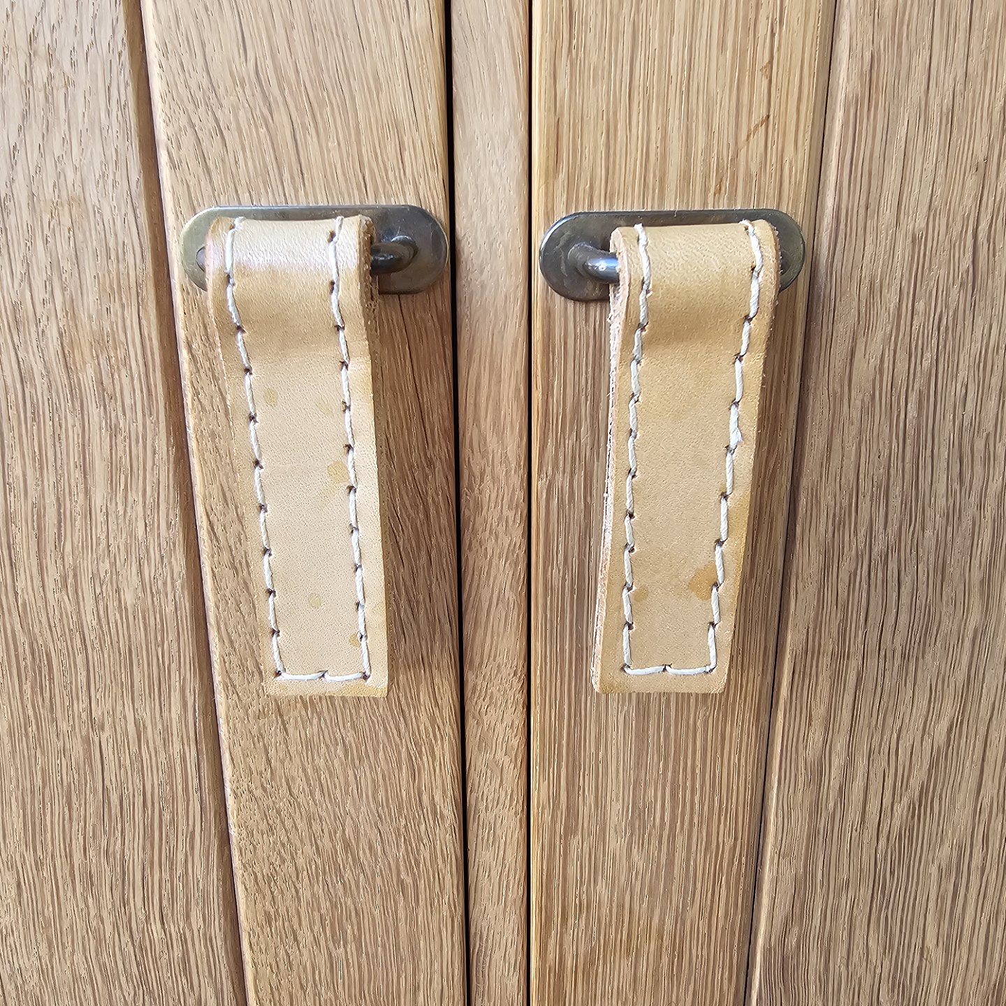 Bestikskab i massivt ubehandlet egetræ. Bag lågerne er der hylder og skuffer. Grebene er af beige læder