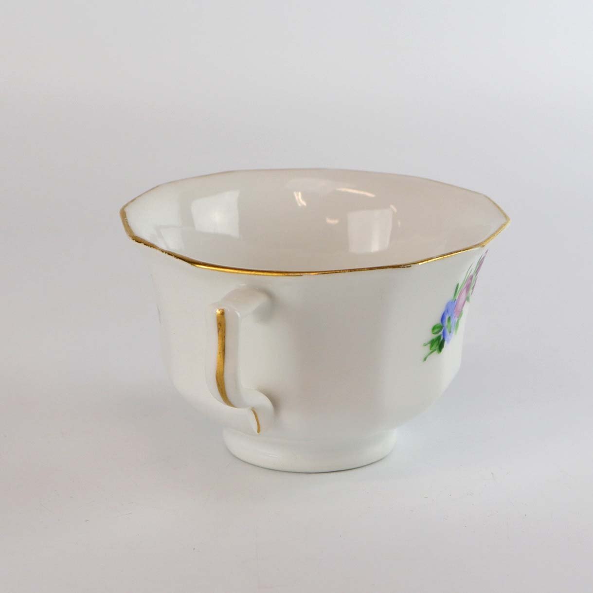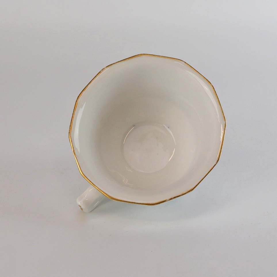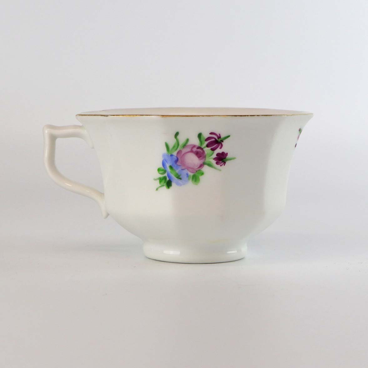 Kop i glat kantet hvidt porcelæn med faverige motiver af blomster og guldkant