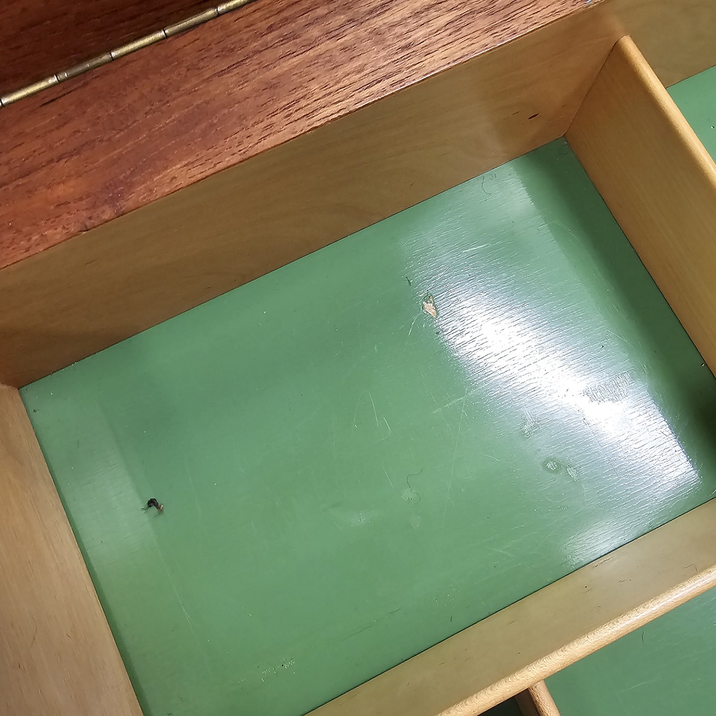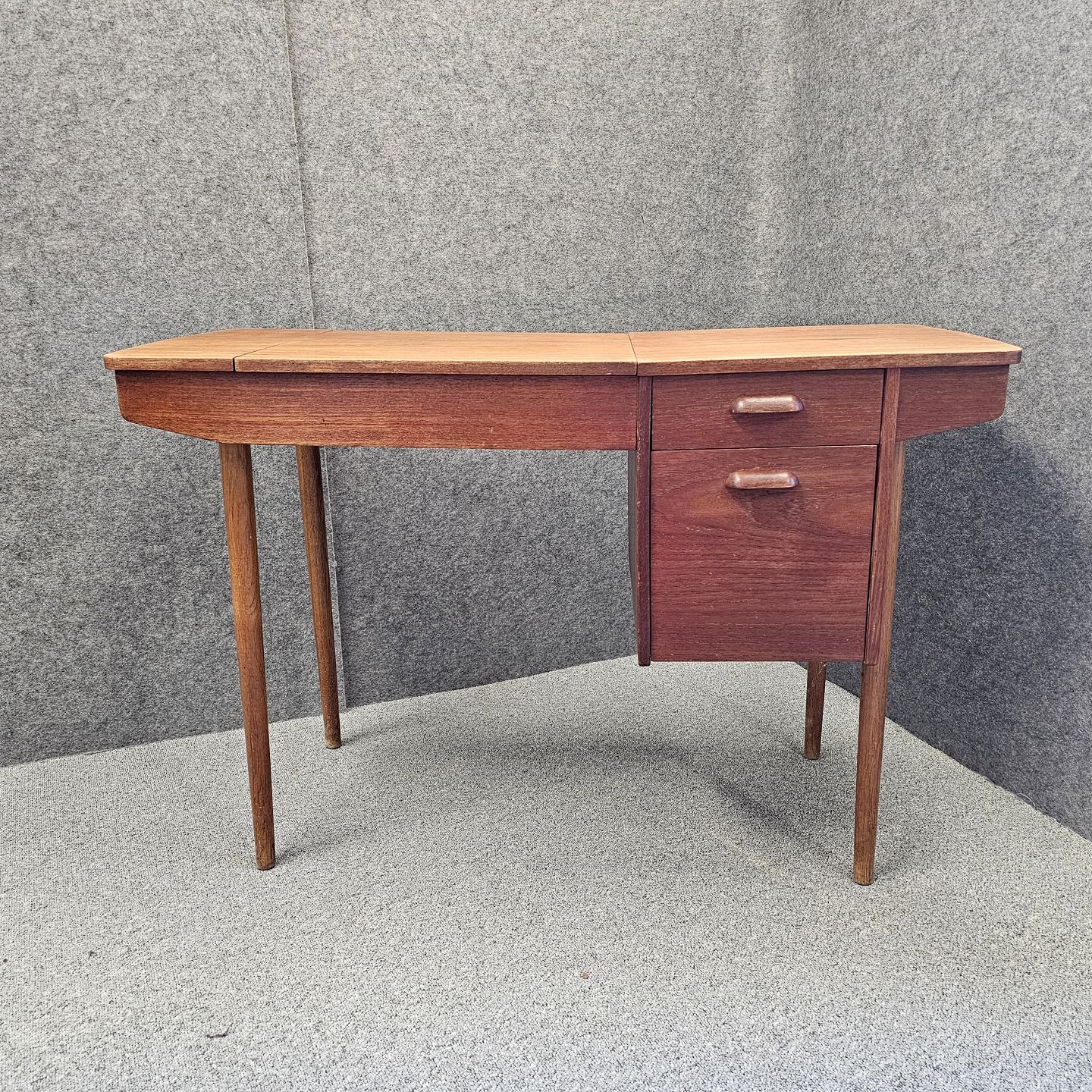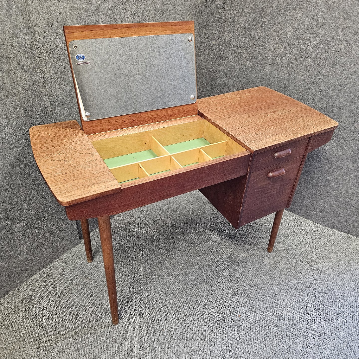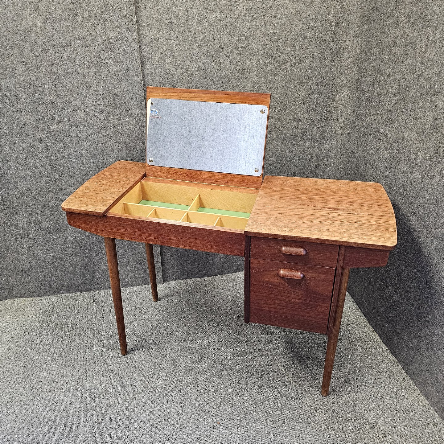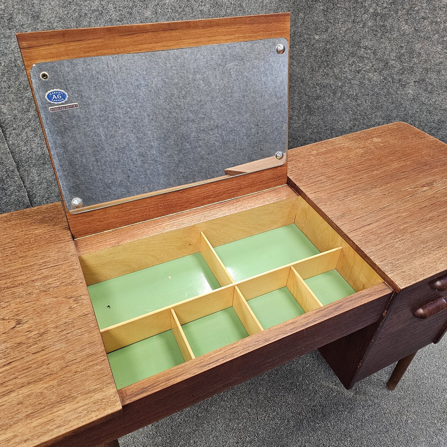 Teaktræsbord med indbygget spejl og plads til opbevaring. Kan anvendes som toiletbord, sminkebord, skrivebord, sybord og meget andet. Spejlet er kobberbehandlet. Garanti ved AG Aarhus