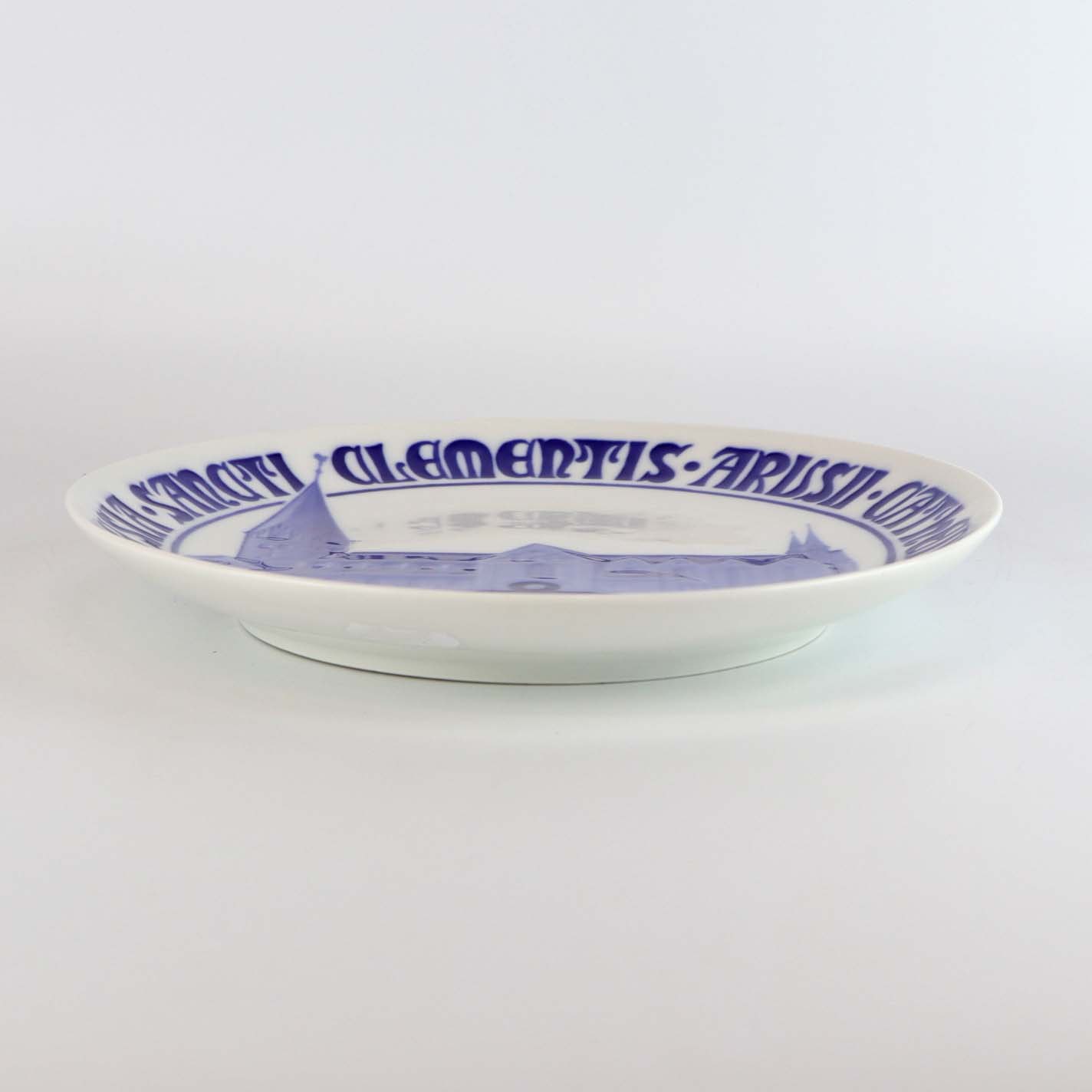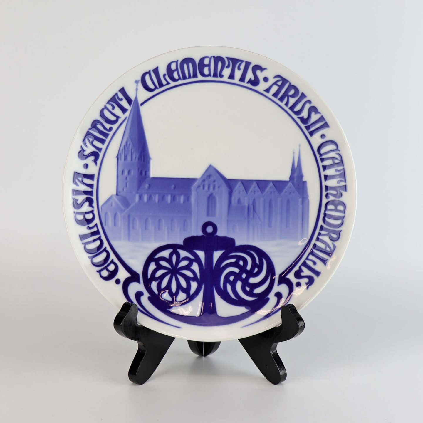 Mindeplatte i porcelæn med motiv af Aarhus Domkirke og latinsk tekst Ecclesia Sancti Clementis Arusii Cathedralis
