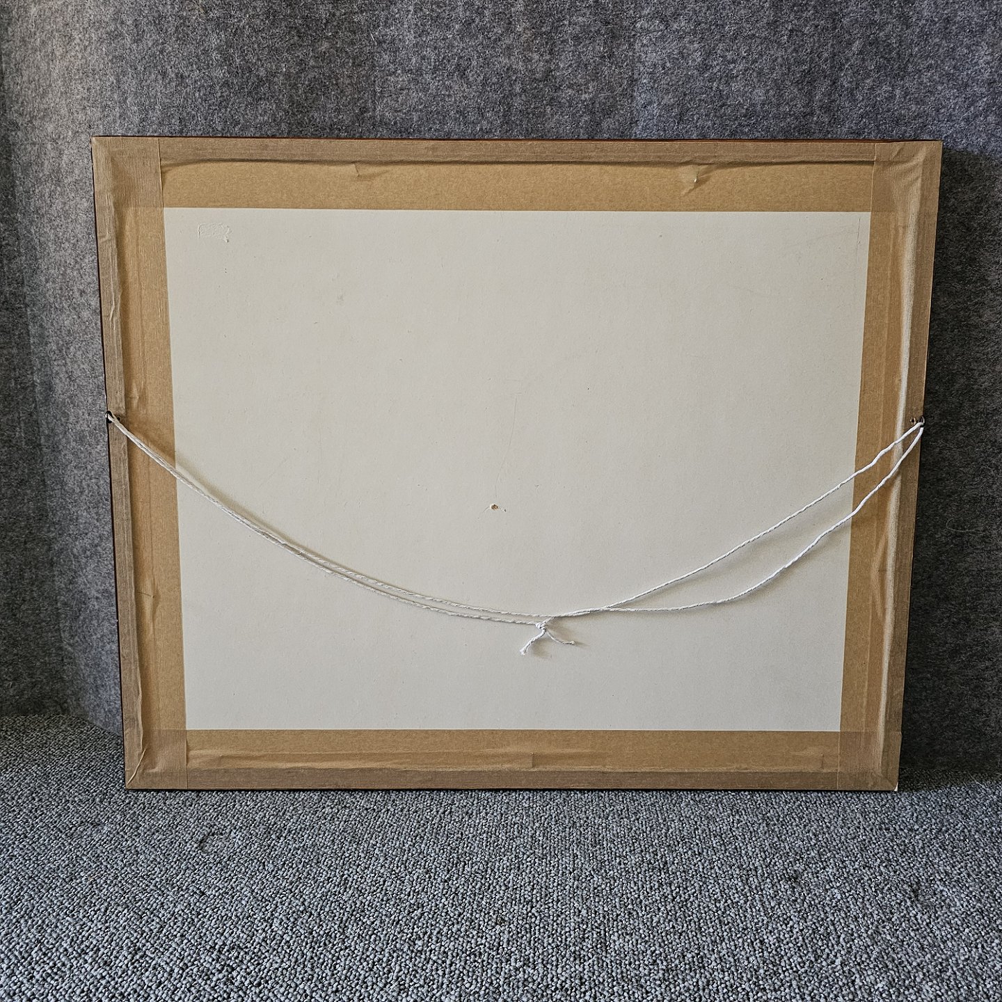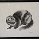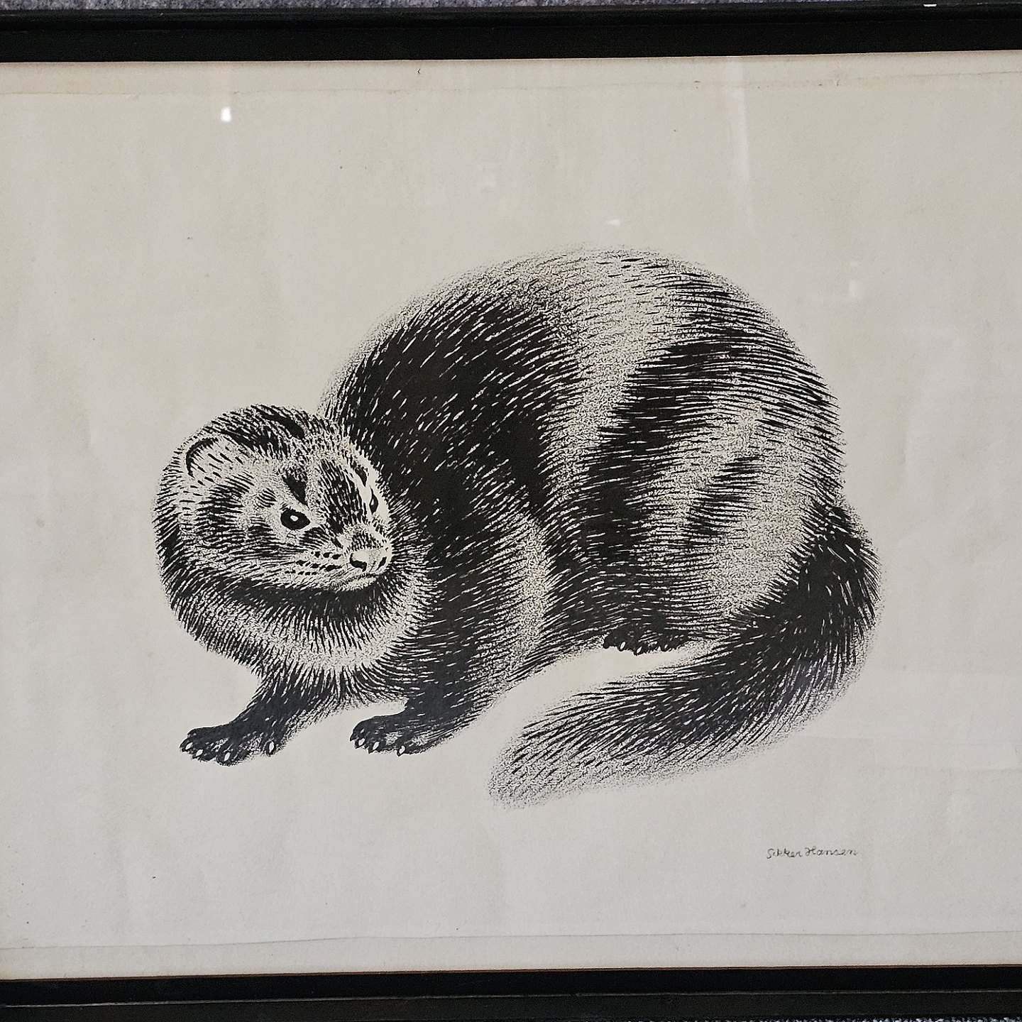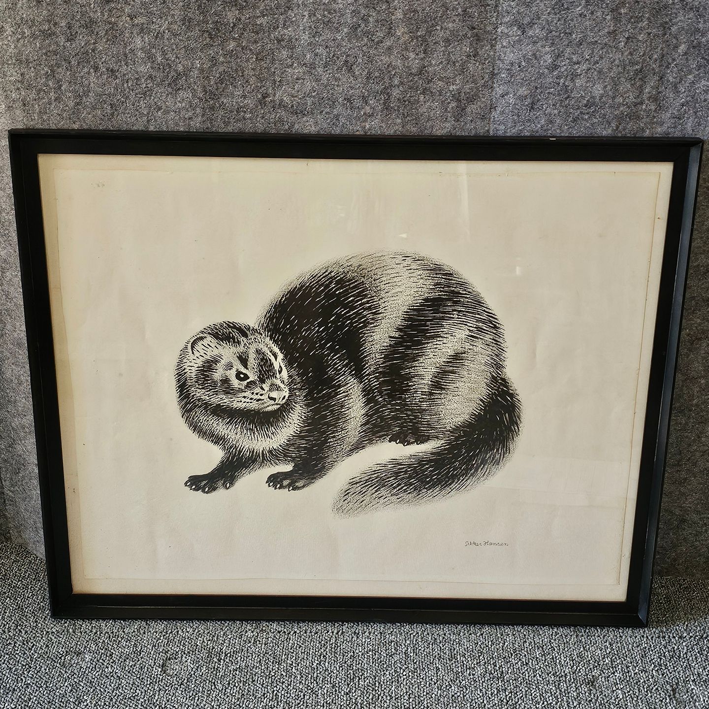 Indrammet tryk i sortmalet træramme med motiv af en sort og hvid mink