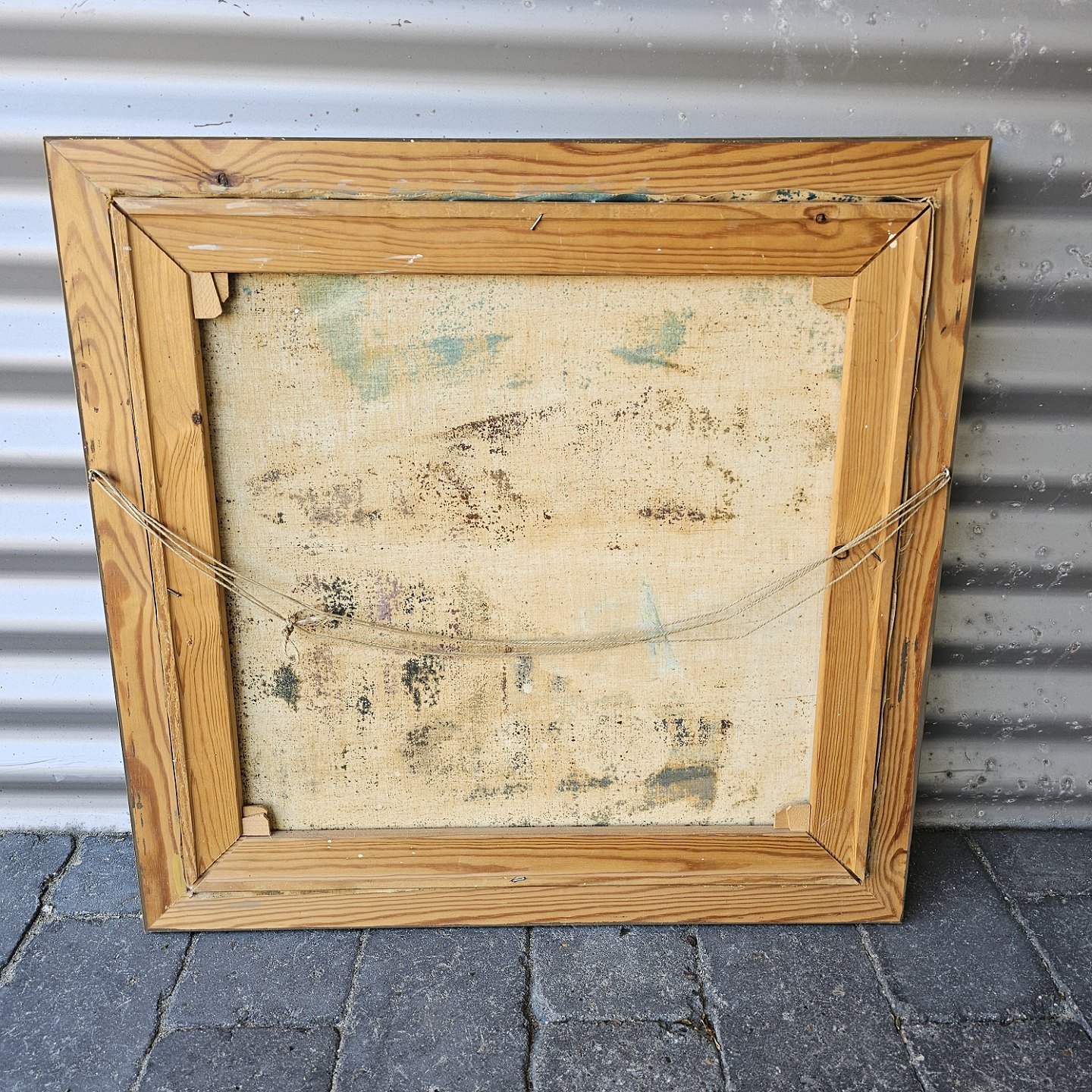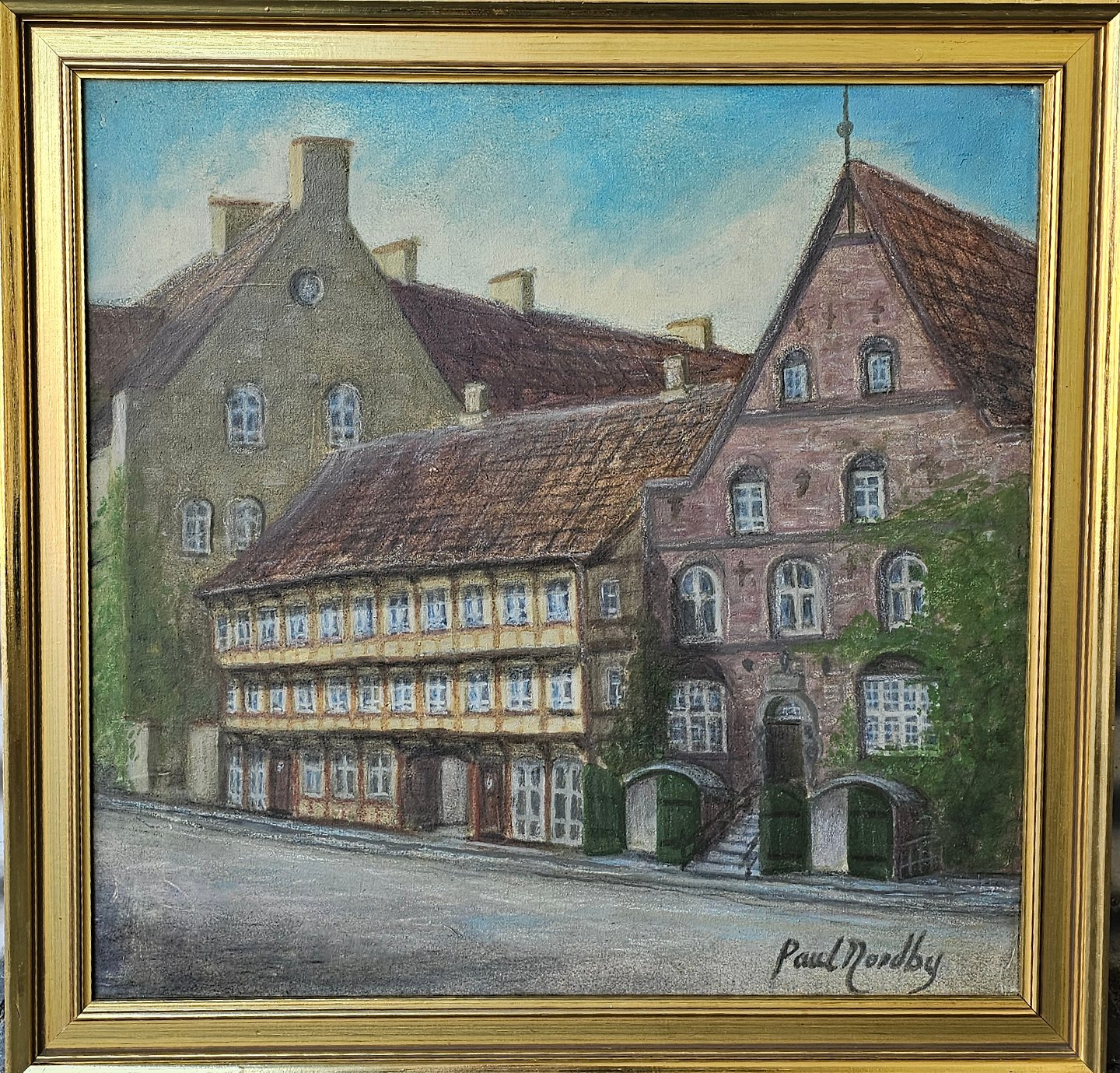 Maleri på lærred i gylden træramme med motiv af bygninger på Østerågade i Aalborg
