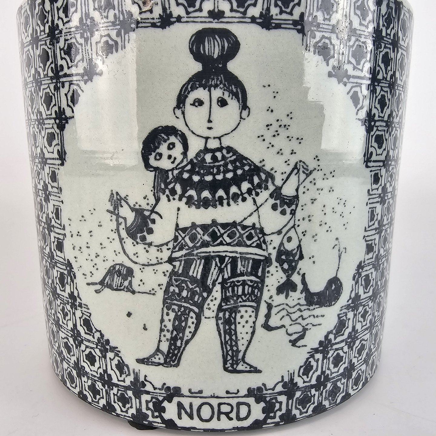 Urtepotteskjuler af keramik med det klassiske sort/hvide mønster og derudover dekoreret med en person med grønlandsk tøj, en sæl, fisk og snevejr