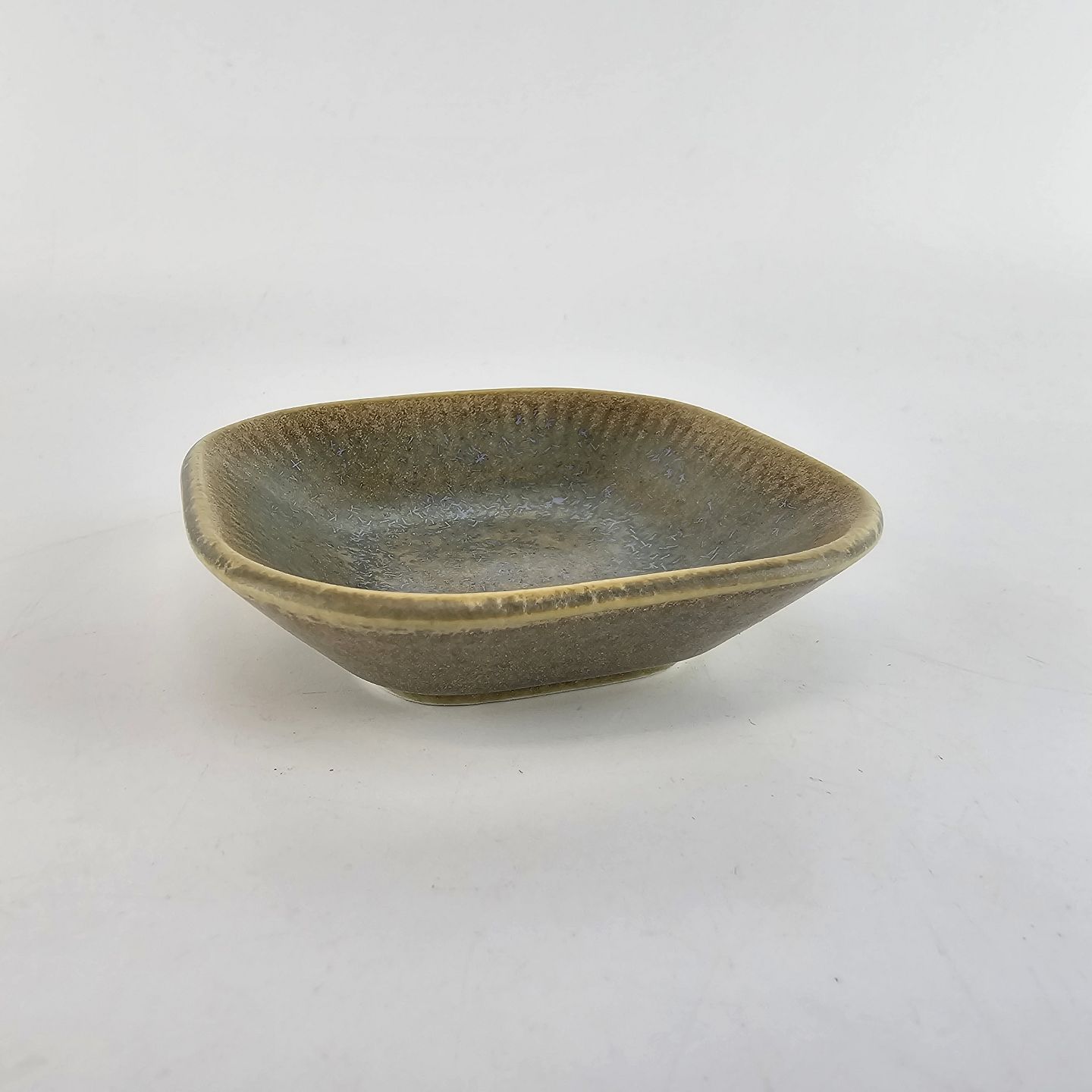 Kvadratisk asiet af stentøj og dekoreret med en grønlig nuancefarvet glasering. Fra serien Knabstrup - ofte kaldet Grøn Nøddebo