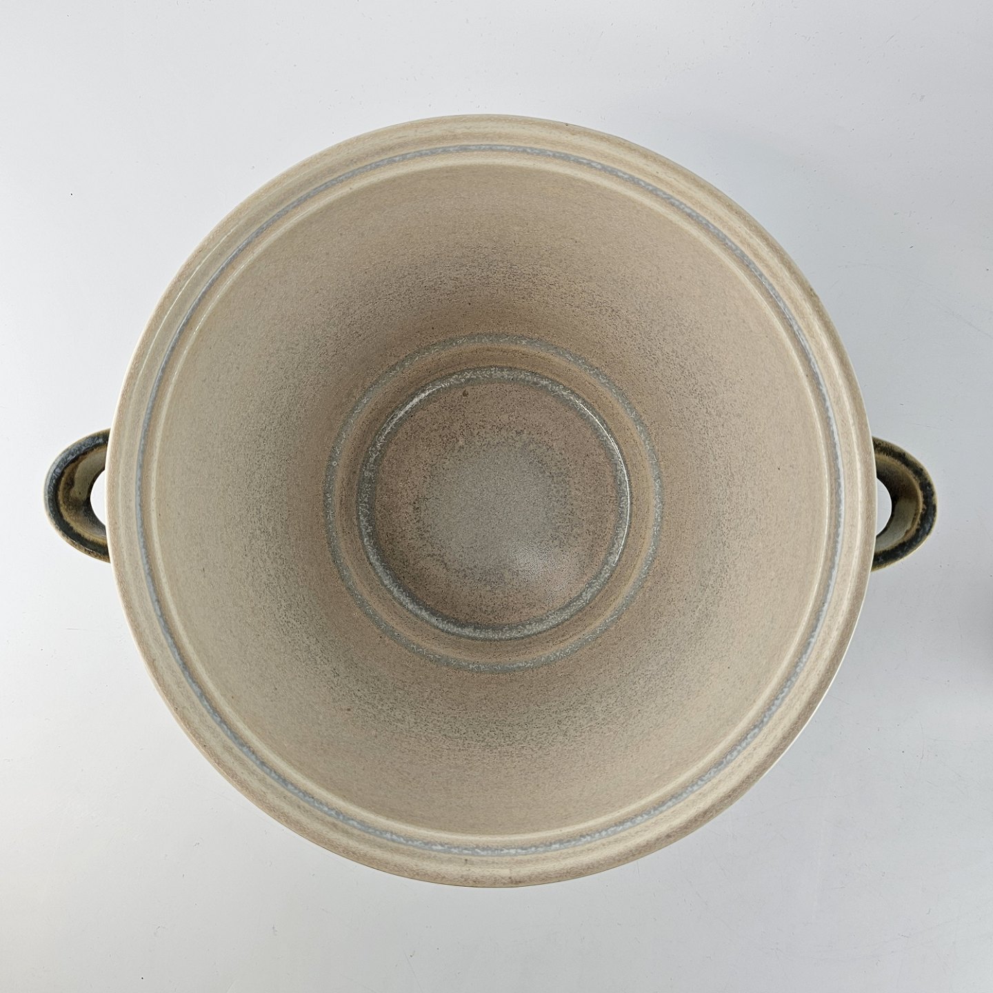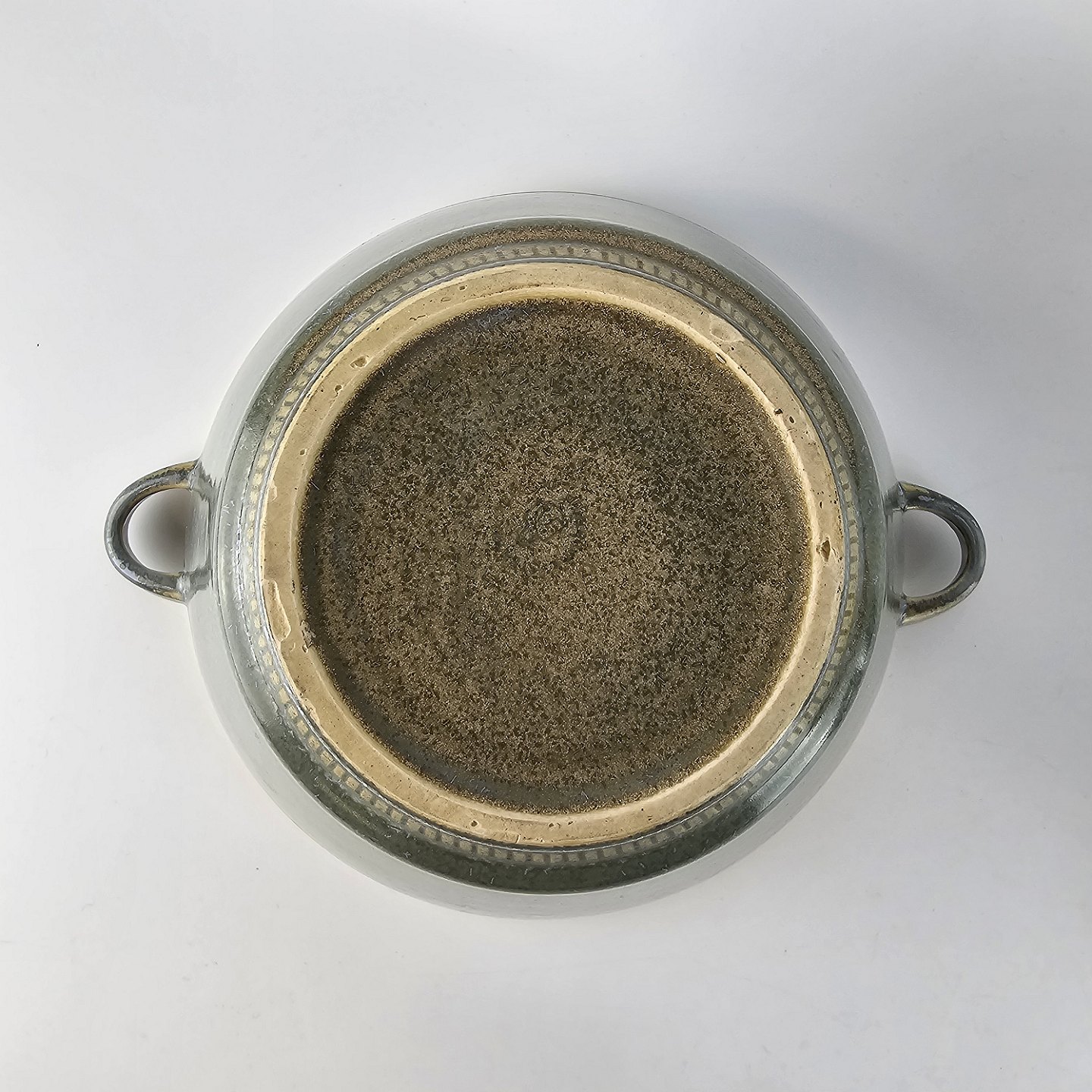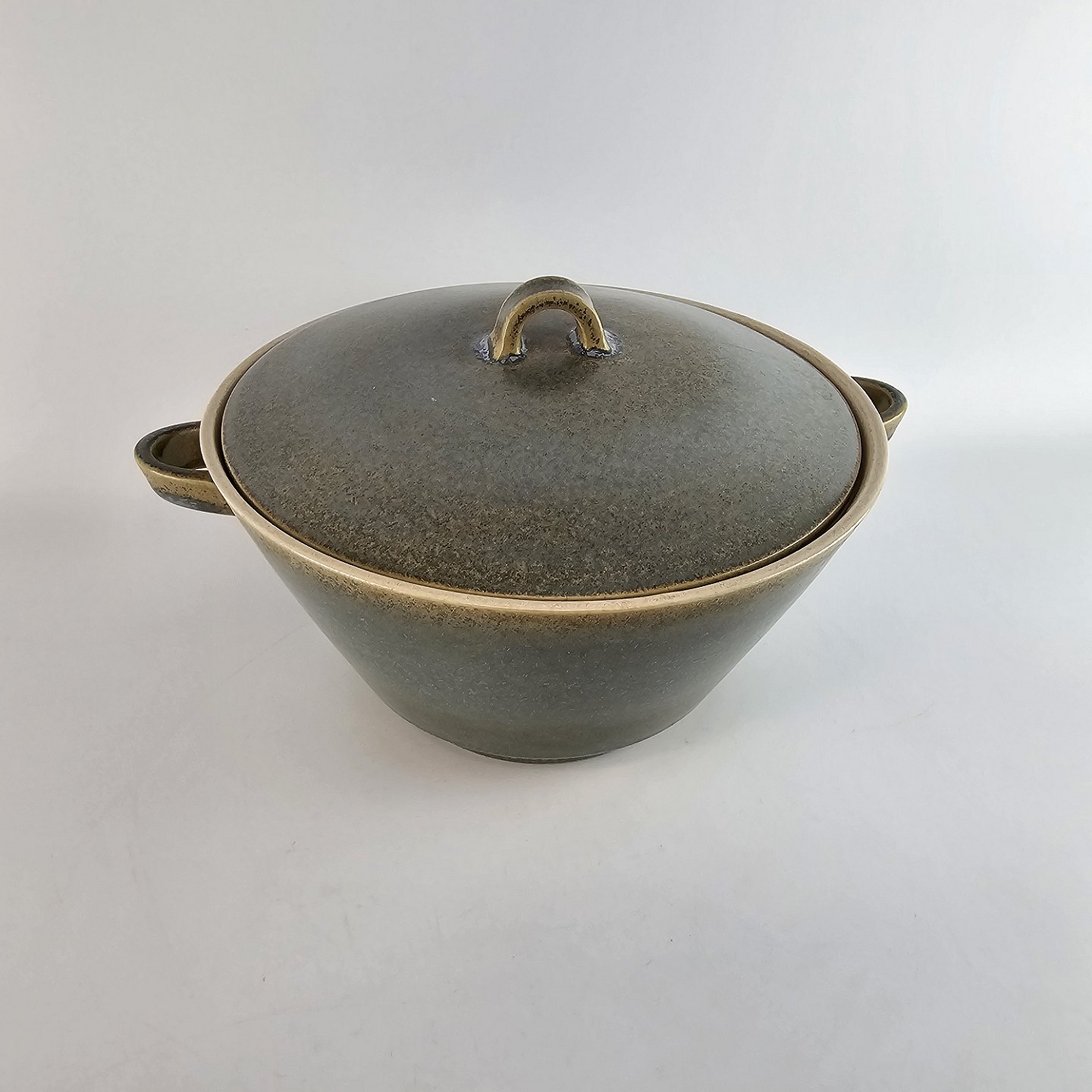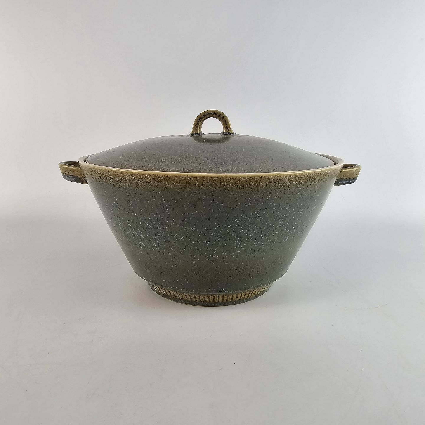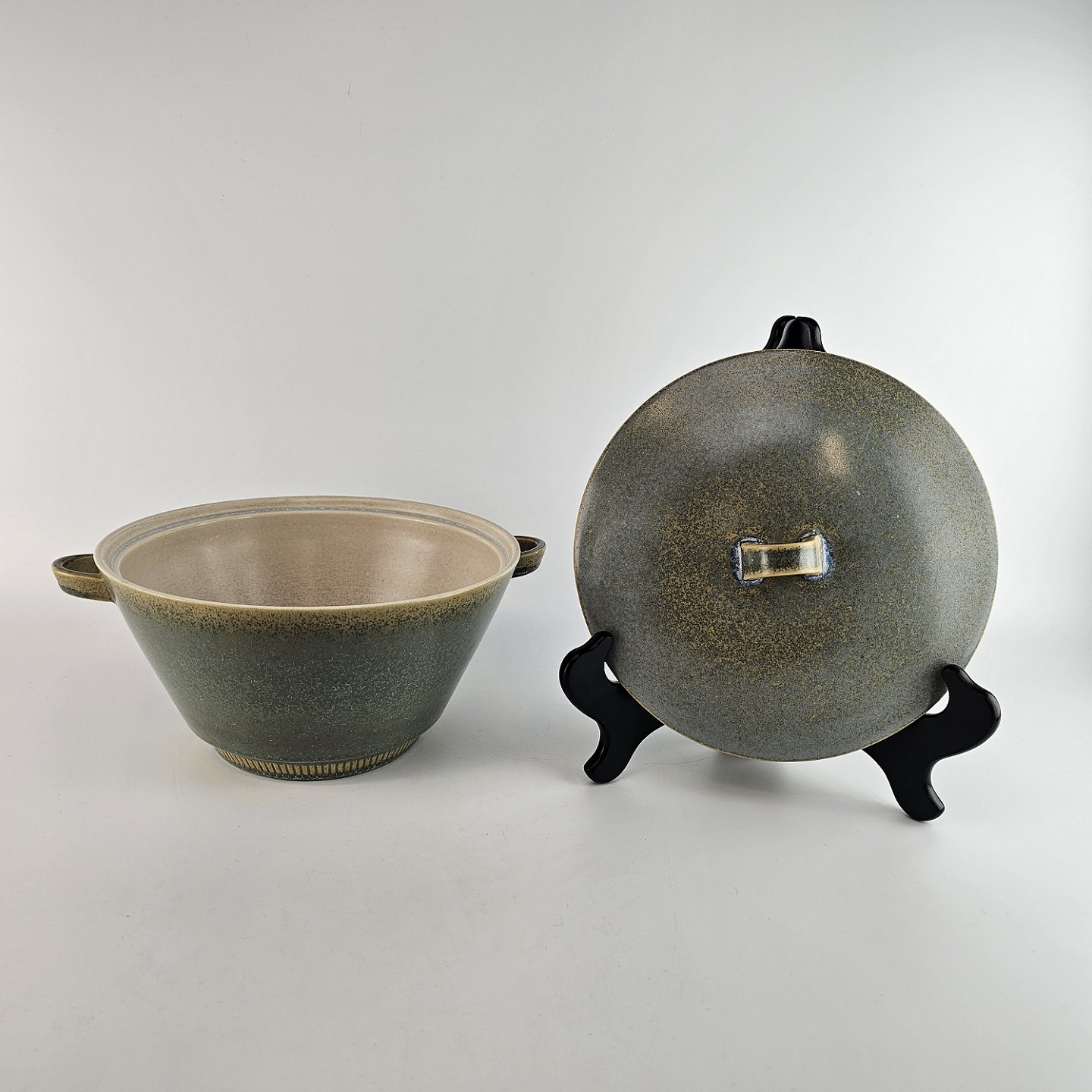 Kartoffelskål med låg af stentøj og dekoreret med en grønlig nuancefarvet glasering.