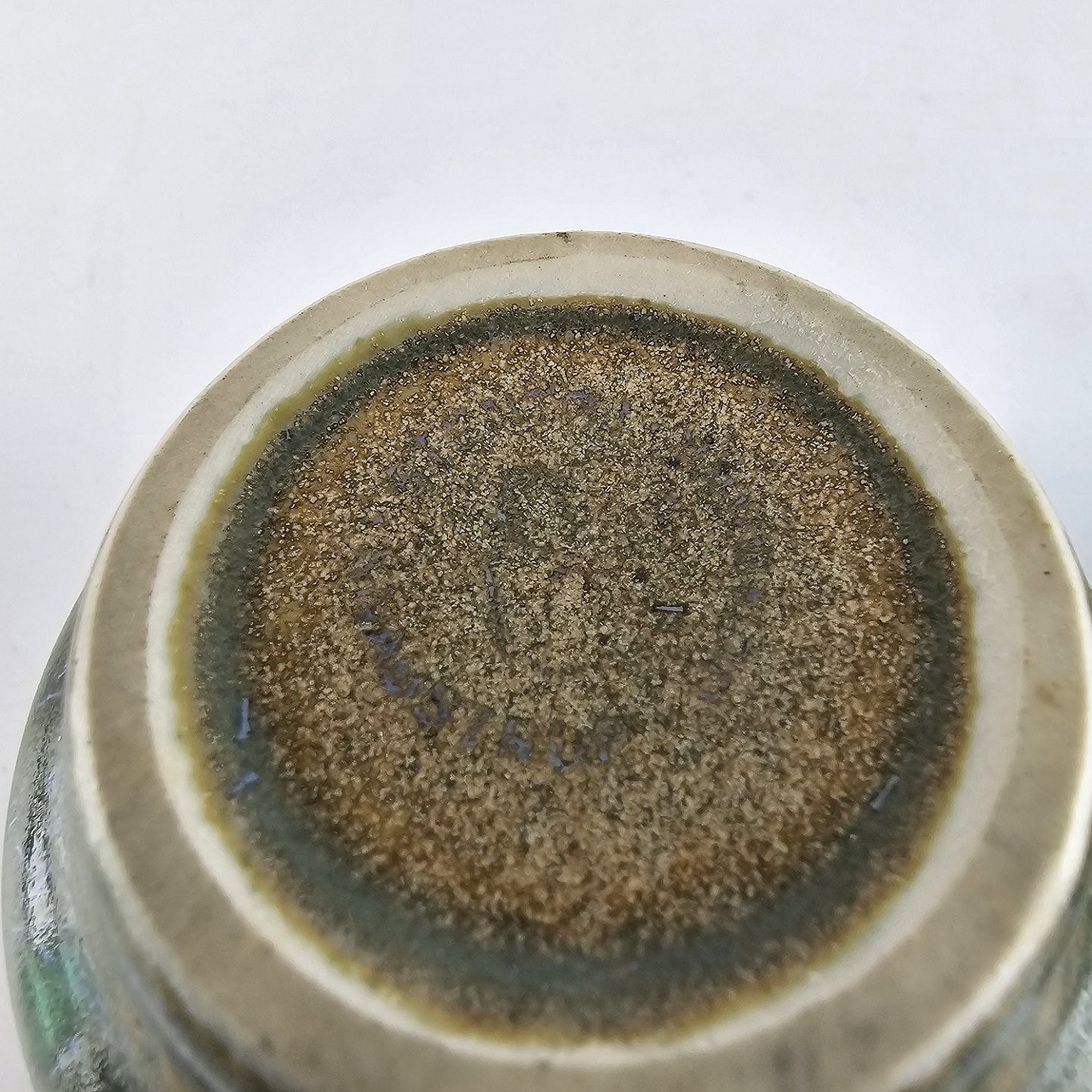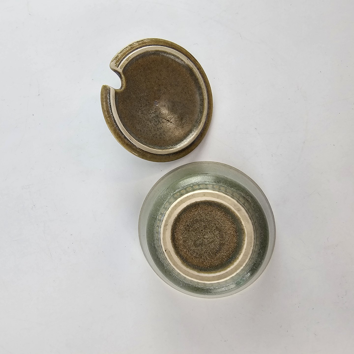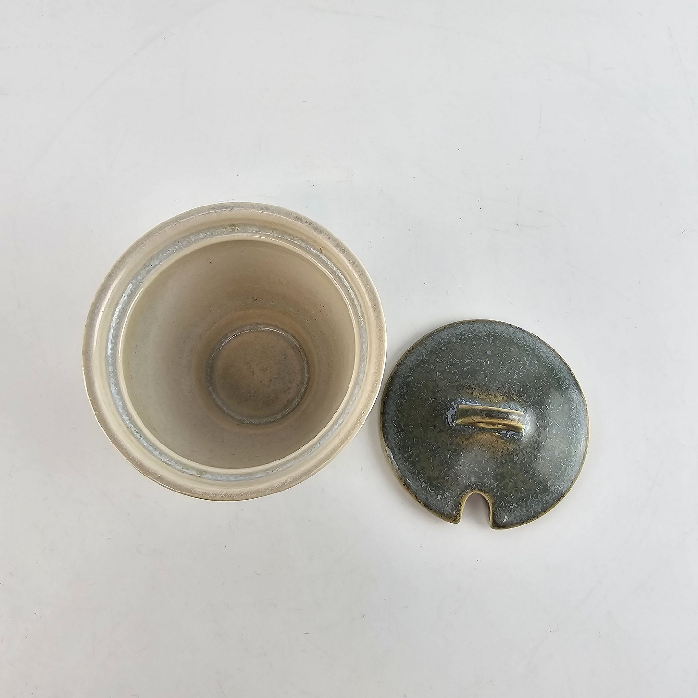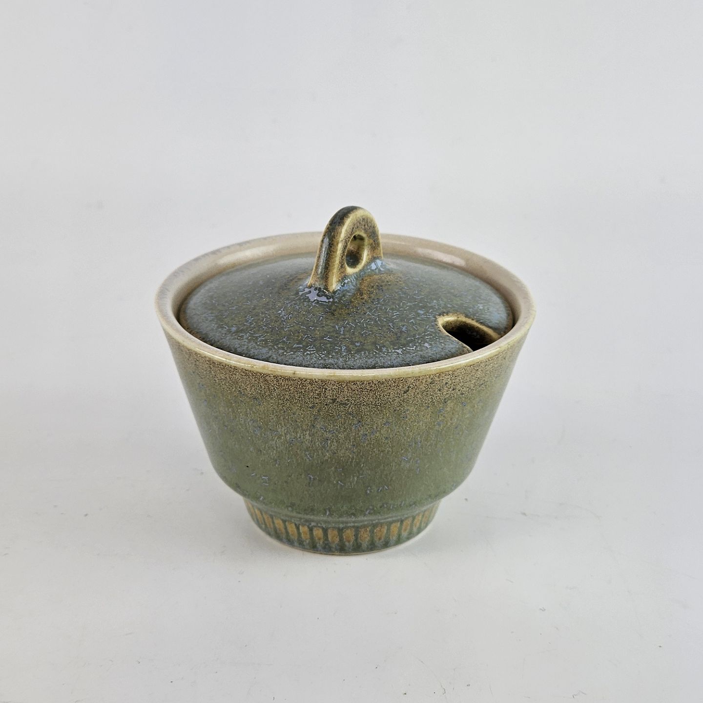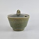 Sukkerskål af stentøj og dekoreret med en grønlig nuancer farvet glasering.