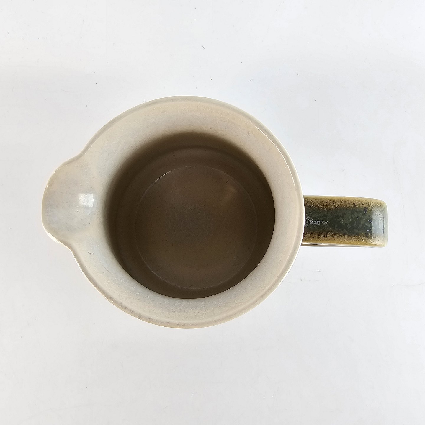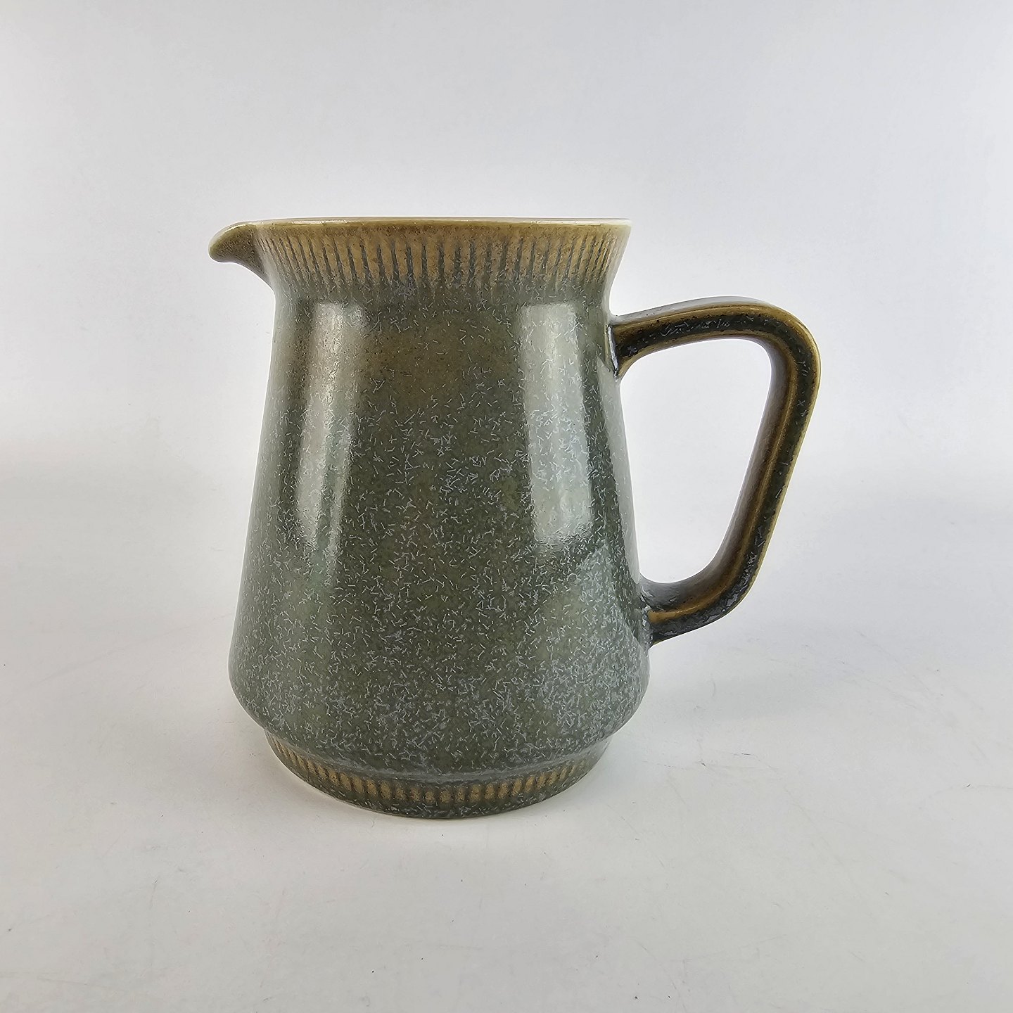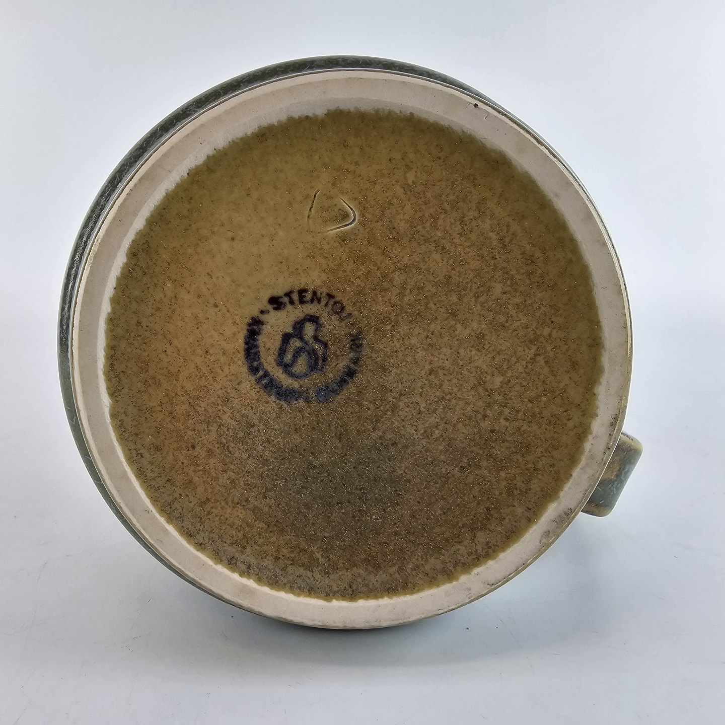 Kande af stentøj og dekoreret med en grønlig nuancefarvet glasering.