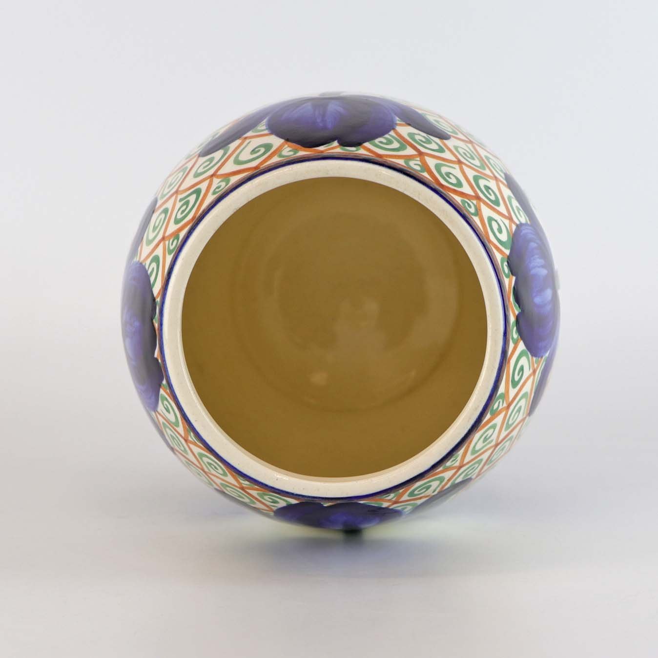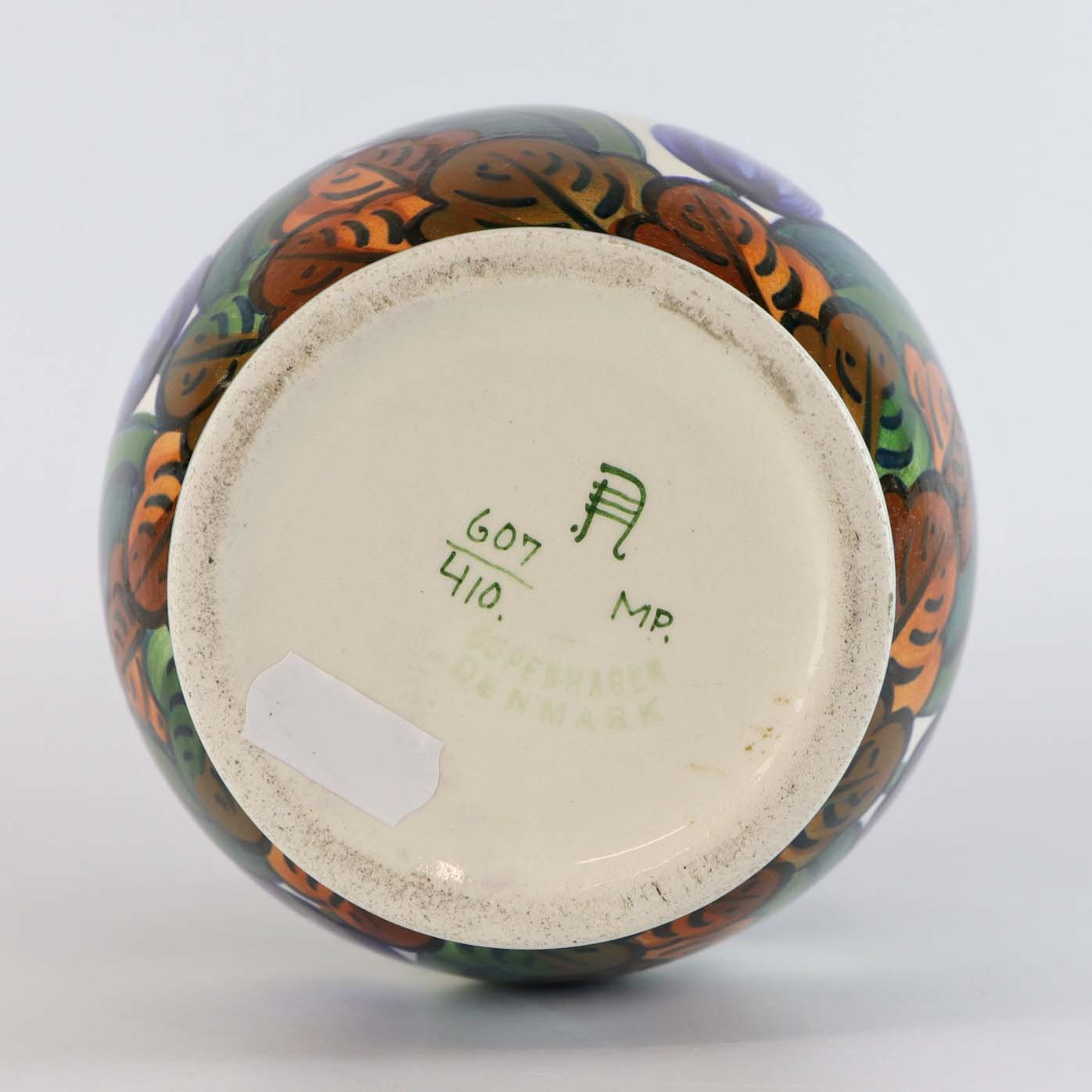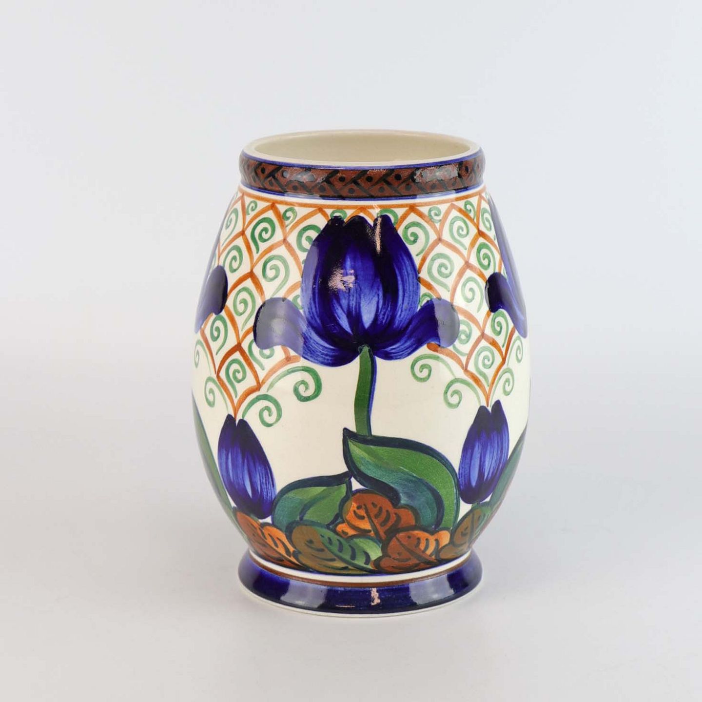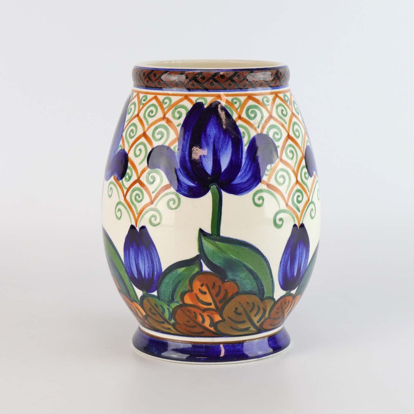 Vase i fajance med motiv af blå tulipaner på abstrakt baggrundsmønster nr. 607/410