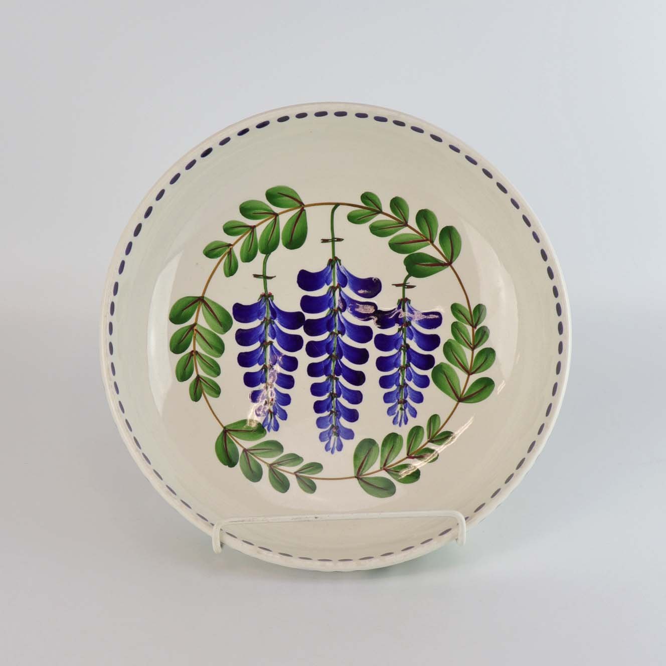 Blåregn er af fajance, glaseret hvidt og med dekorationer af blåregn og grønne blade