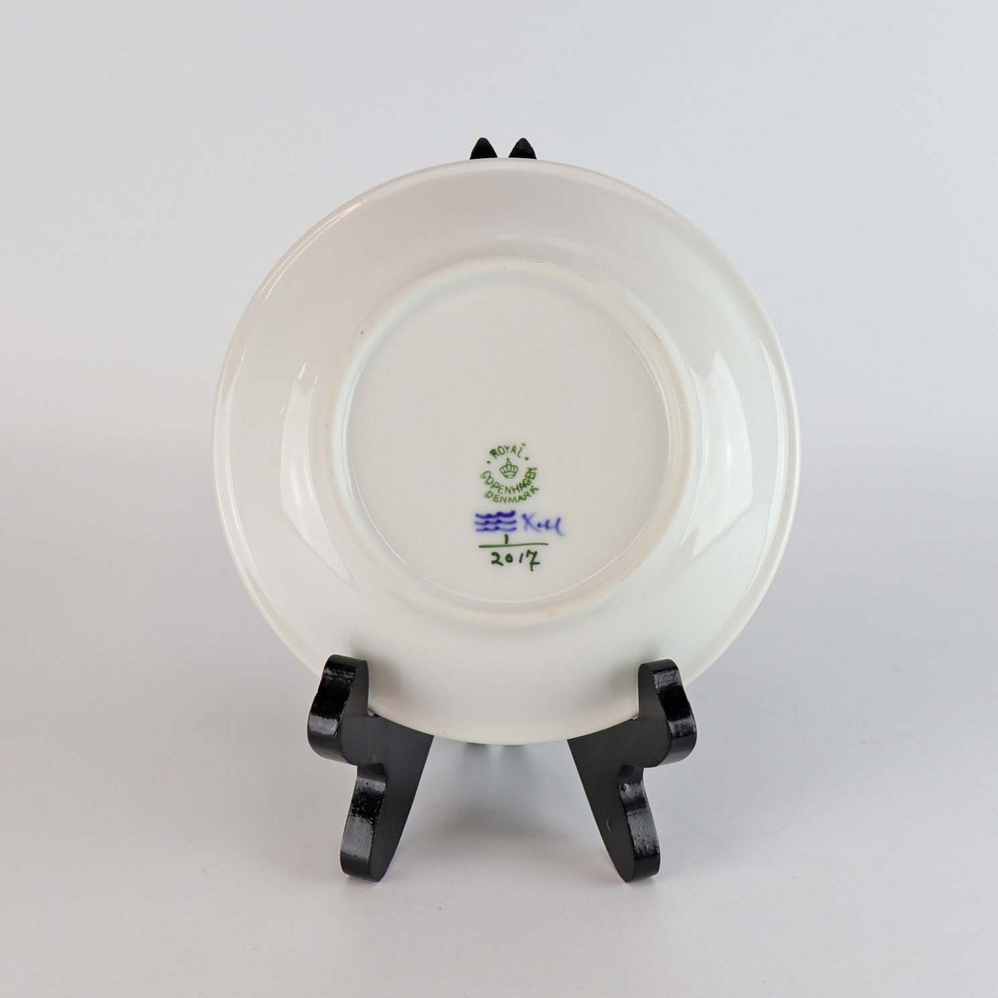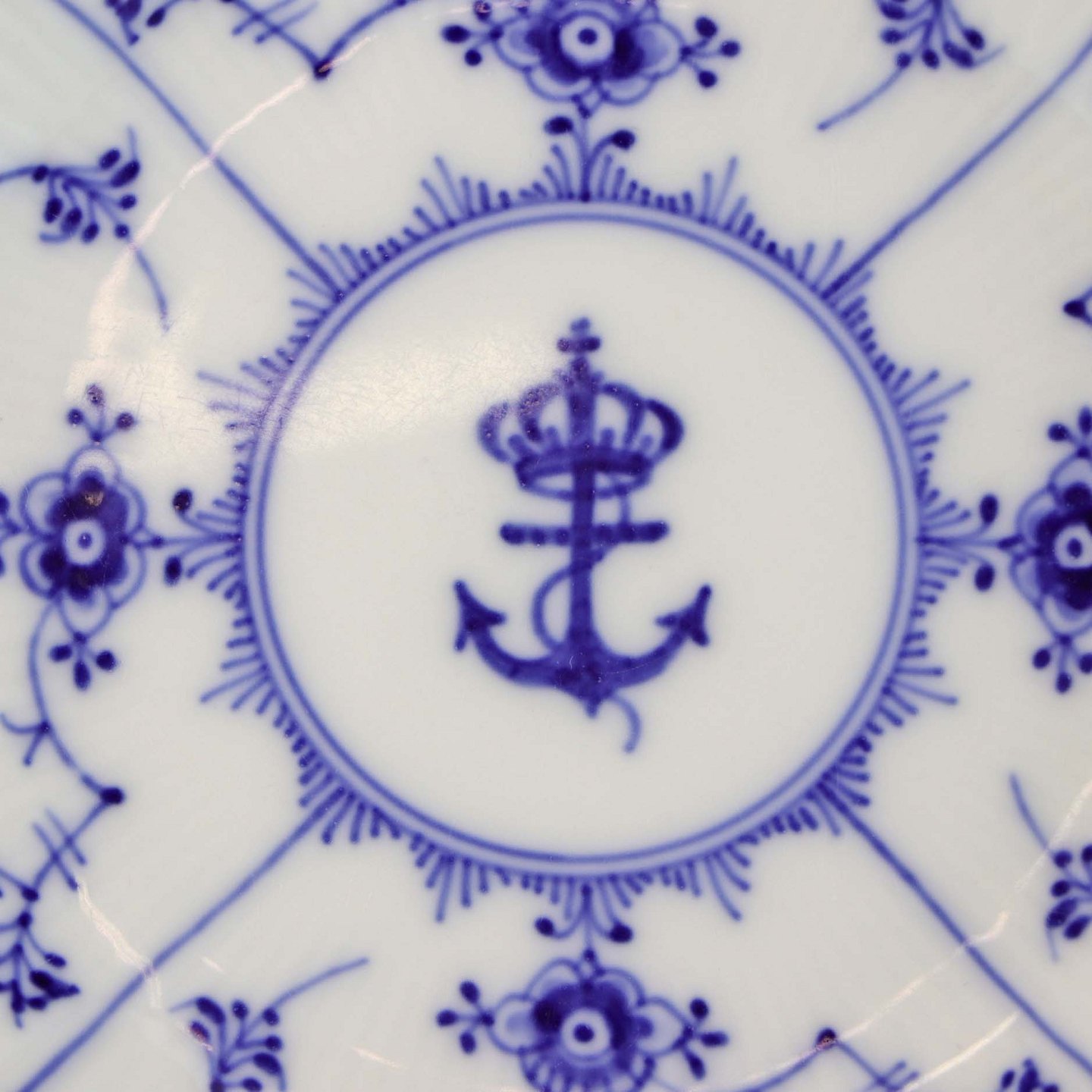 Kongelig sidetallerken i porcelæn med motiv af anker og krone fra stellet Musselmalet Riflet Hotelporcelæn nr. 1/2017