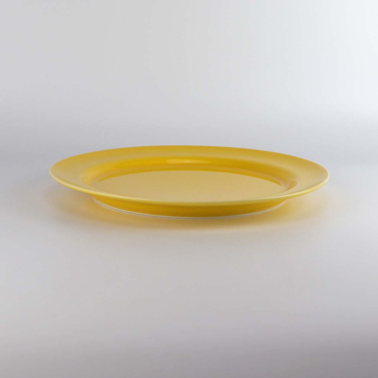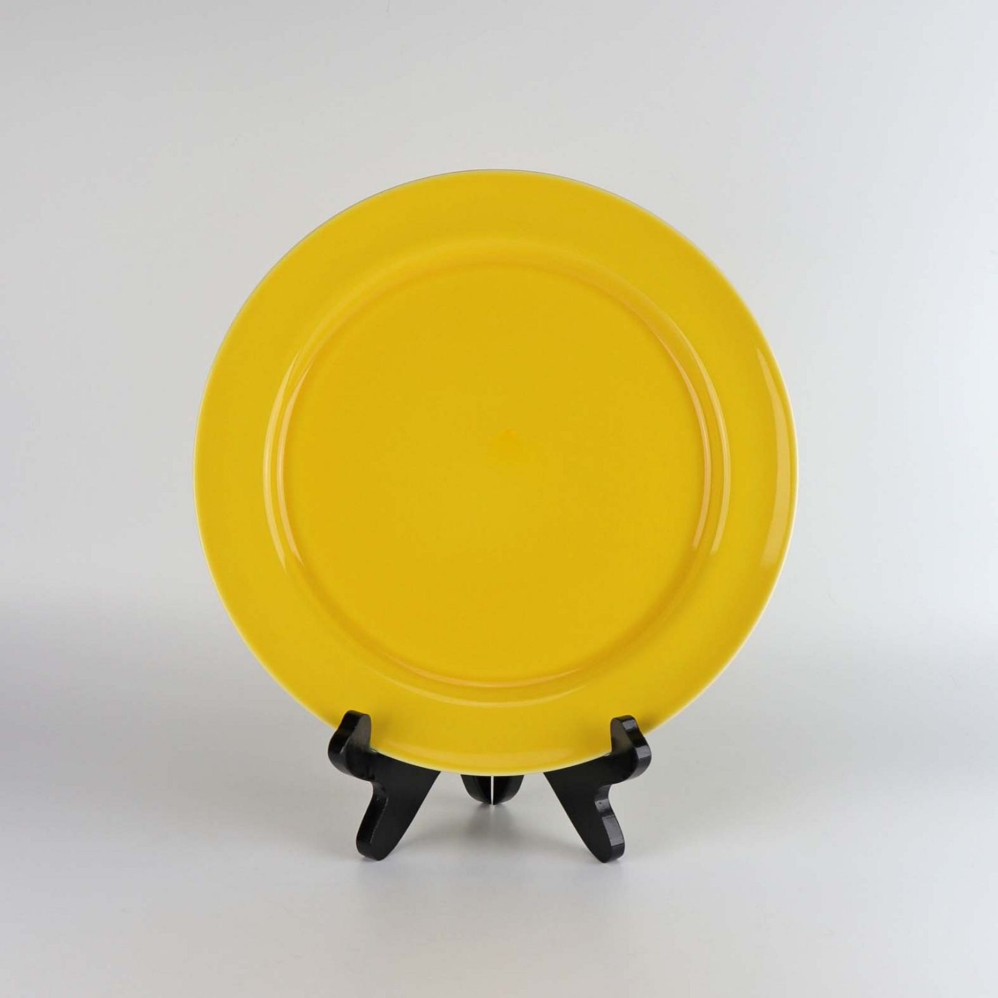 Flad tallerken af porcelæn med glansfuld gult glasur