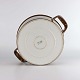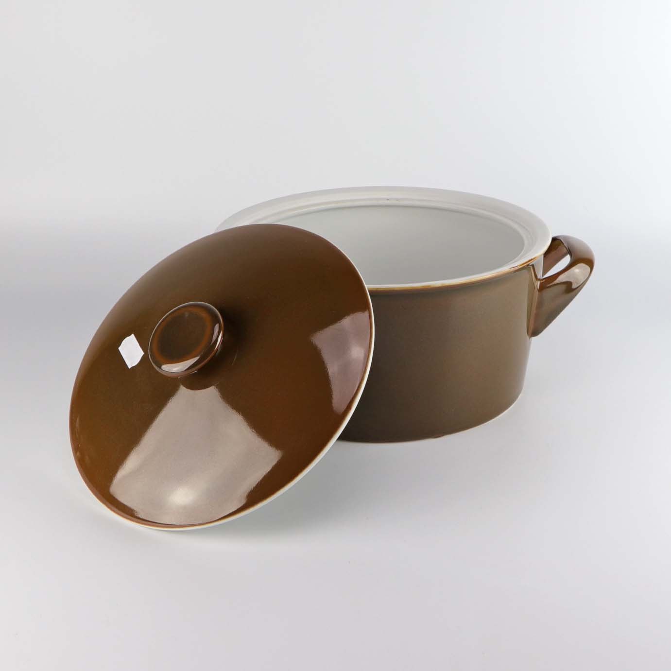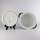 Stel i hvidt porcelæn med brun glasur på ydersiden.