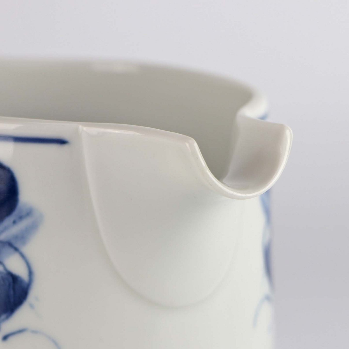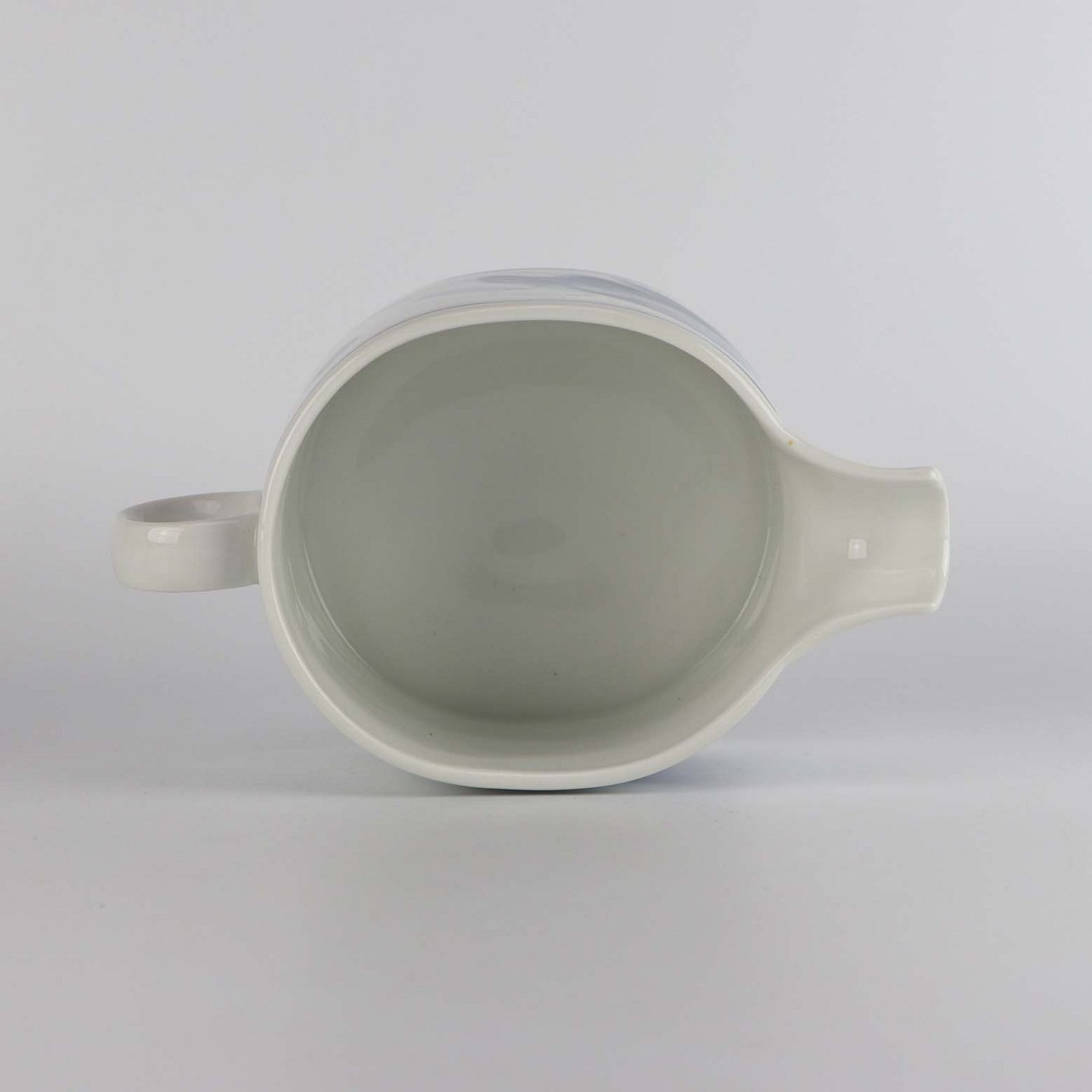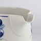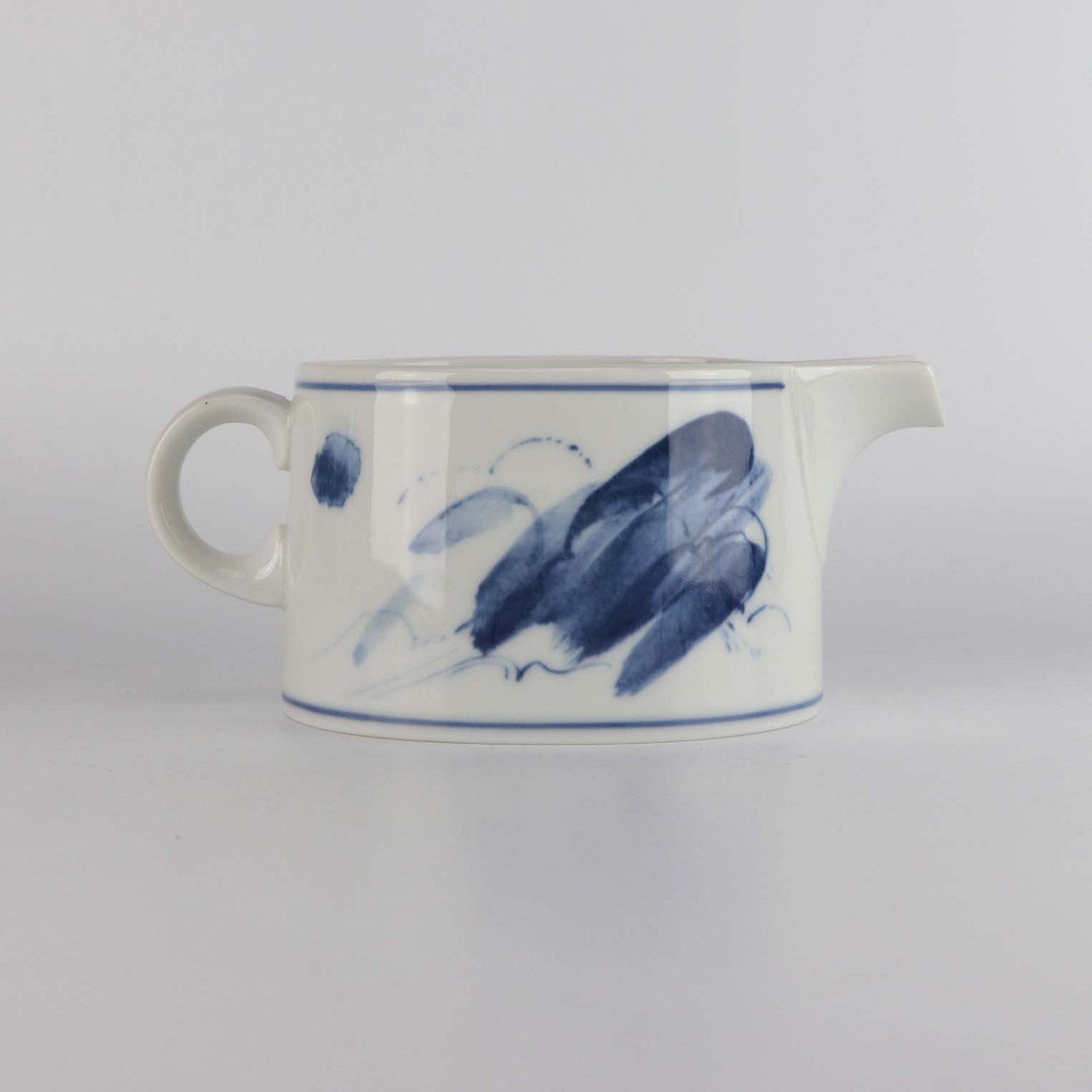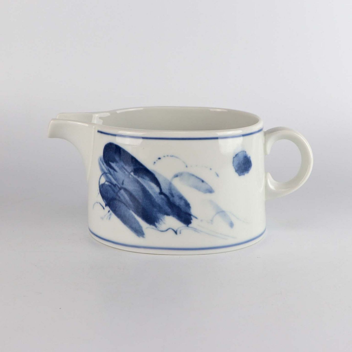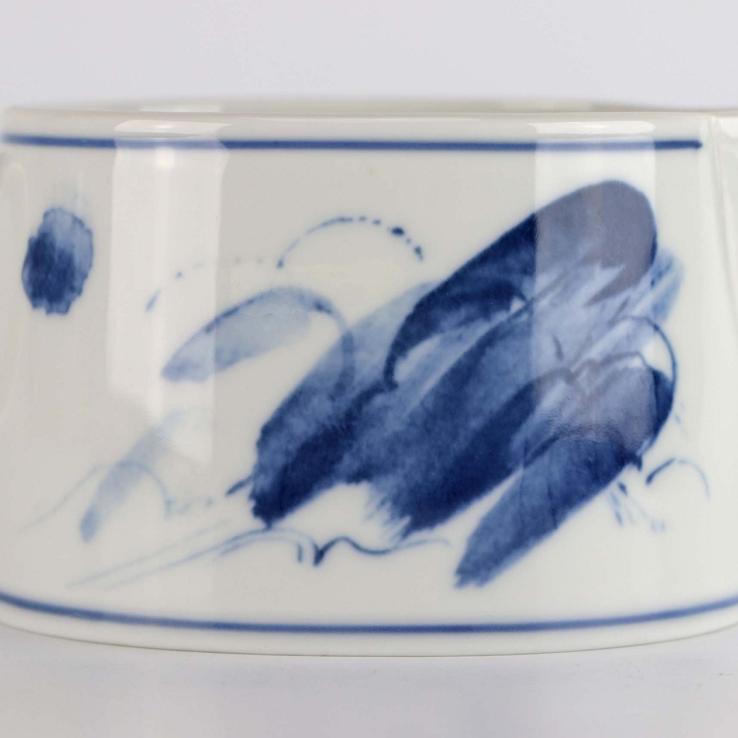 Stel i glat hvidt porcelæn med abstrakt mønster i blå nuancer