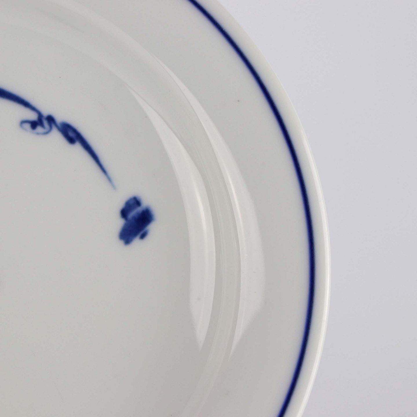 Kagetallerken i glat hvidt porcelæn med abstrakt mønster i blå nuancer
