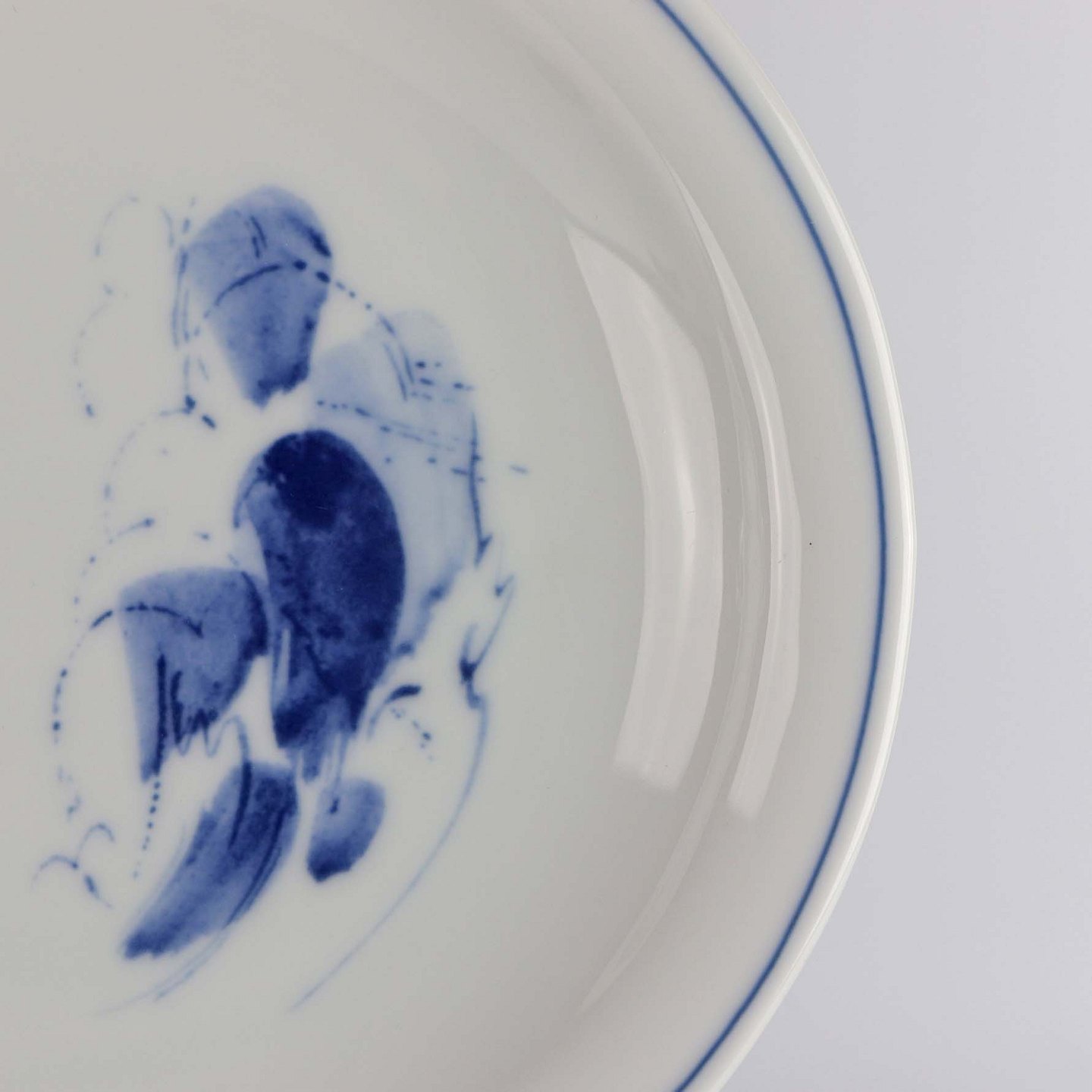 Stel i glat hvidt porcelæn med abstrakt mønster i blå nuancer