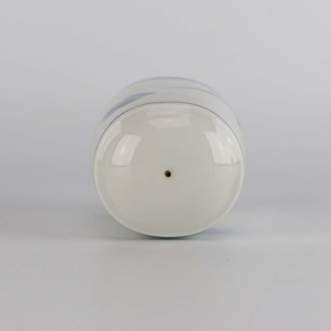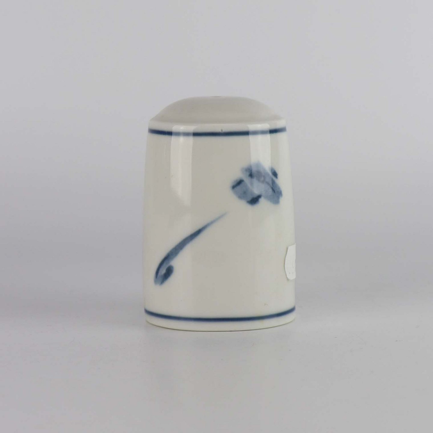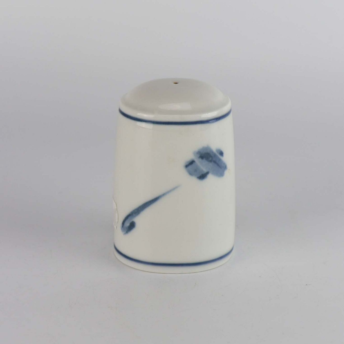 Stel i glat hvidt porcelæn med abstrakt mønster i blå nuancer