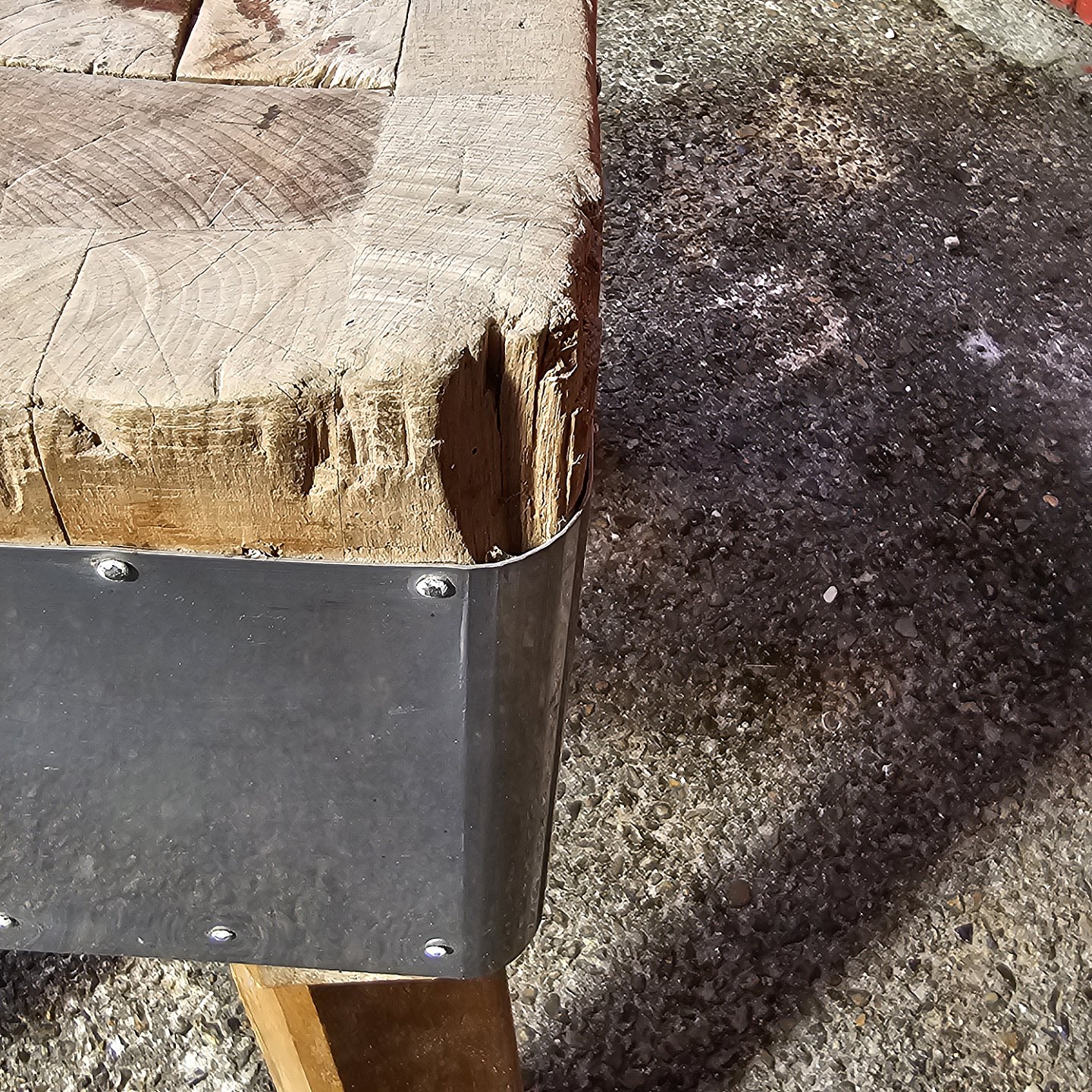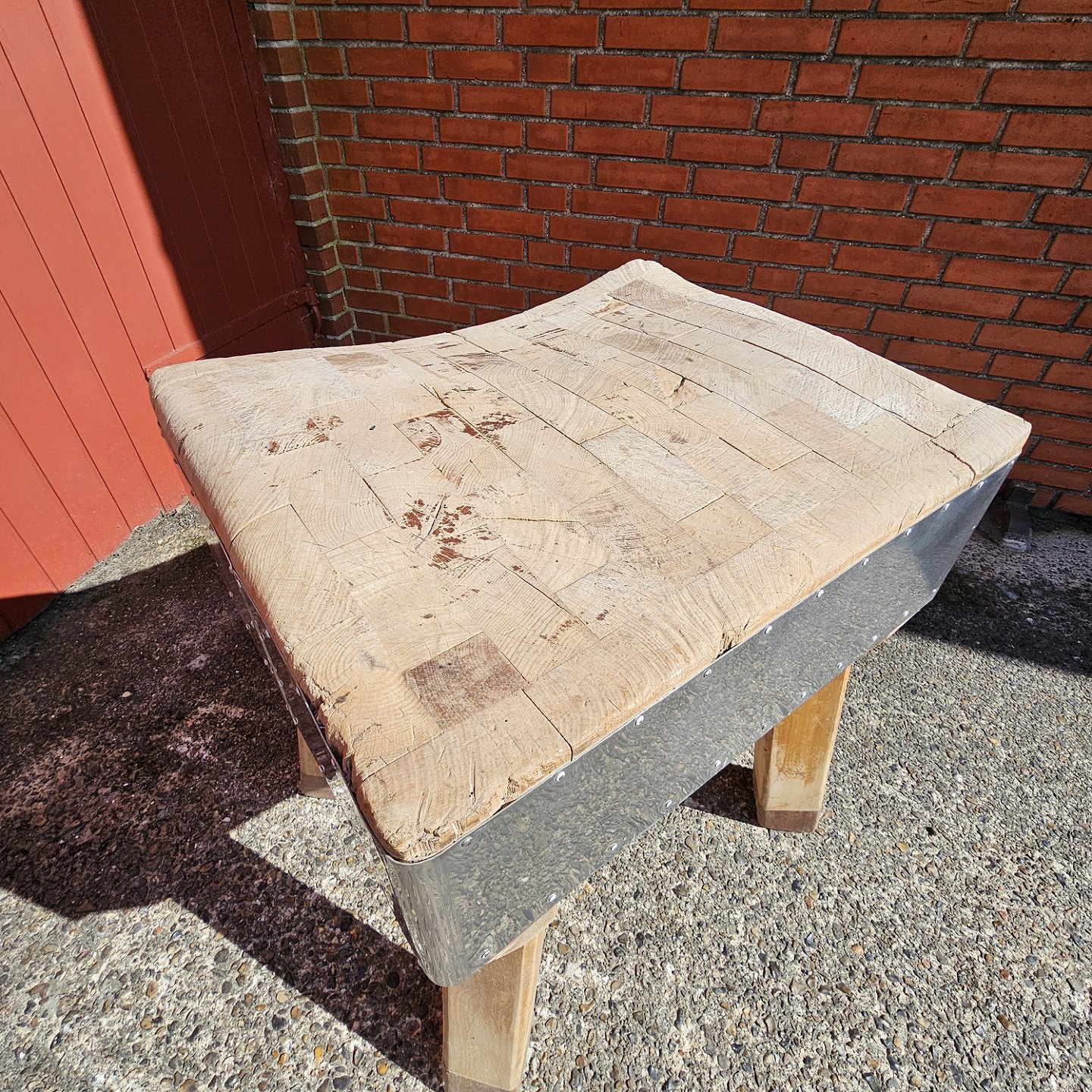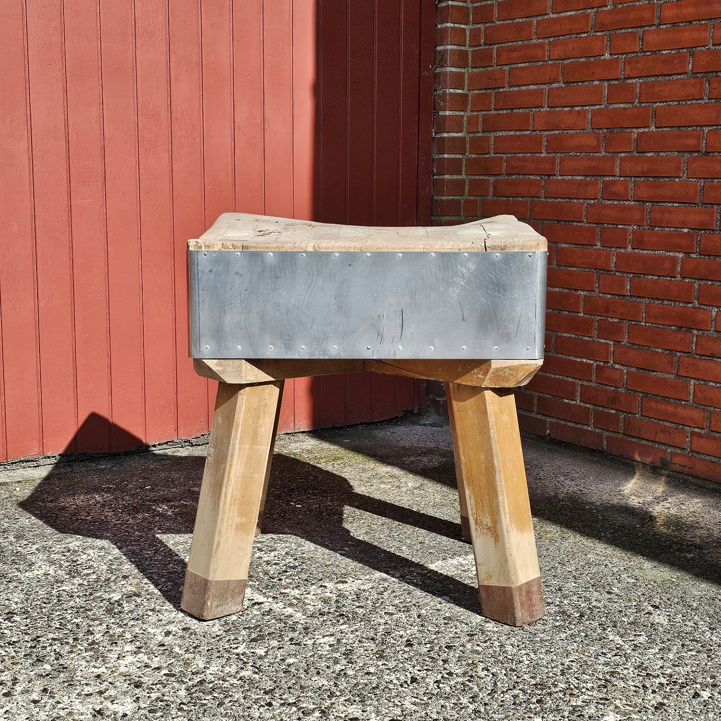 Huggeblok sat sammen af stave af bøgetræ. På siden omkranset af stålplade. Hårdttræ sko på ben.