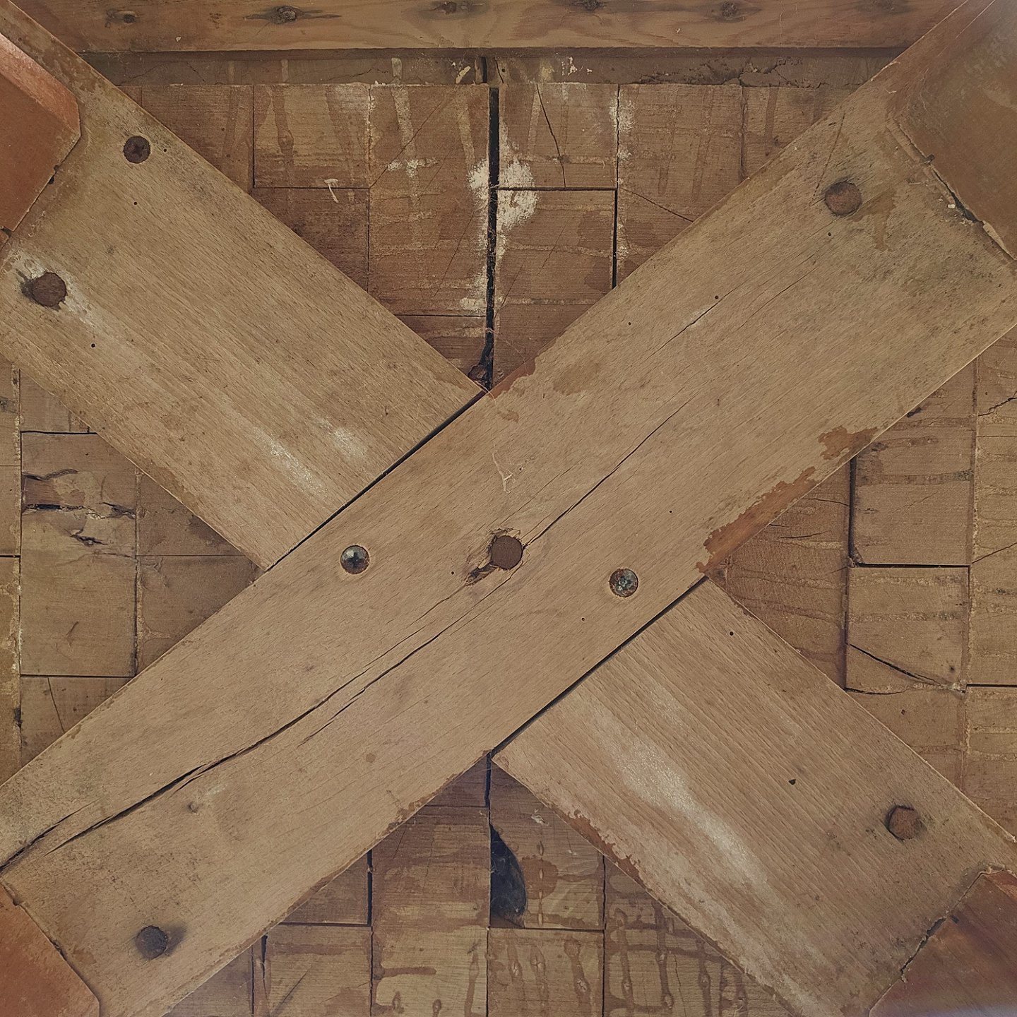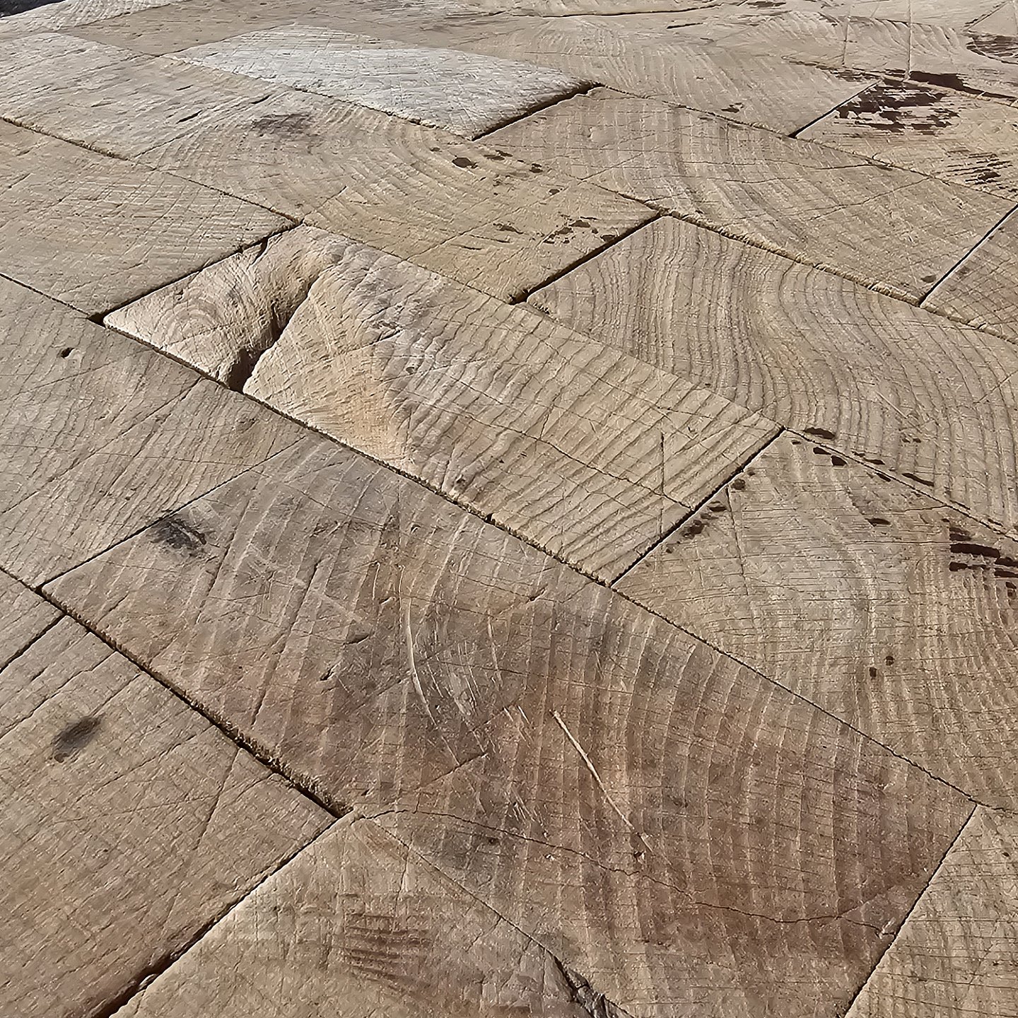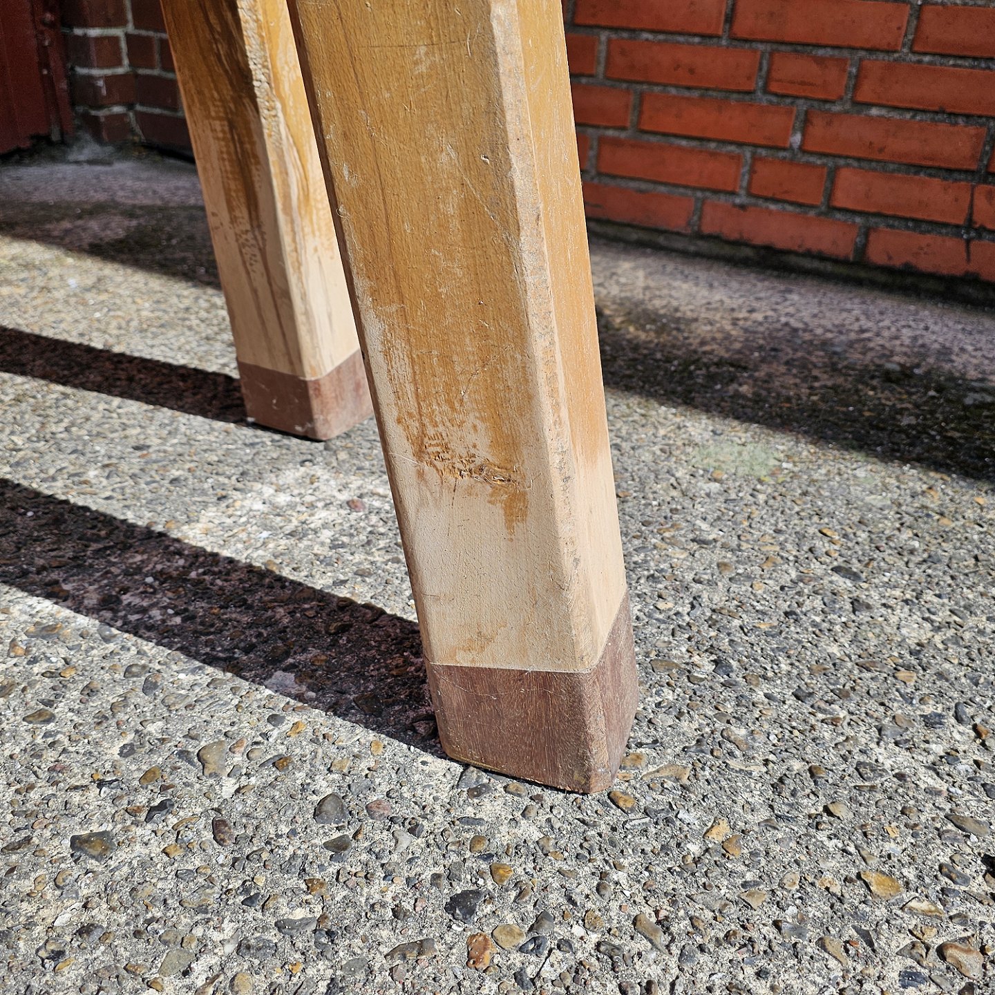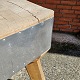Huggeblok sat sammen af stave af bøgetræ. På siden omkranset af stålplade. Hårdttræ sko på ben.