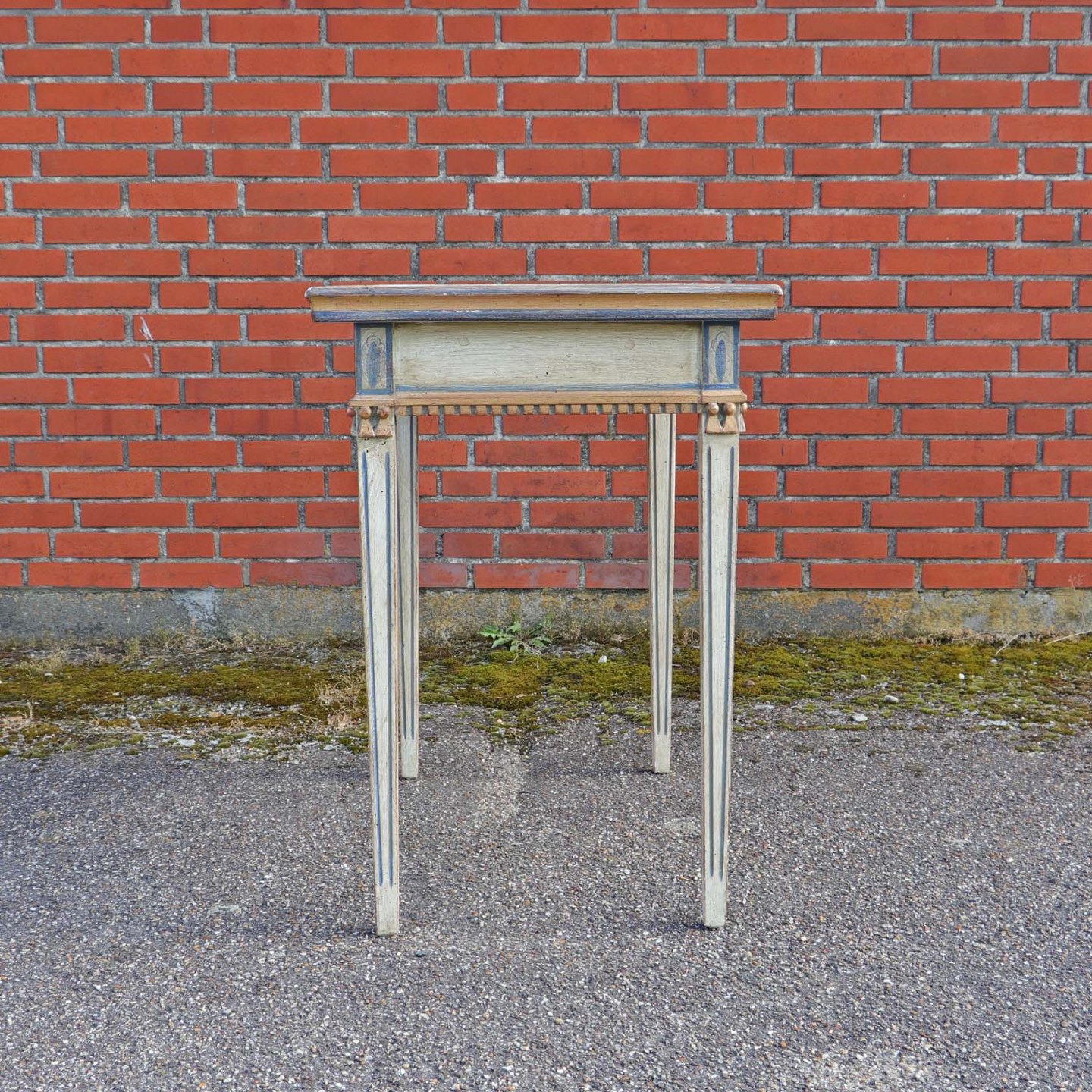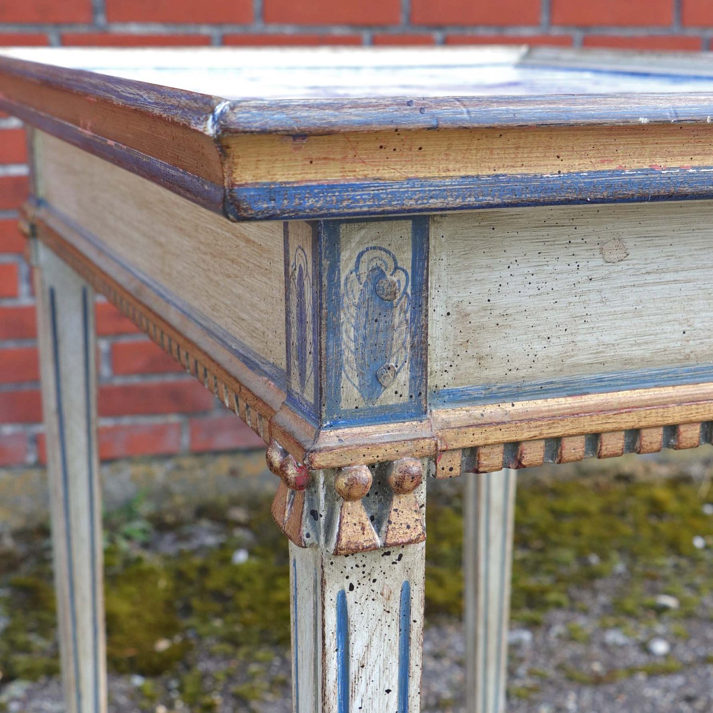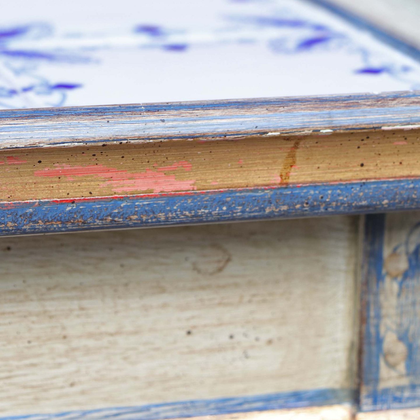 Ældre kakkelbord i blåt og hvidmalet træ med Hollandske kakler i hvidt porcelæn med blå mønster.