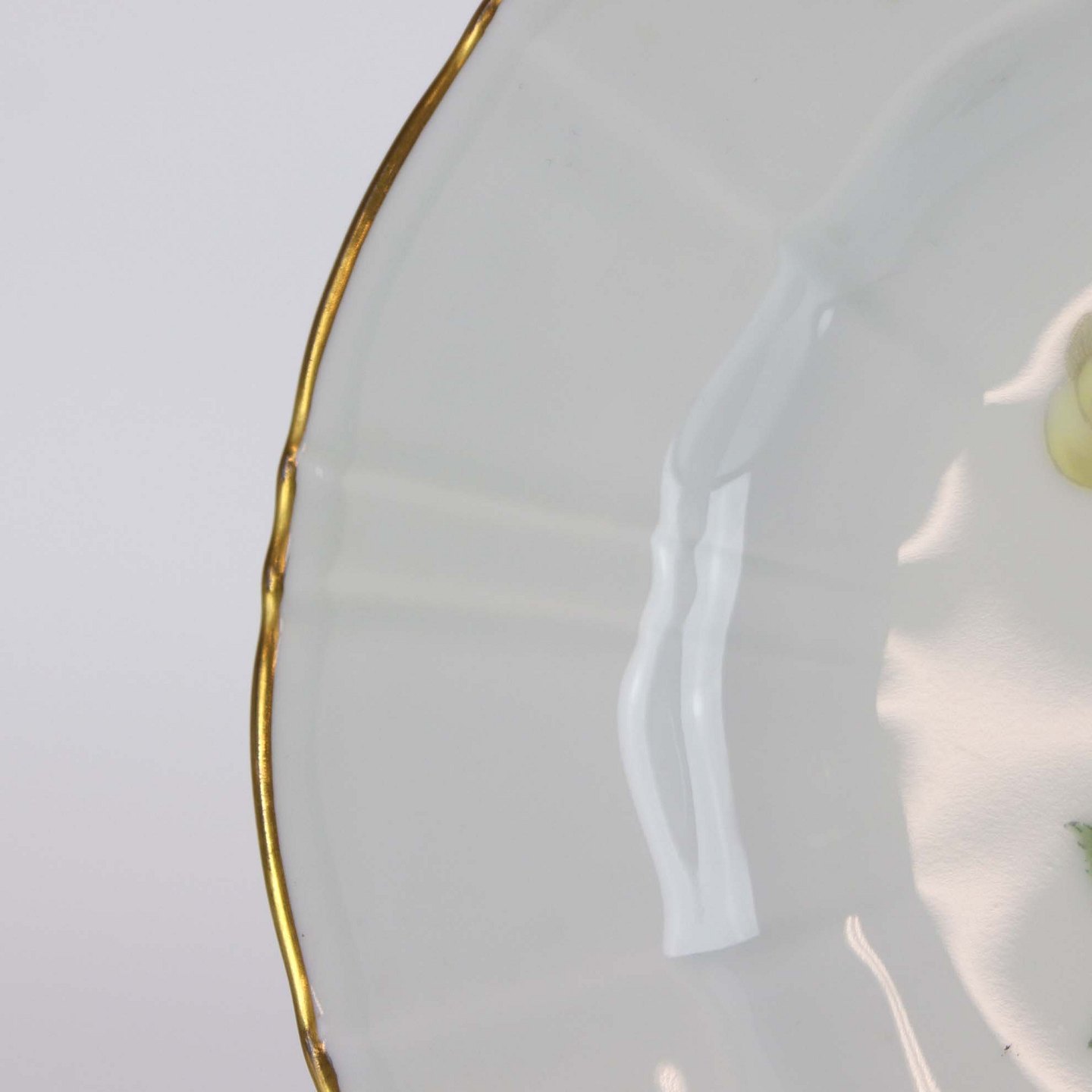 Service i glat hvidt porcelæn med lige knækkede kanter dekoreret med gule blomster og gylden kant