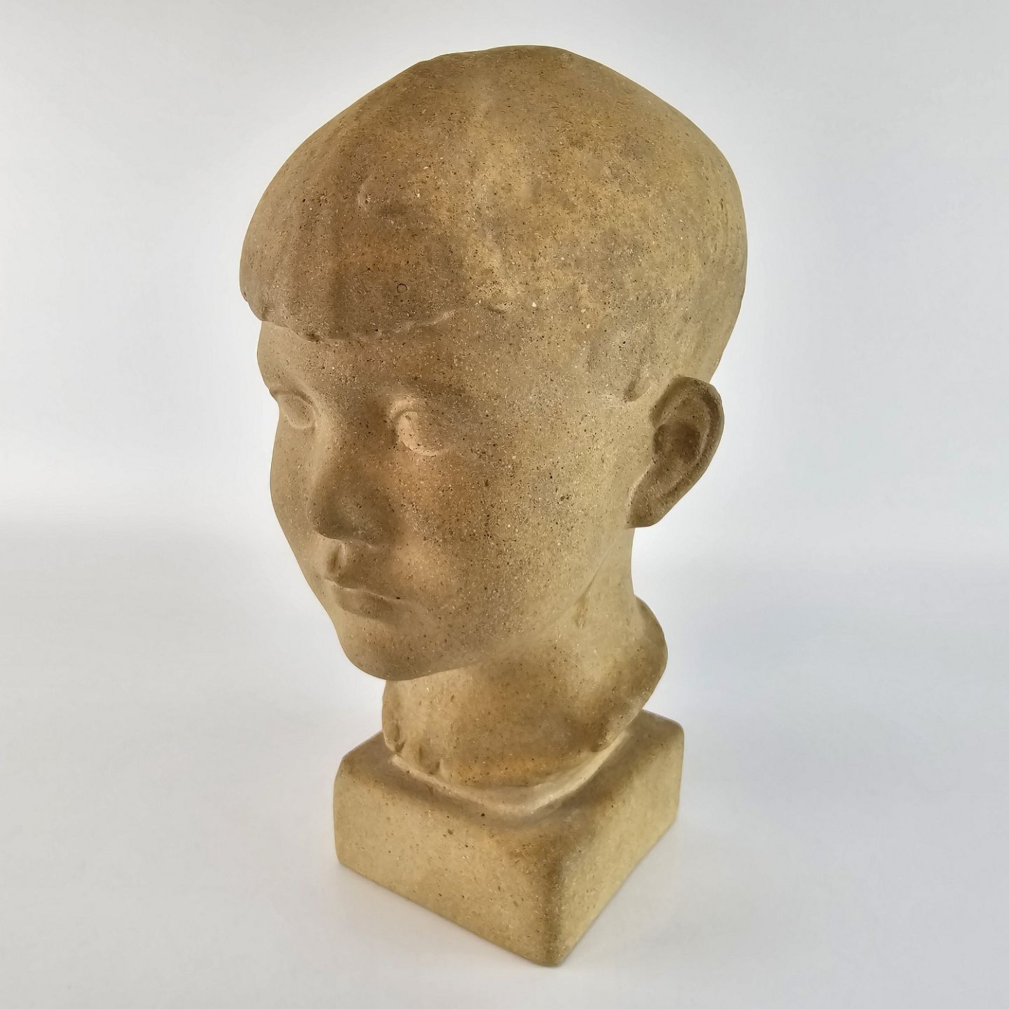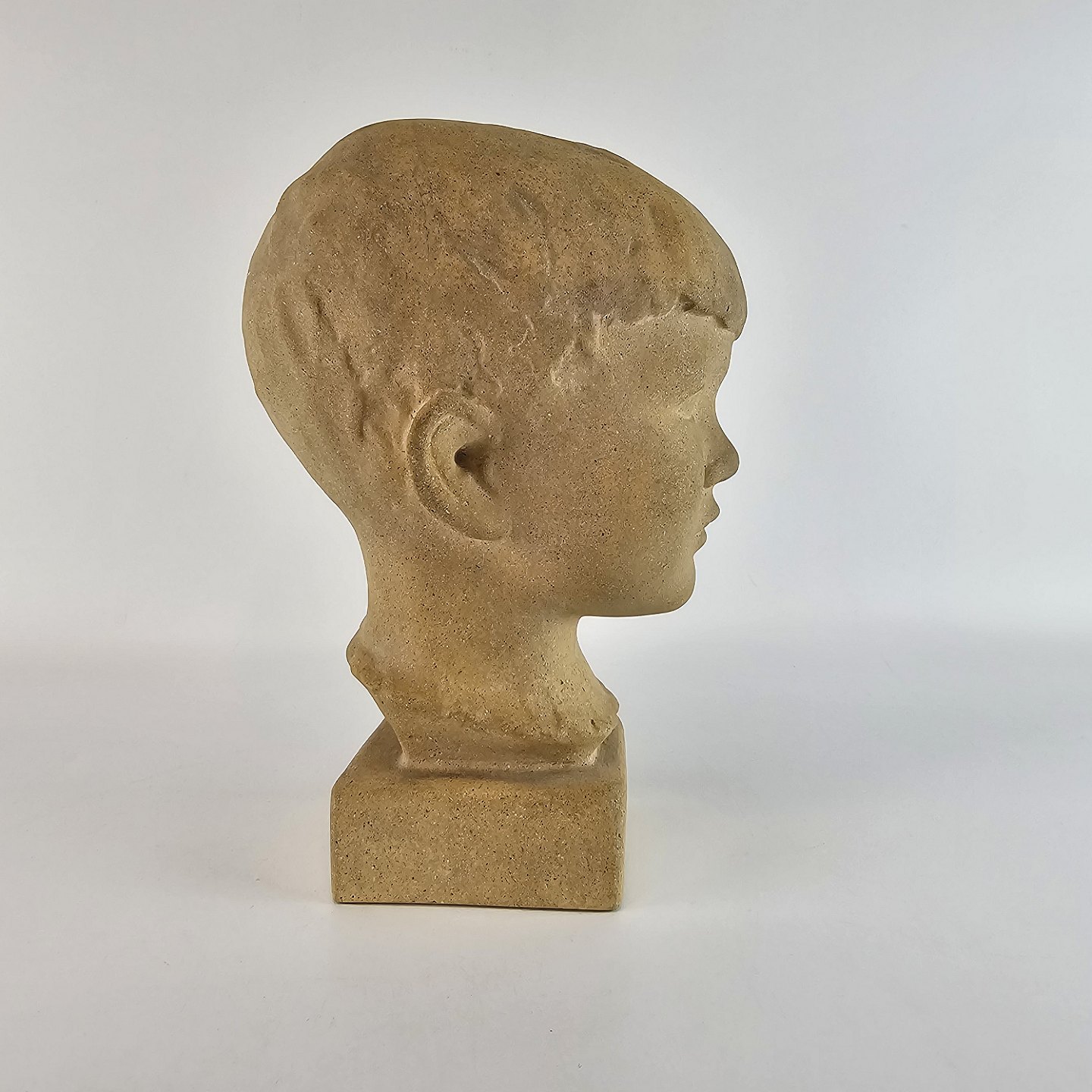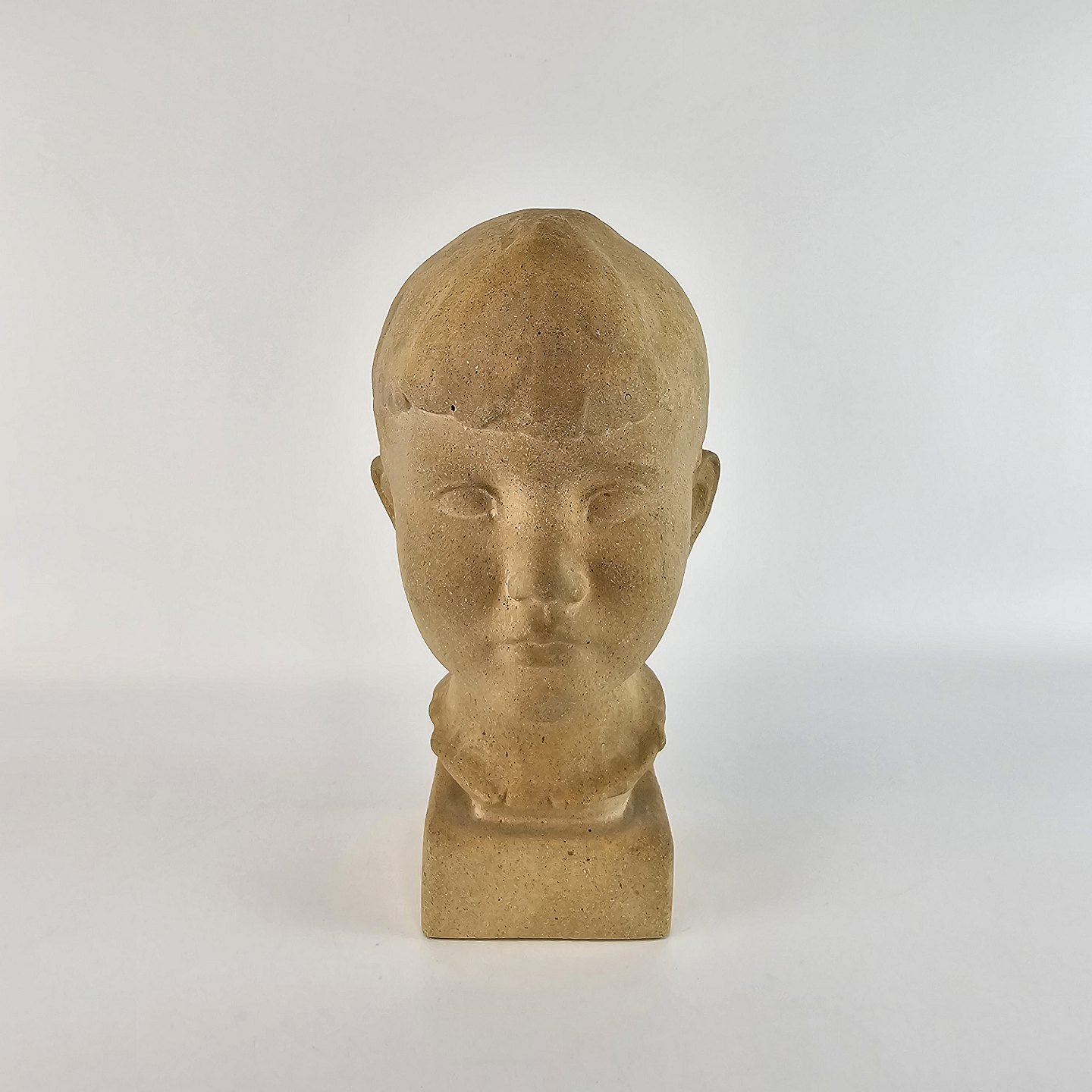Buste af sandsten formet som et barnehoved. Står på kvadratisk fod