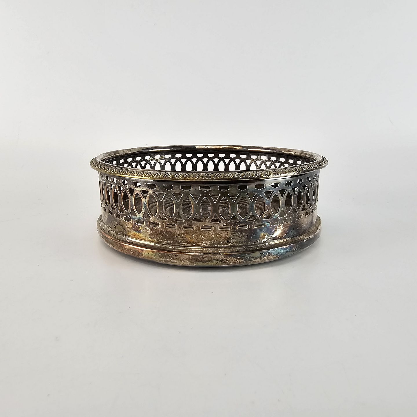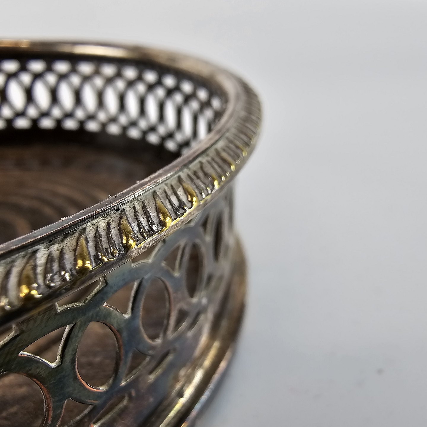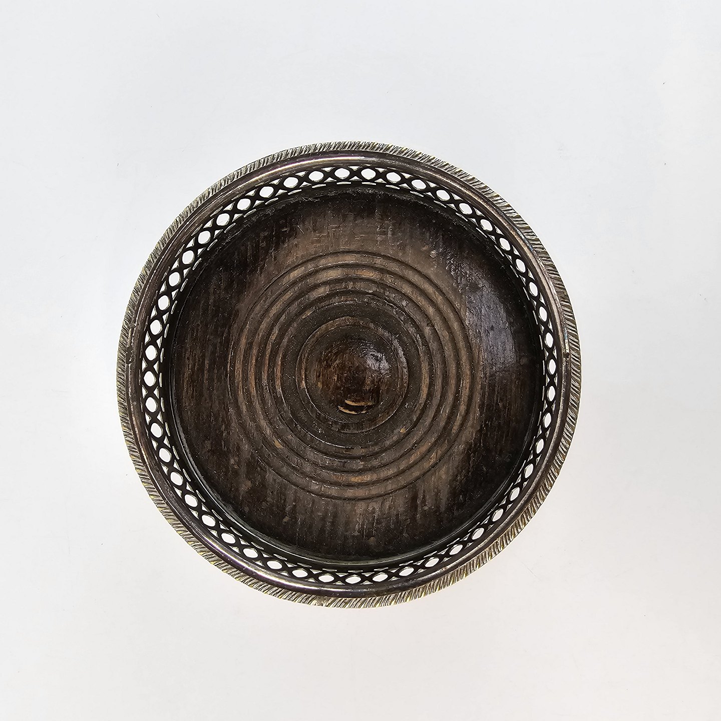 Kurv belagt med sølv og med bund af træ. Bordskåner til rødvinsflasker