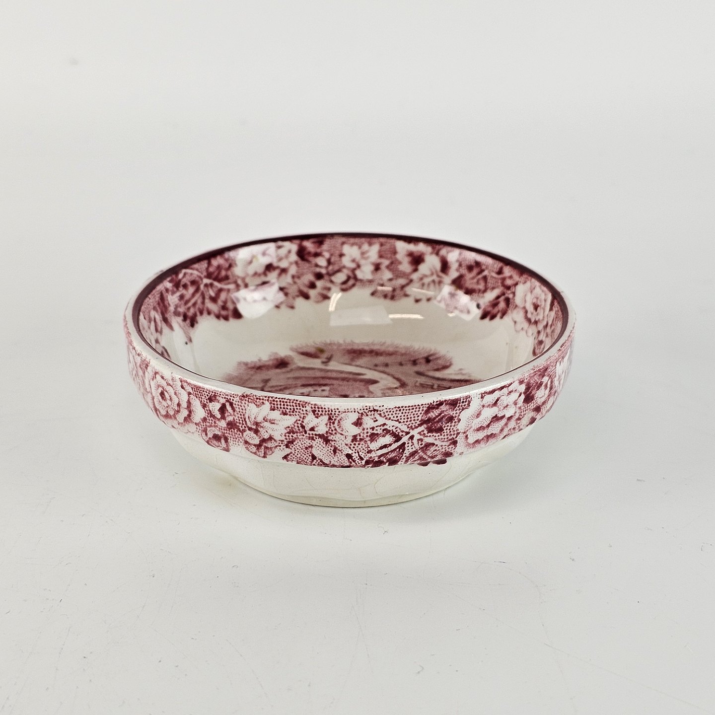Rød Paris er af engelsk fajance dekoreret med forskellige landskaber og blomster i kanten, alt i forskellige røde nuancer