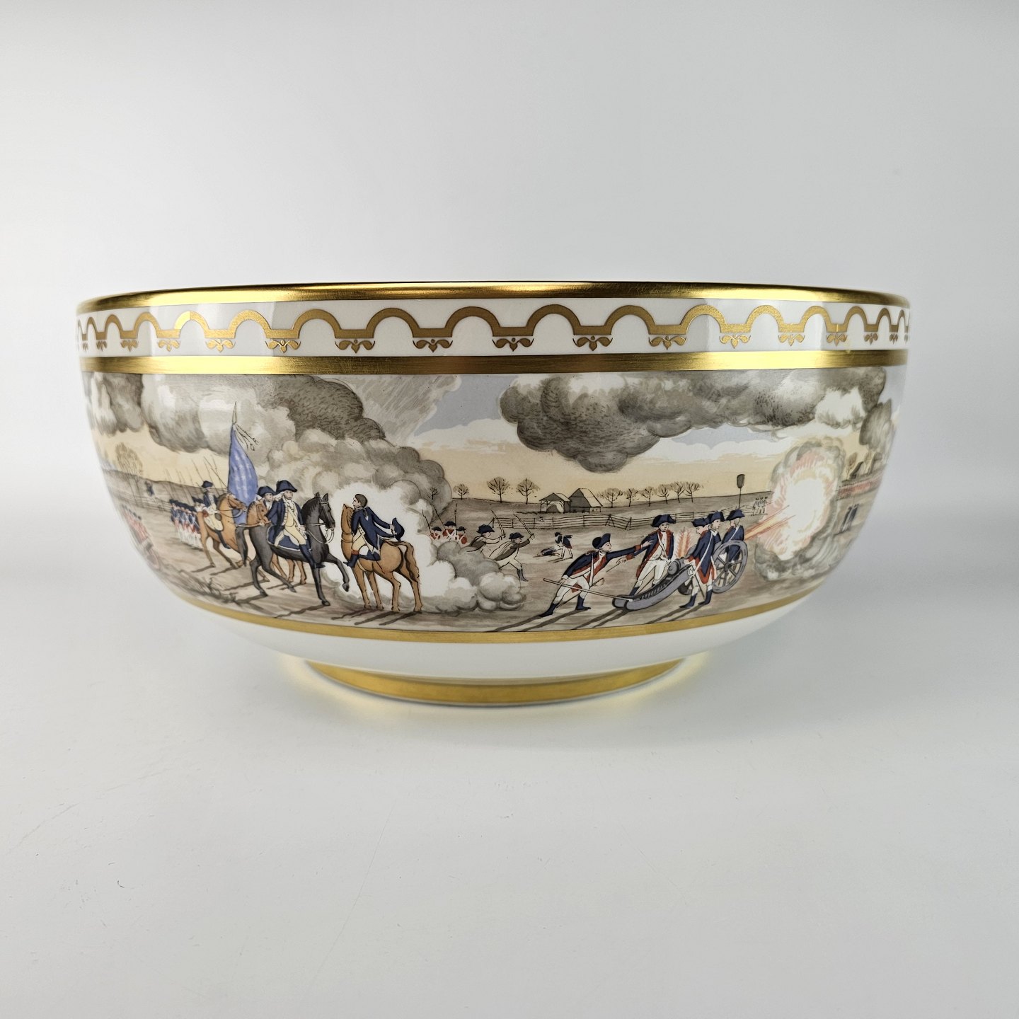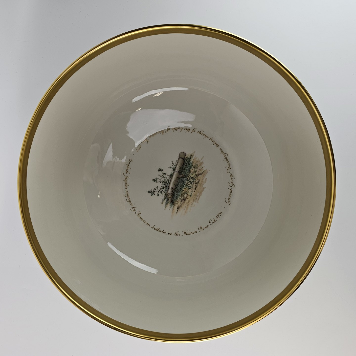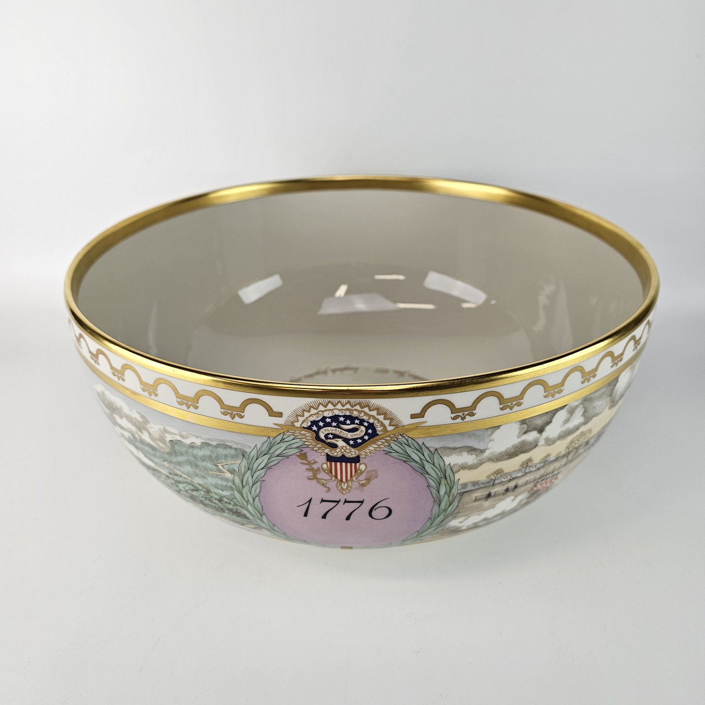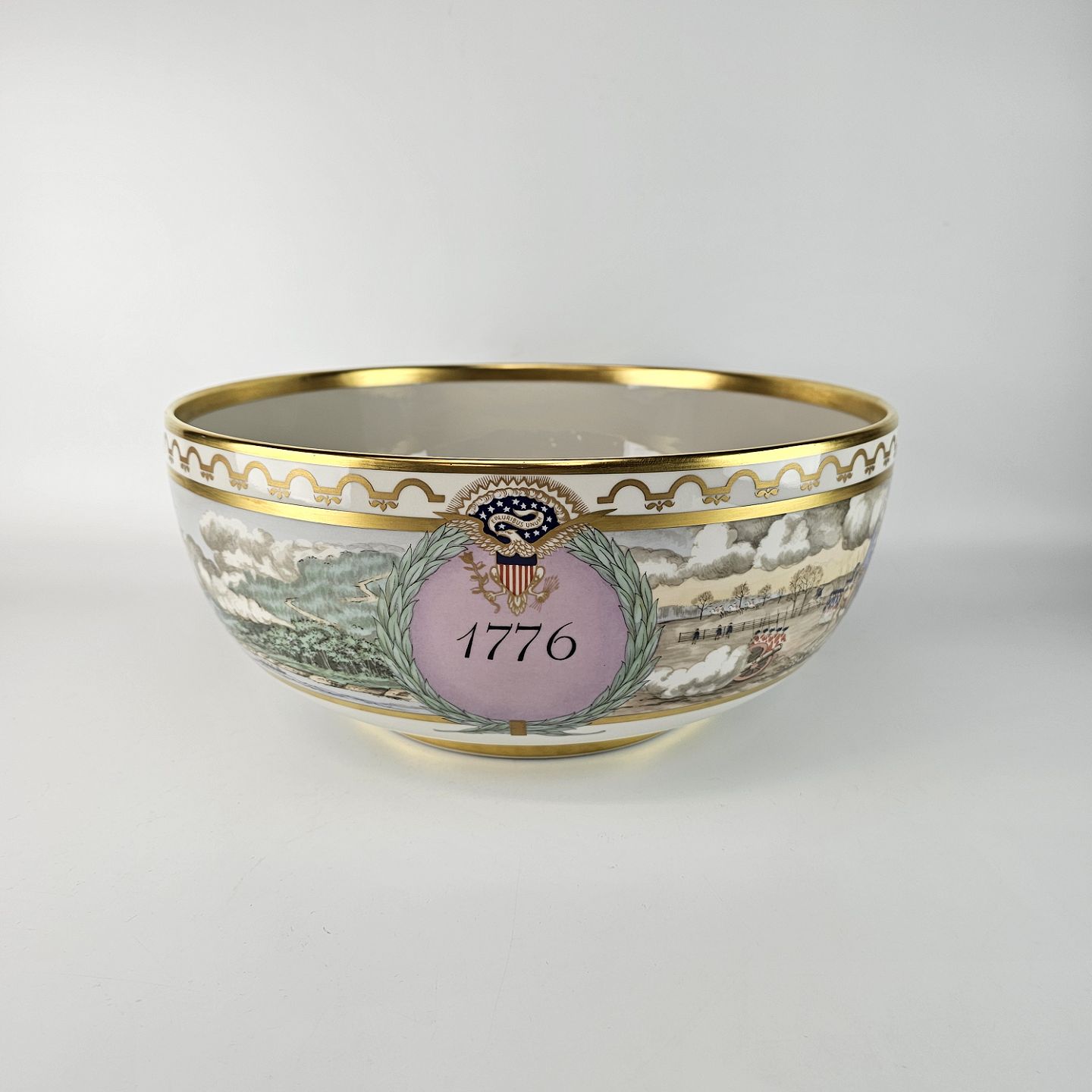Skål i porcelæn med gulddekoration og motiv fra den amerikanske uafhængighedskrig. 200 års jubilæums bowle 1776-1976. Nr. 307/2500