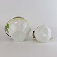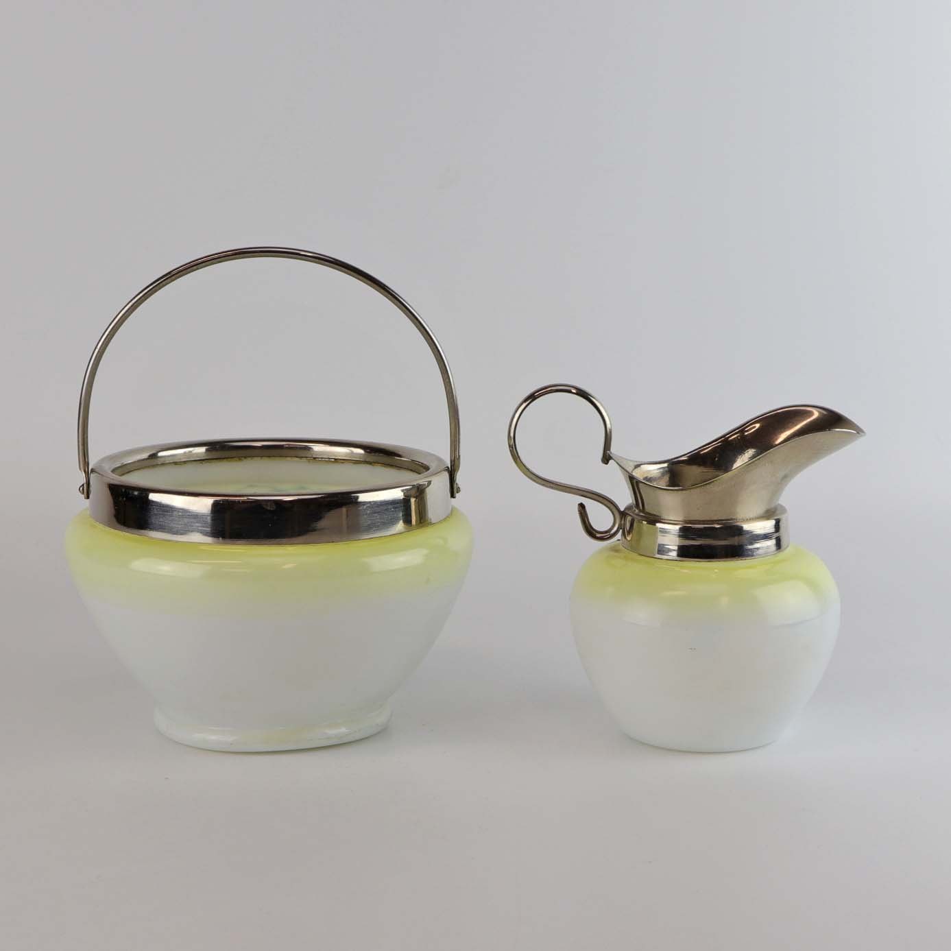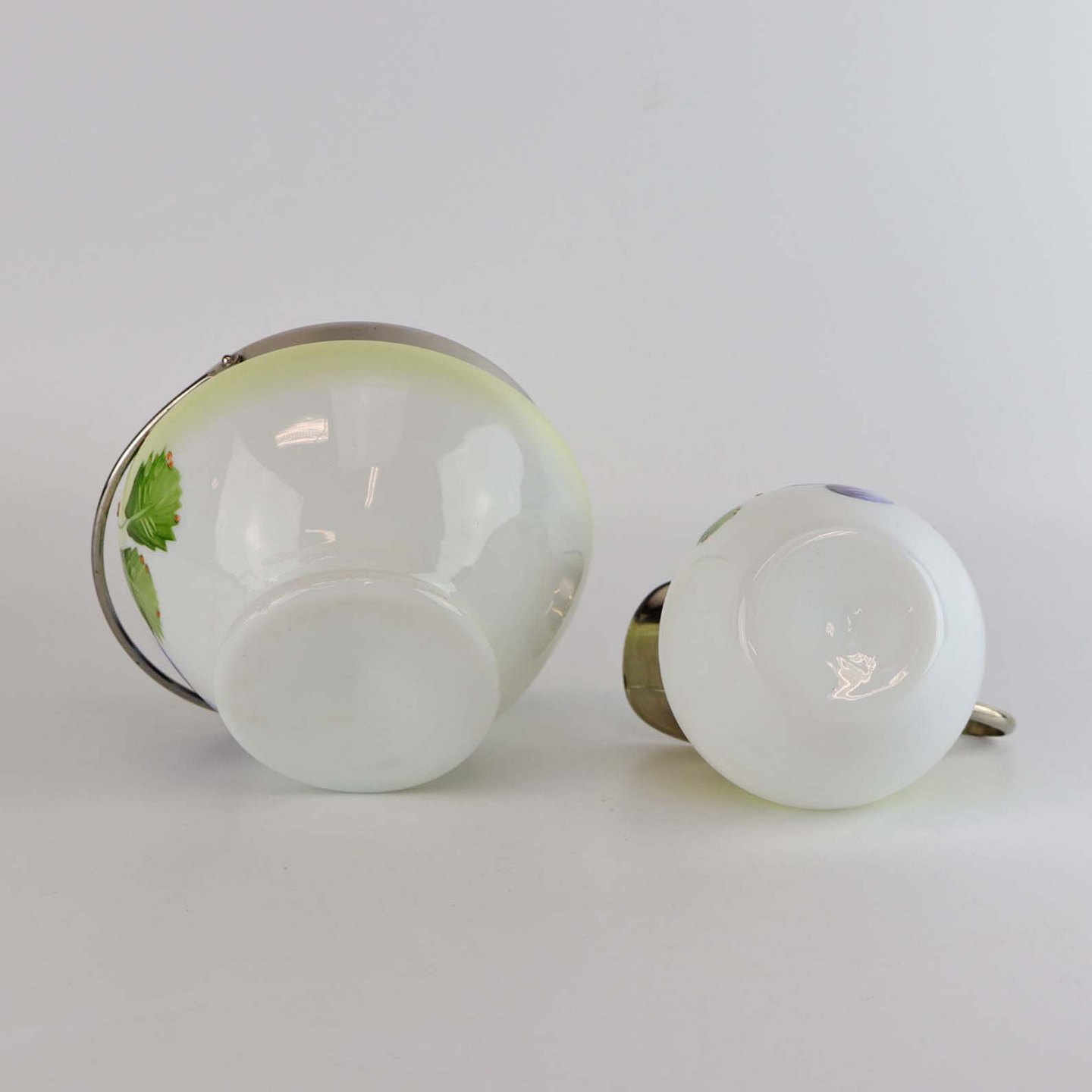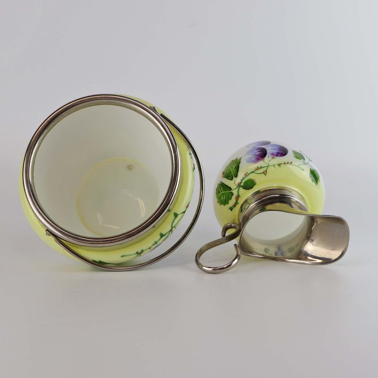 Sukkerskål og flødekande i malet opalineglas med malet motiv af mørklilla vindruesklase. Sættet har monteret hanke af pletsølv.
