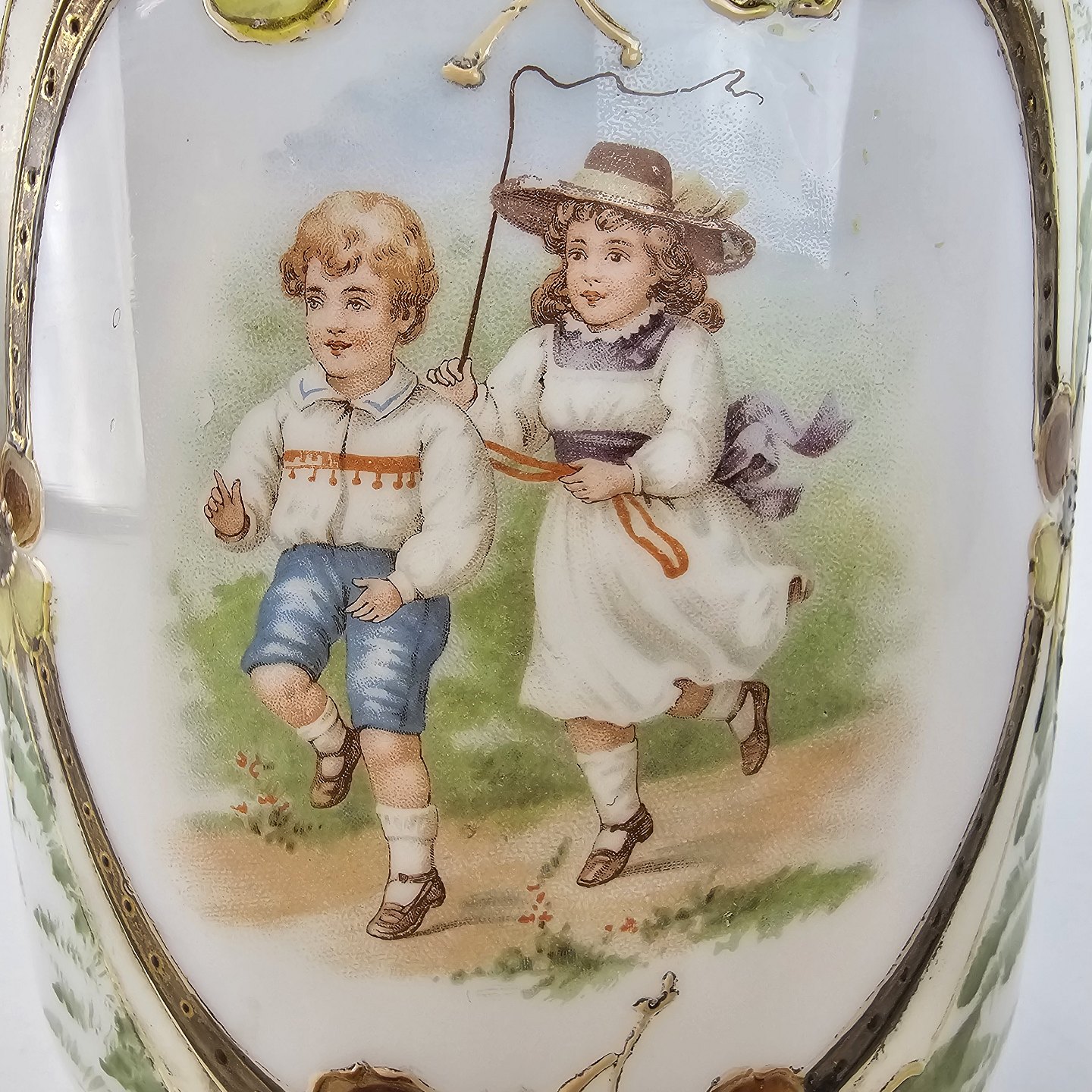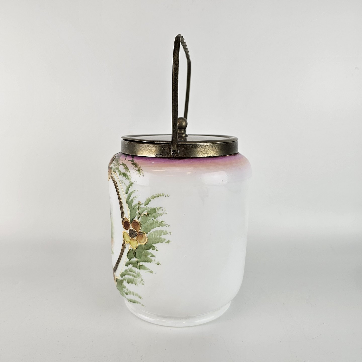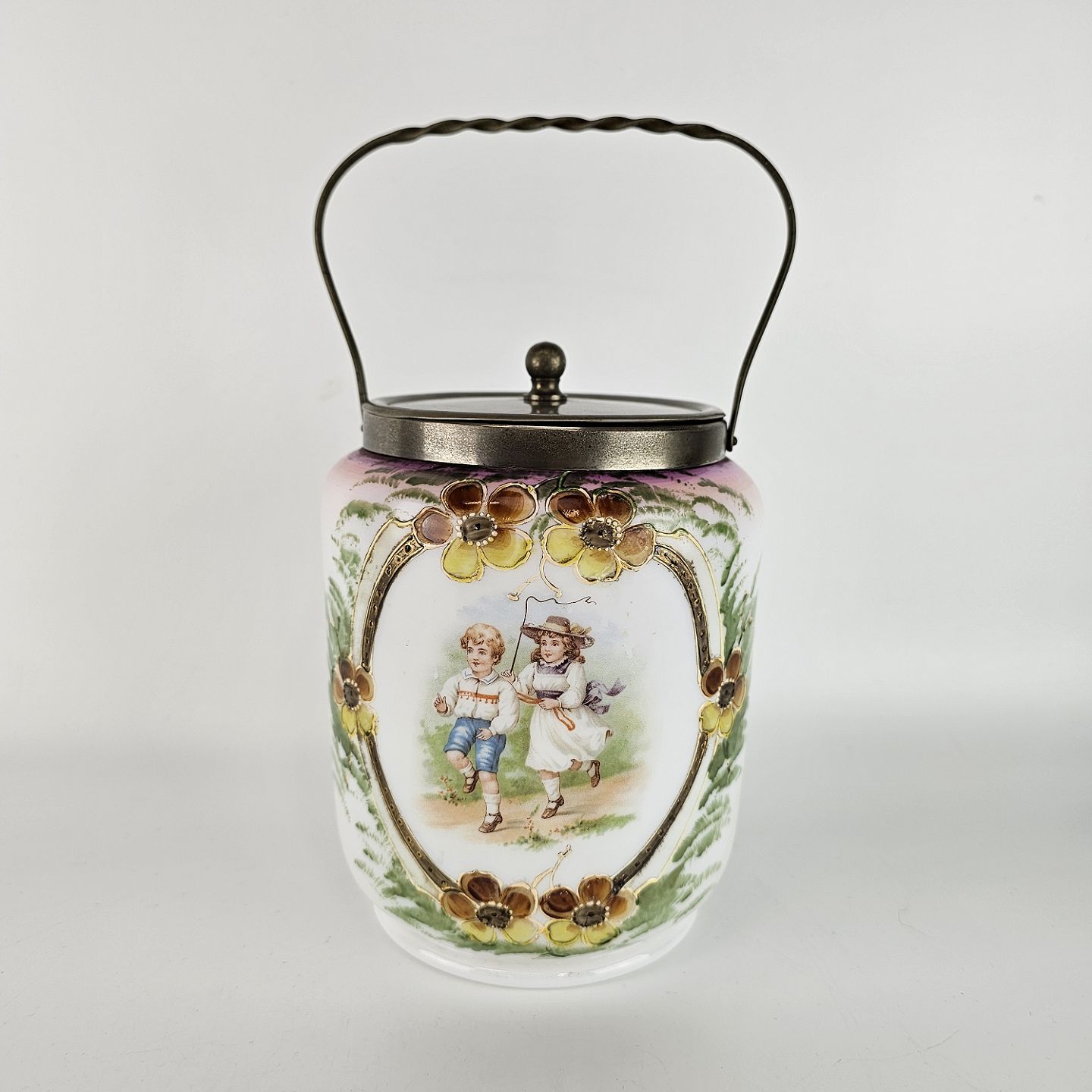 Håndmalet opalglas krukke med låg og håndtag, dekoreret med motiver af blomster og legende børn. Låg og hank lavet af metal