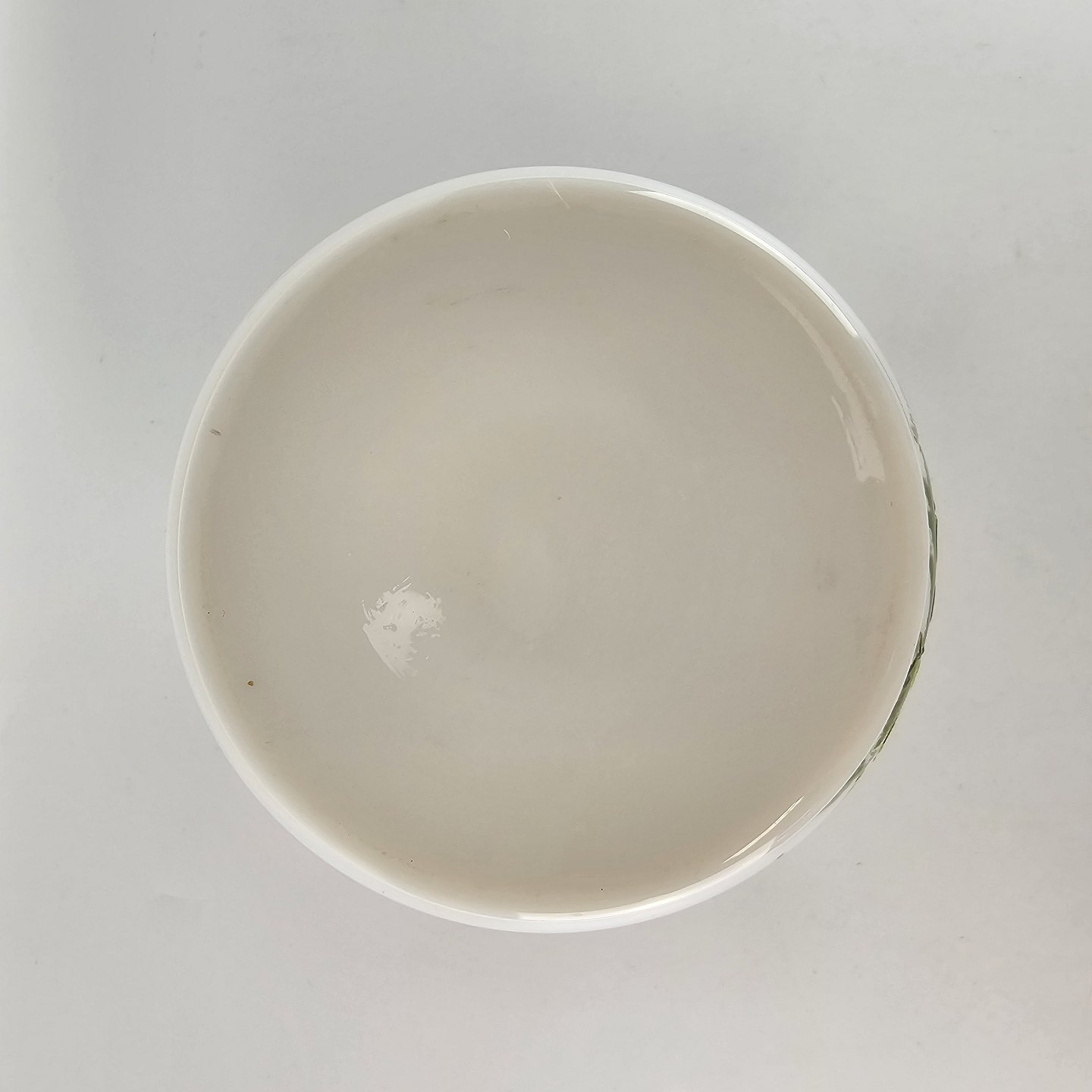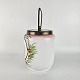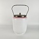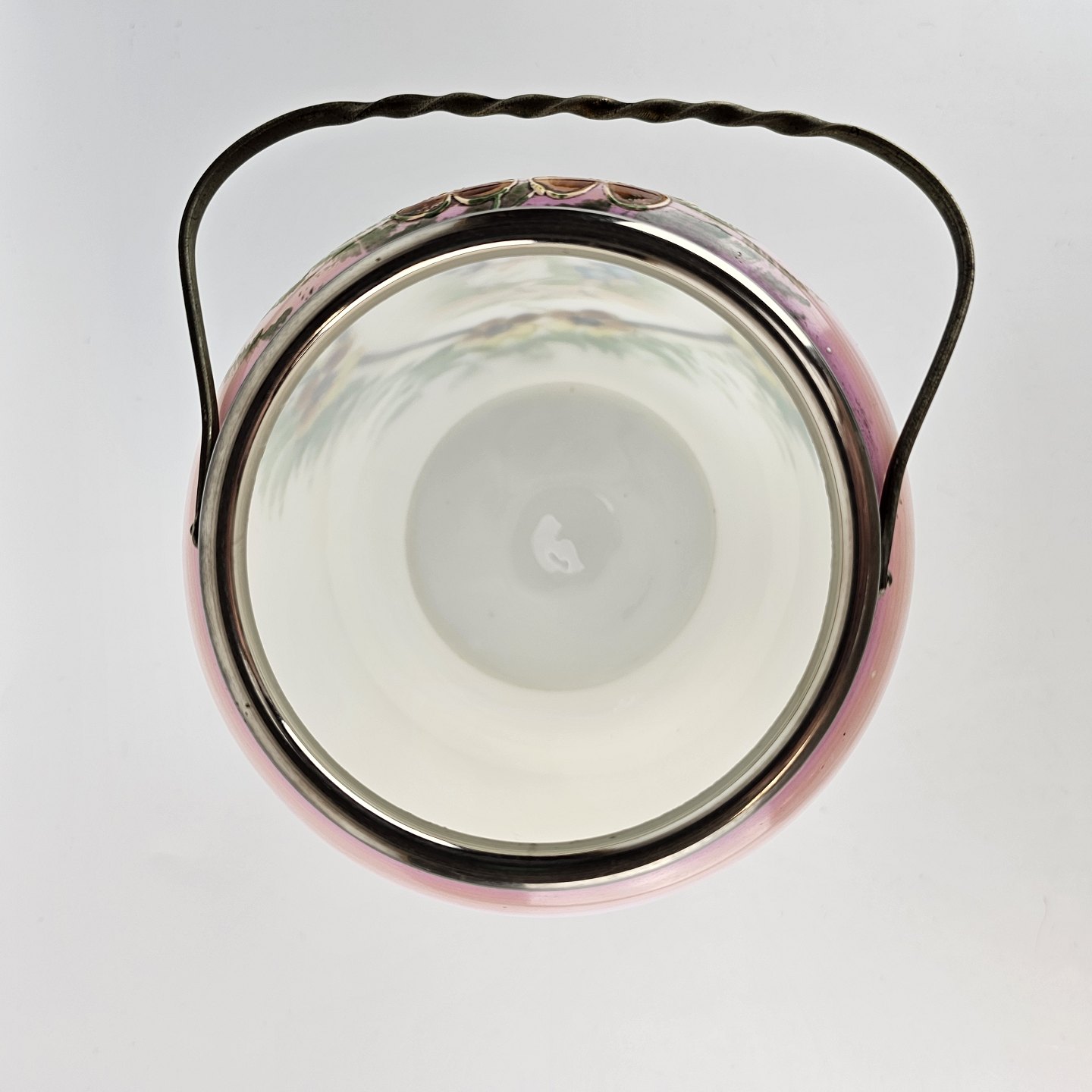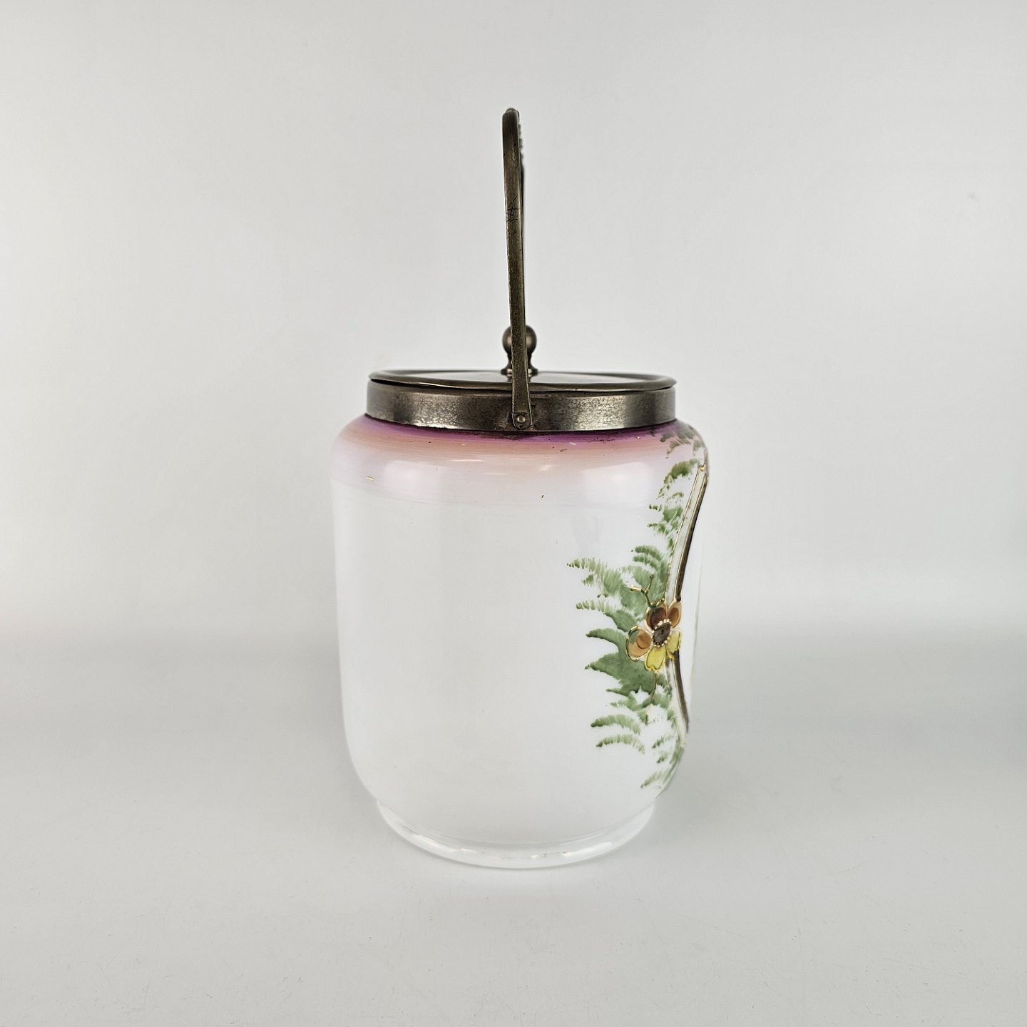 Håndmalet opalglas krukke med låg og håndtag, dekoreret med motiver af blomster og legende børn. Låg og hank lavet af metal