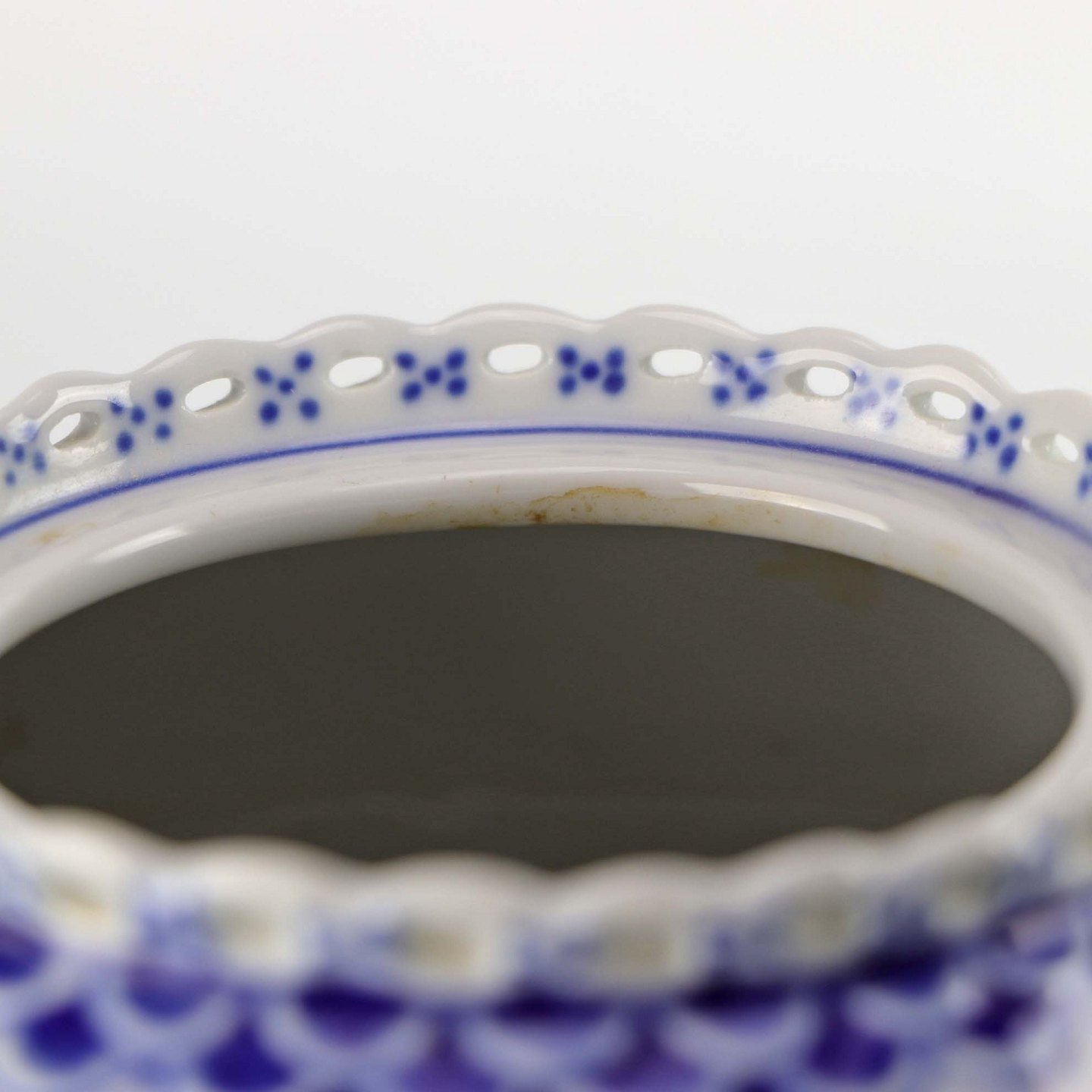 Stellet Musselmalet Helblonde er hvidt porcelæn dekoreret med blå blomster og mønstre. Øverst er porcelænet dekoreret med hulmønster.