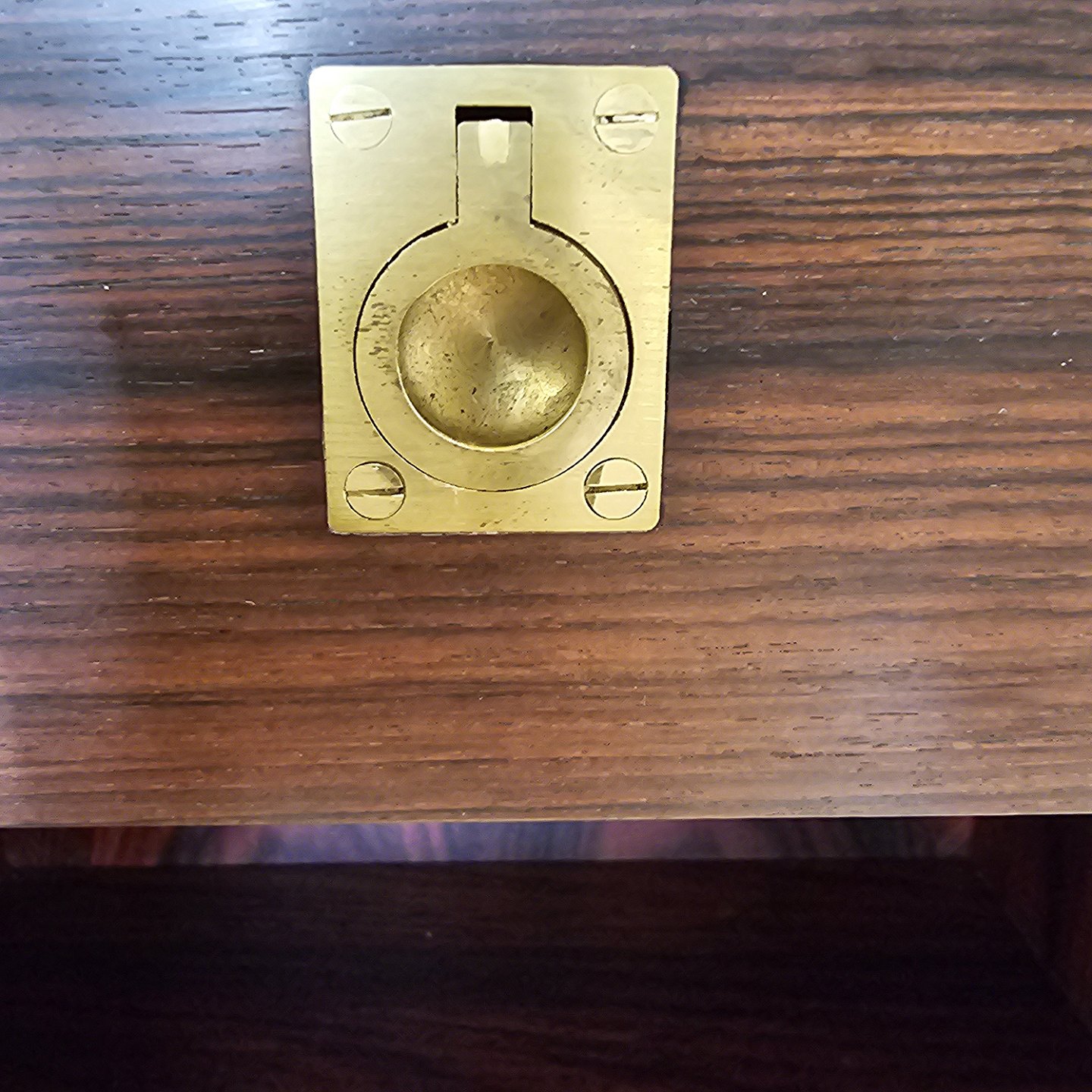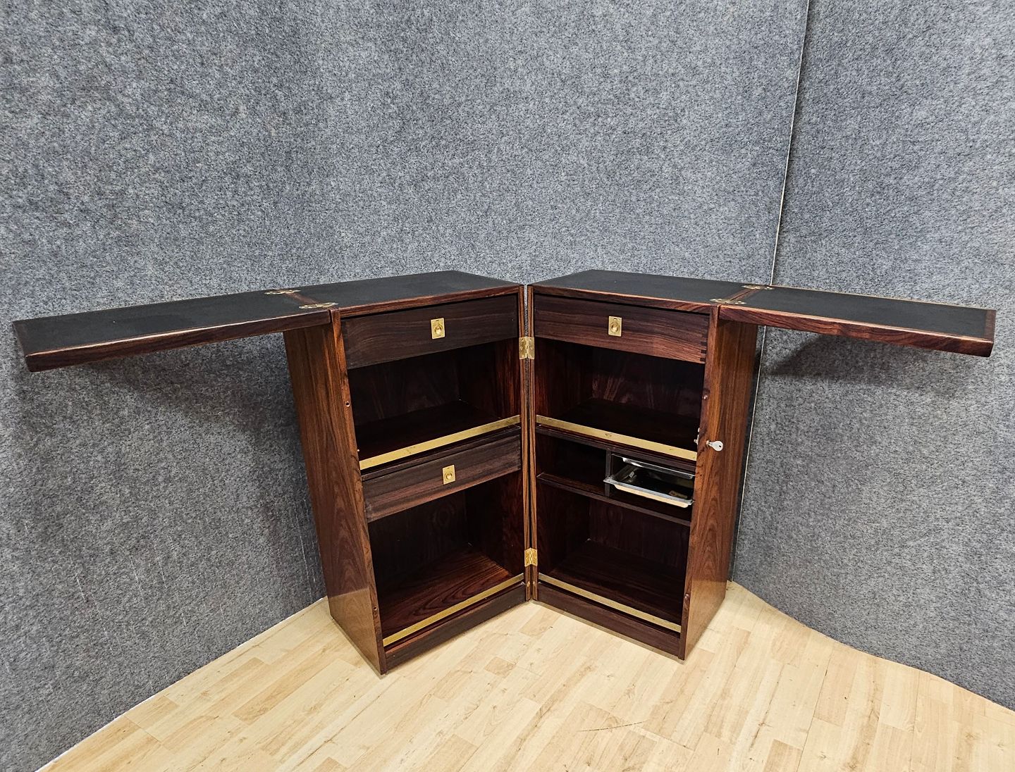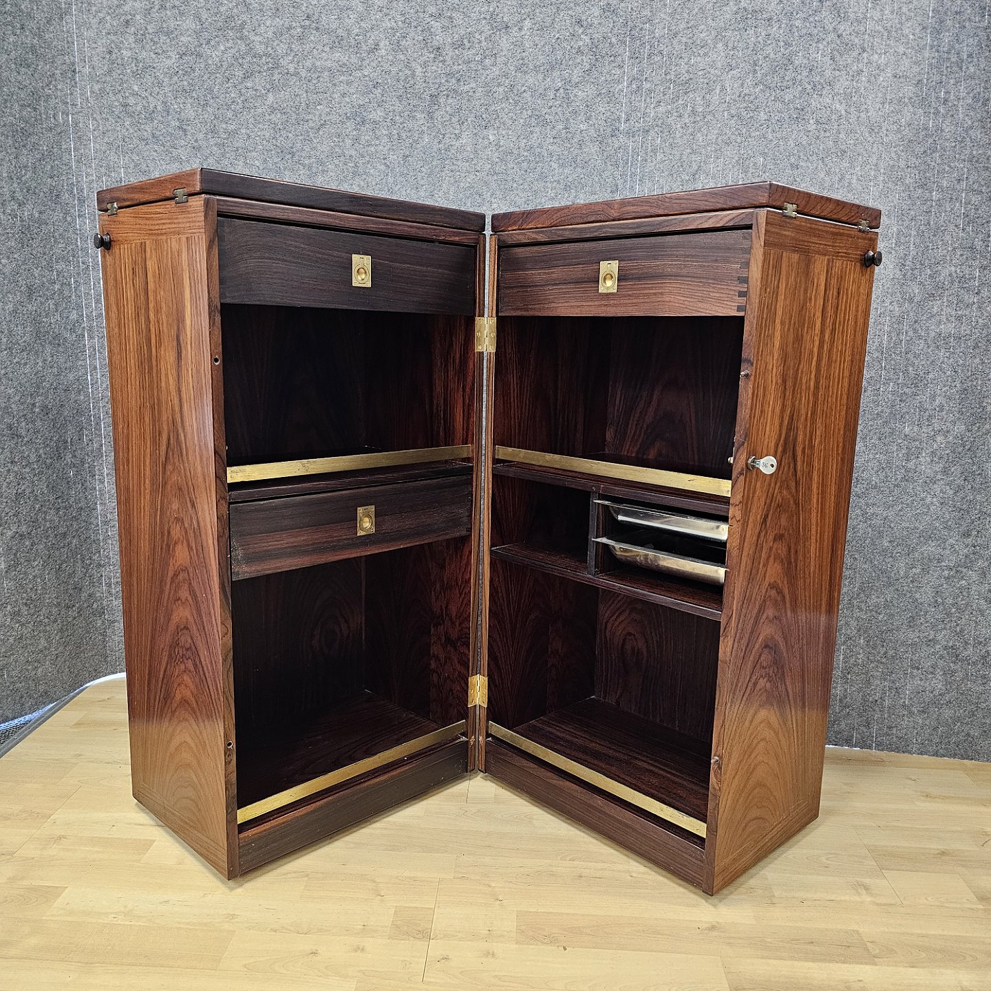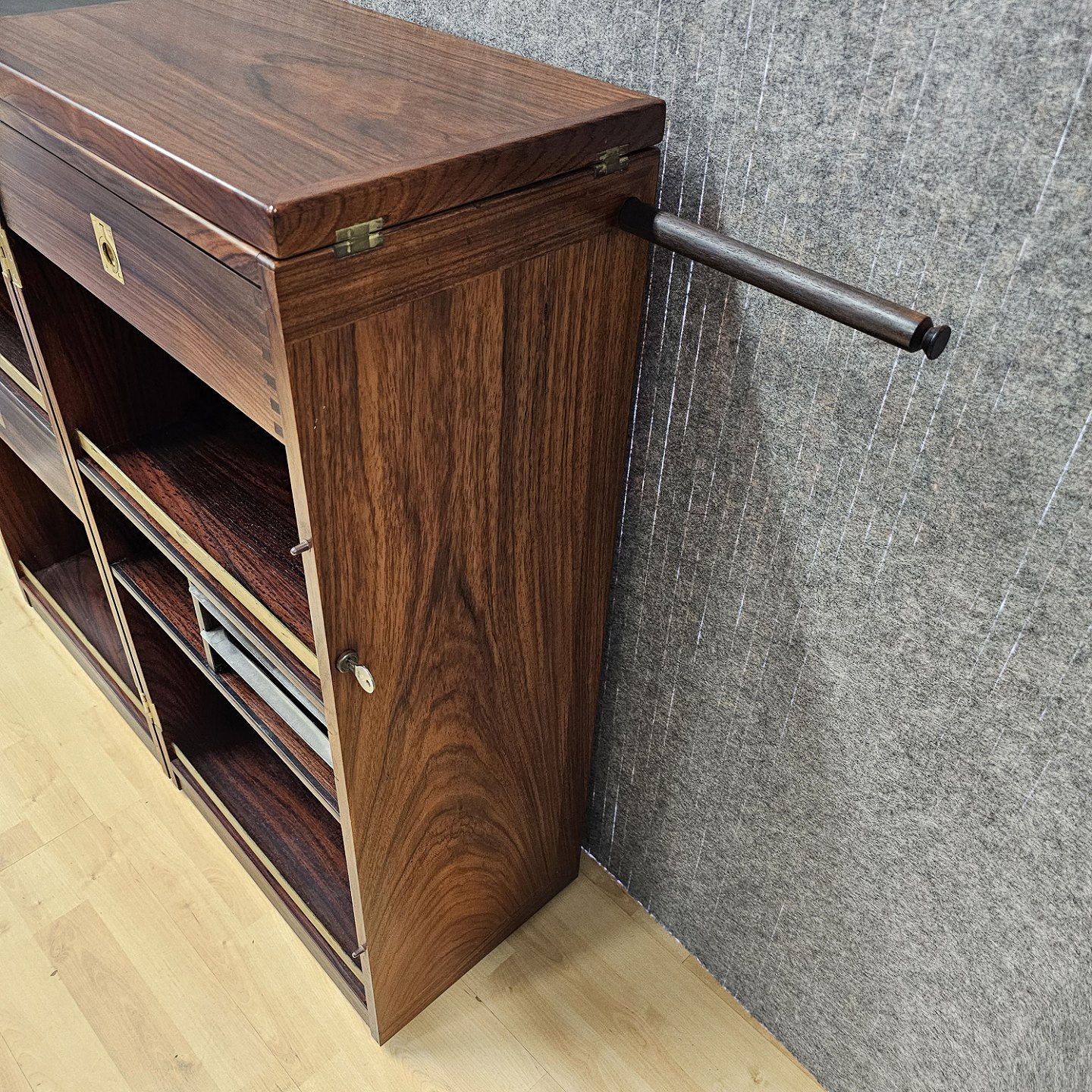 Den åbnes med nøgle og foldes ud. Bordplader foldes ud og holdes med to udtræksstænger.