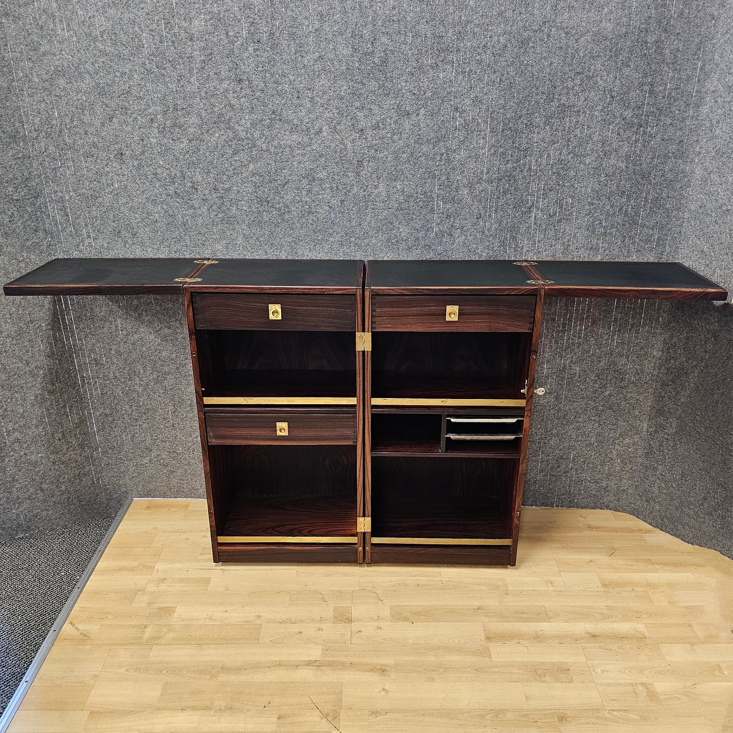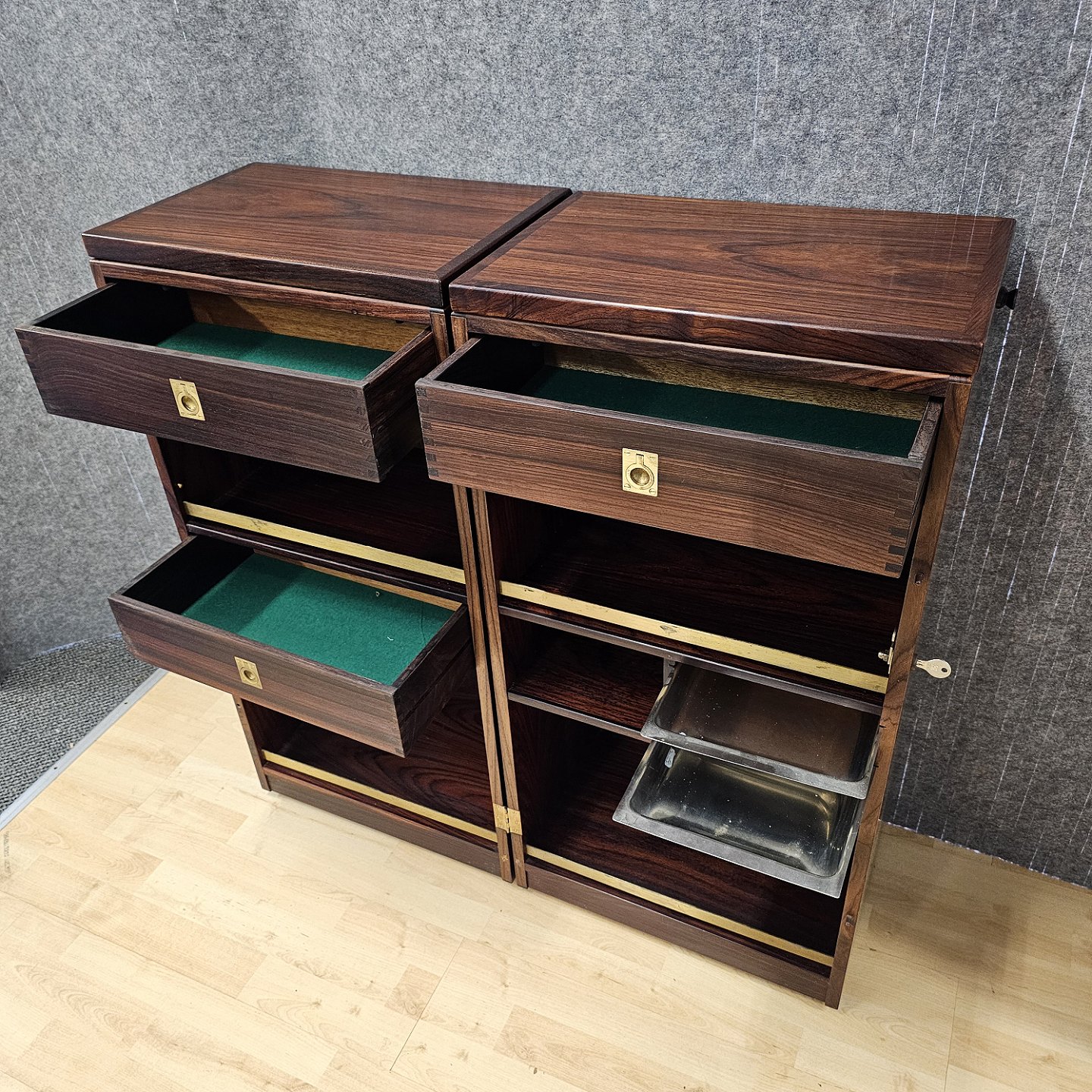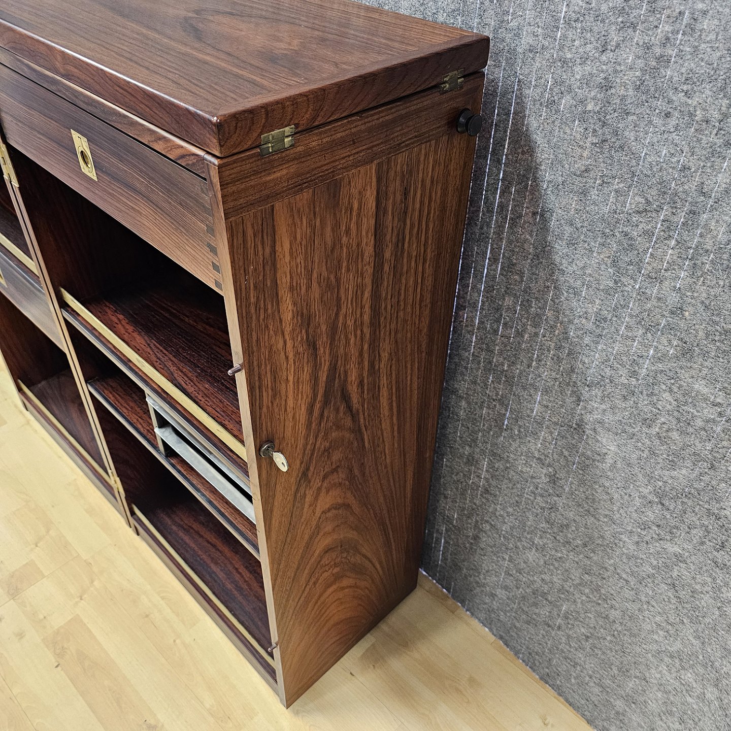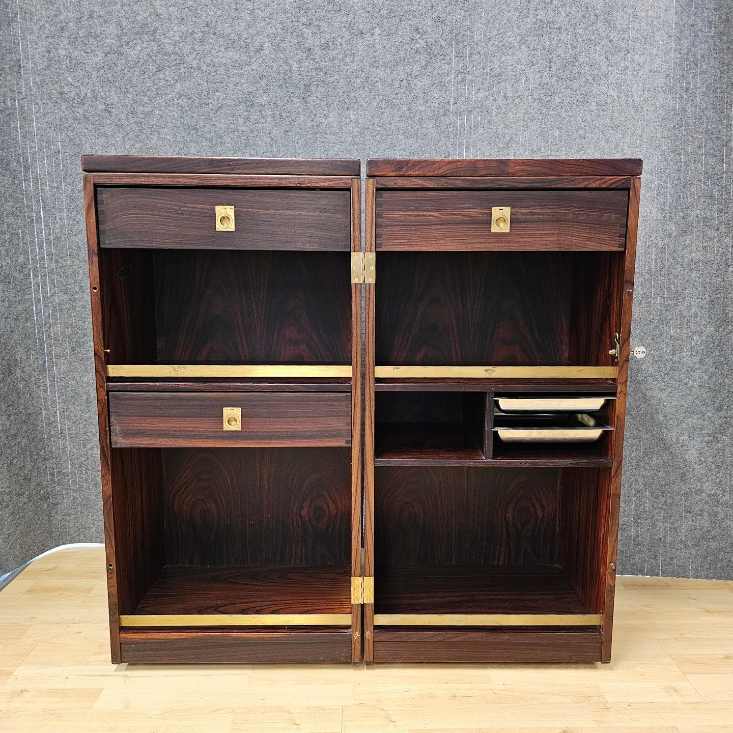 Den åbnes med nøgle og foldes ud. Bordplader foldes ud og holdes med to udtræksstænger.