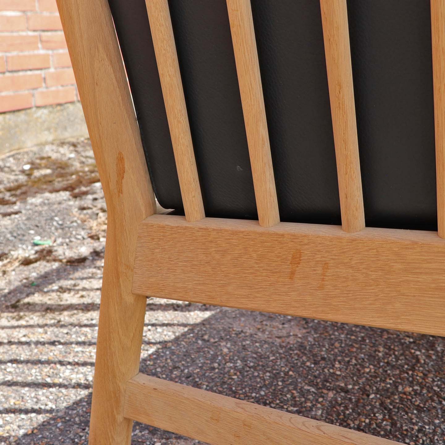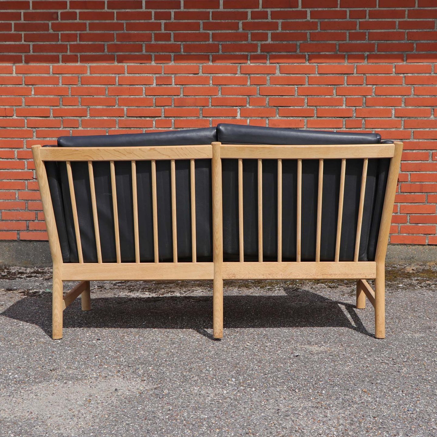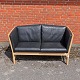 To personers tremmesofa med stel i matlakeret lyst egetræ med hynder betrukket med sort læder
