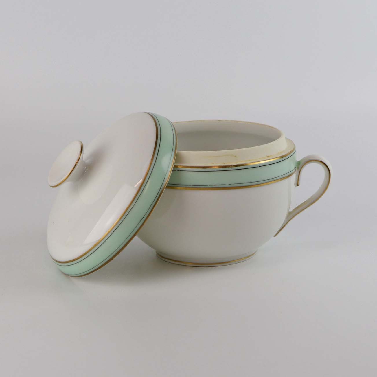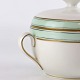 Service i glat hvidt porcelæn med mintblå dekoration og dobbelte guldkanter