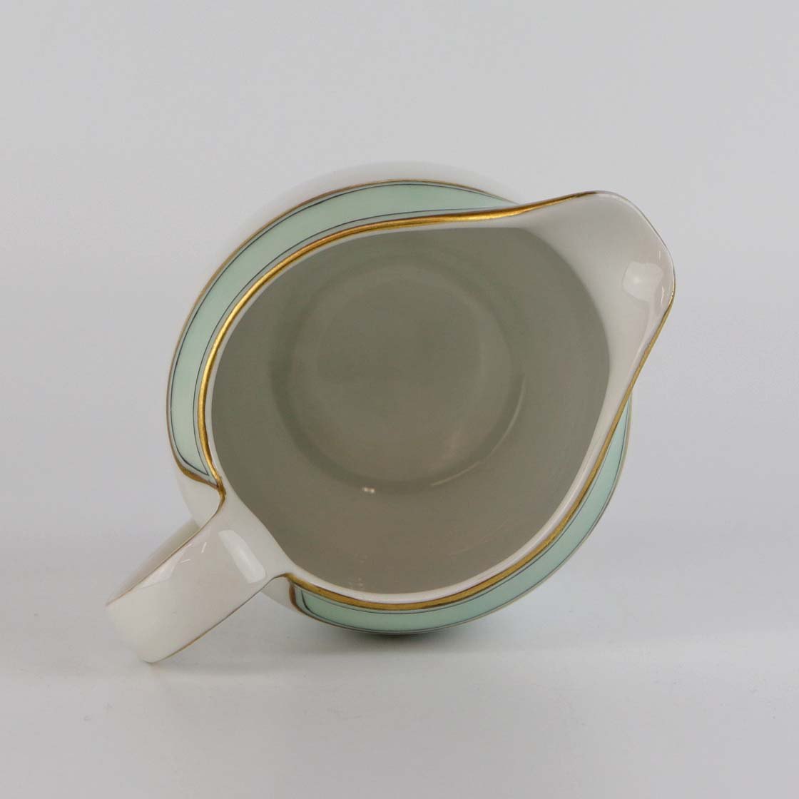 Service i glat hvidt porcelæn med mintblå dekoration og dobbelte guldkanter