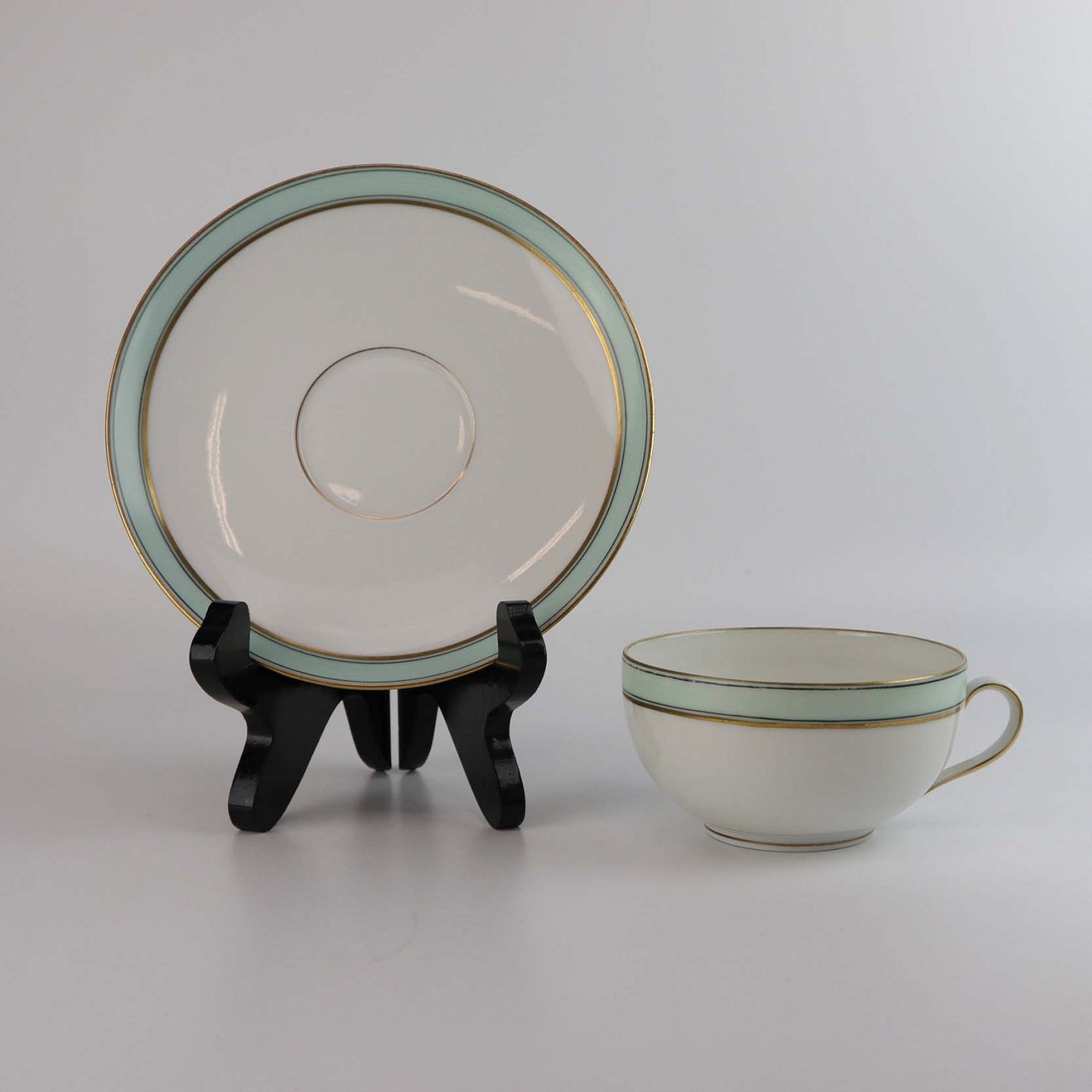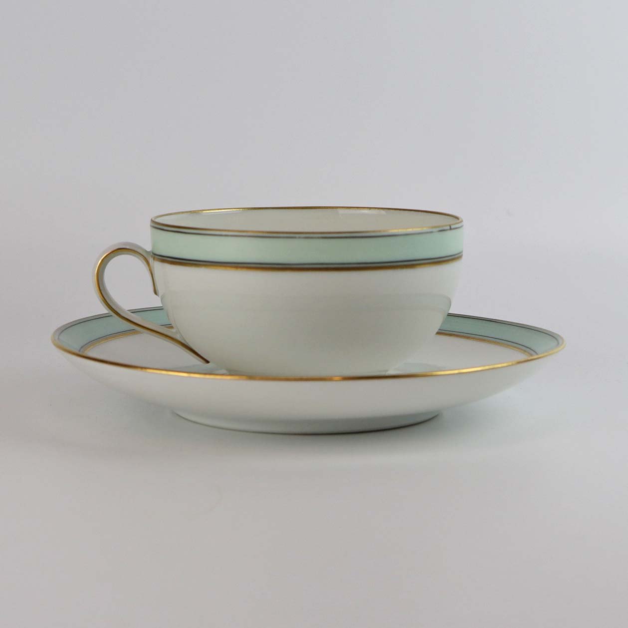 Service i glat hvidt porcelæn med mintblå dekoration og dobbelte guldkanter