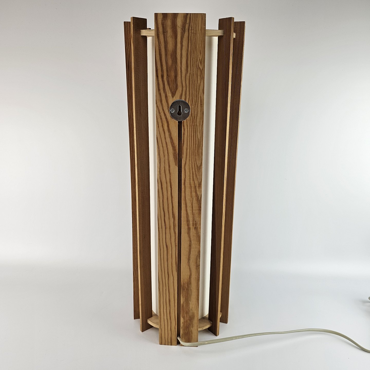 Lampe med lameller af fyrtræ og hvid inderskærm. Hul til vægophæng.