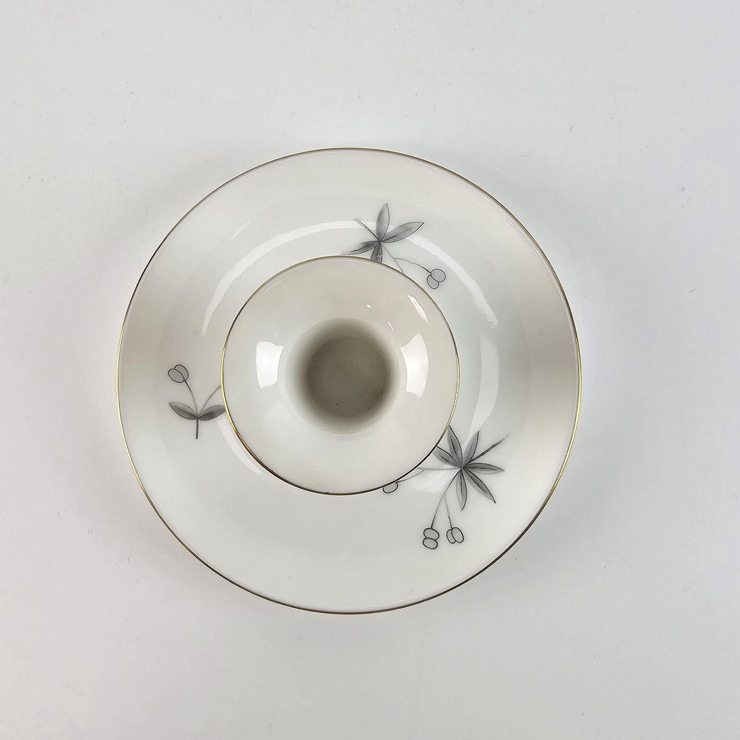 Stellet Henrik er af hvidt porcelæn dekoreret med grå burresnerre og guldkant. Mindre brugsspor kan forekomme
