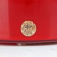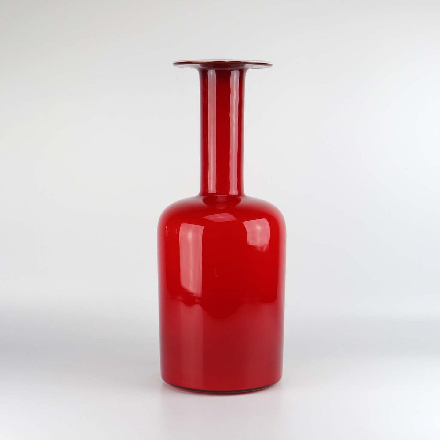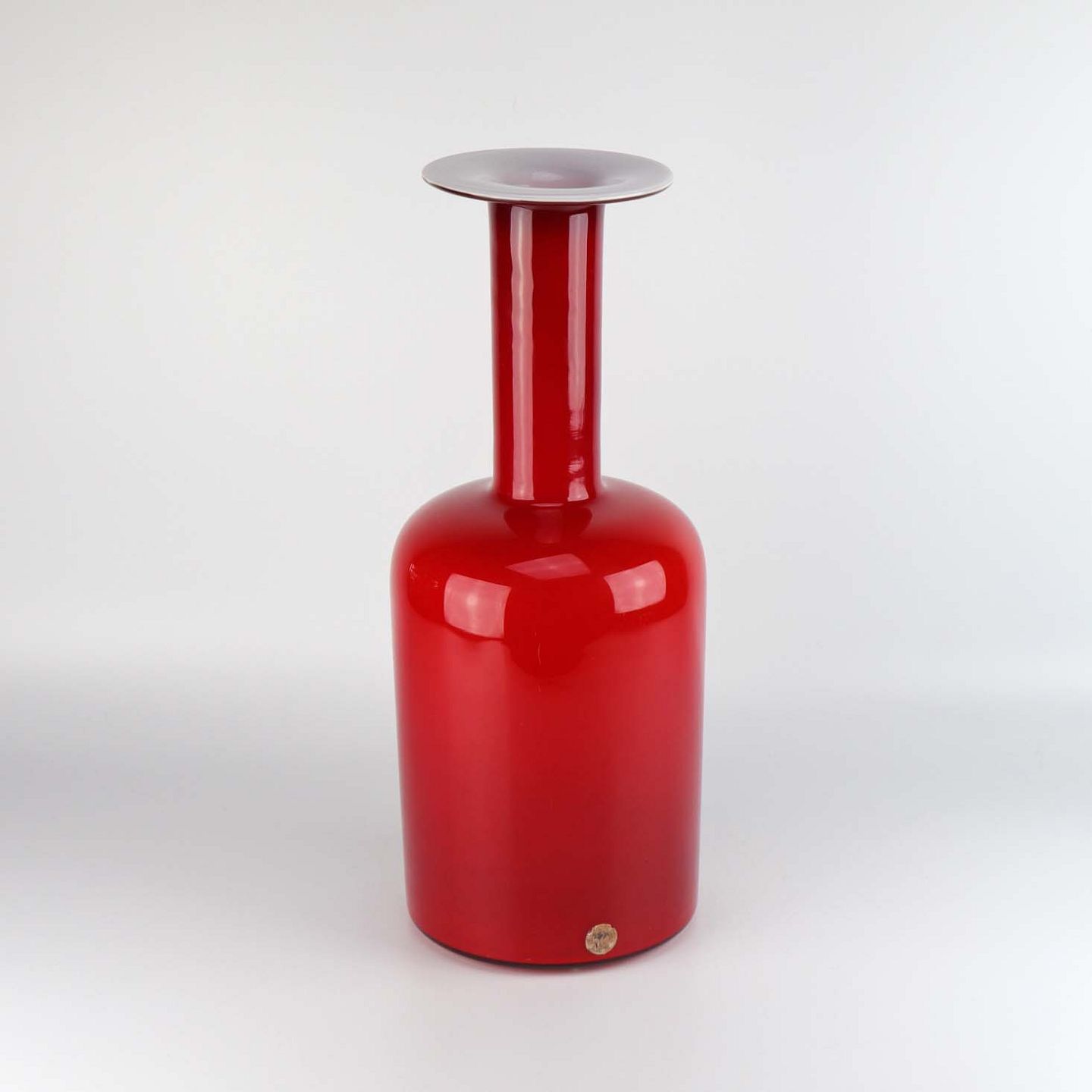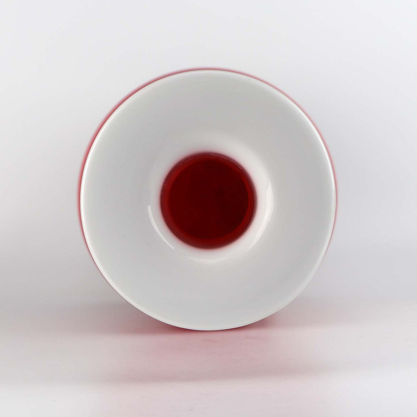 Rød mundblæst glasvase med opalhvid inderside og topkant. Fra serien Rød Palet