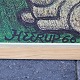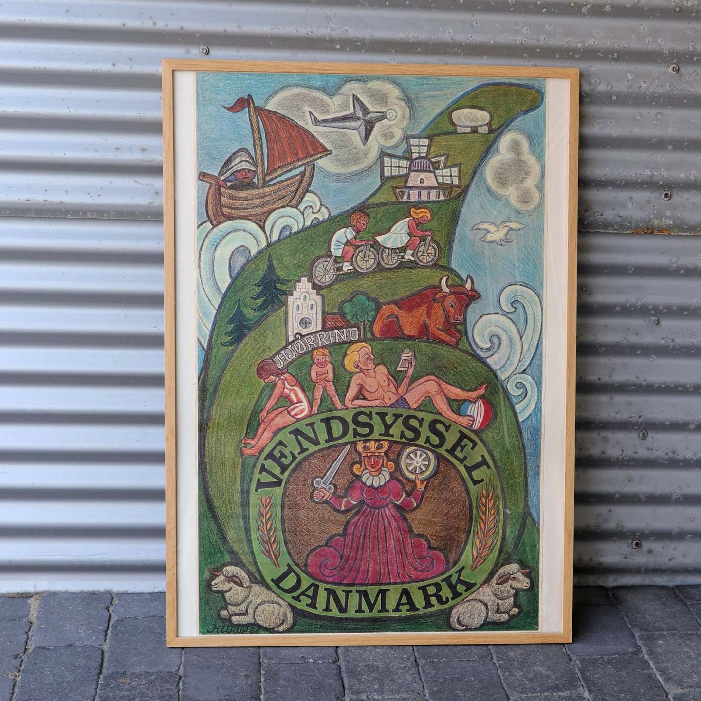 Indrammet grafisk tryk i træramme med plast fortsats og motiv af vendsyssel området. Trykket indeholder flere farverige motiver af både dyr og mennesker.