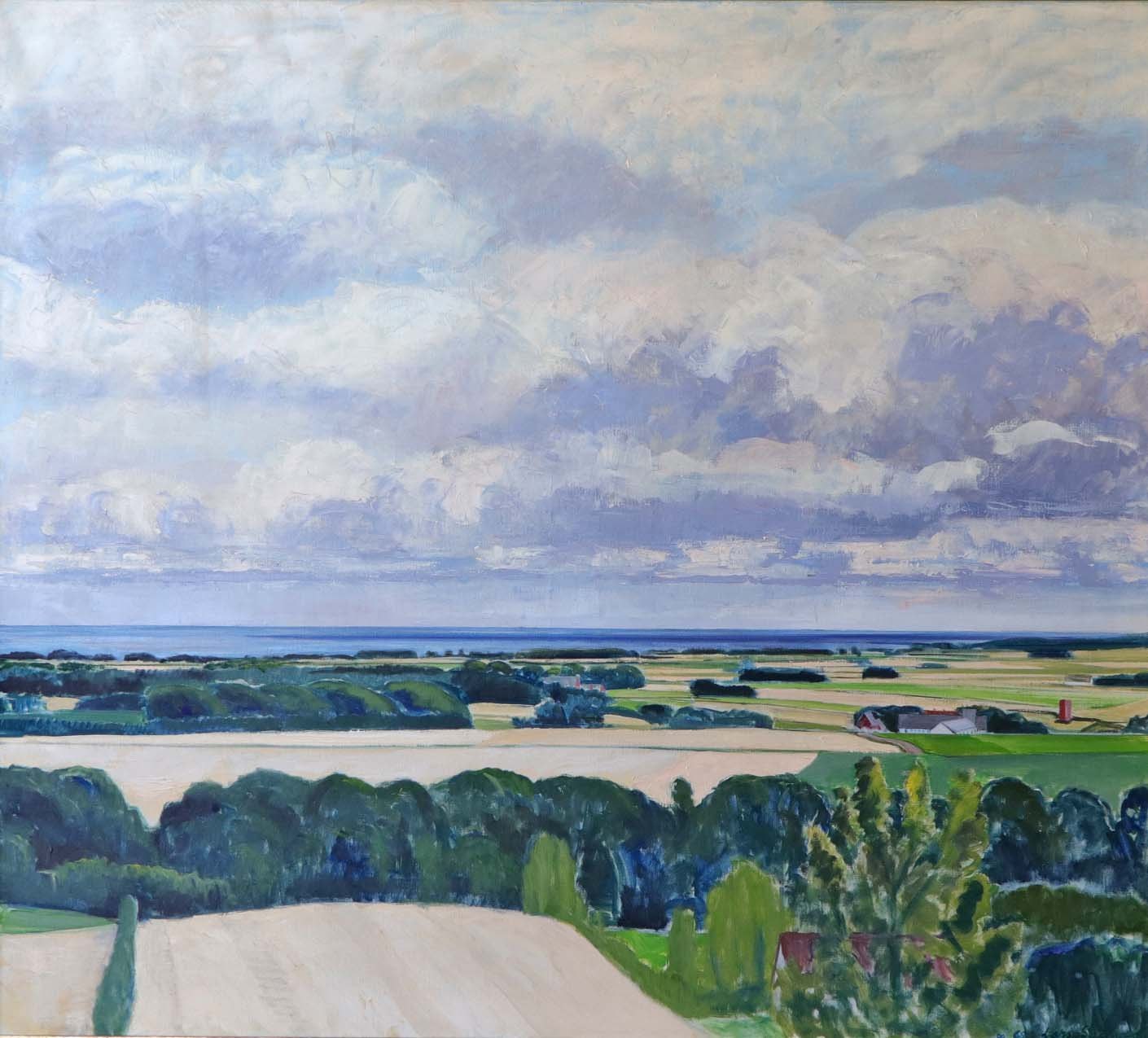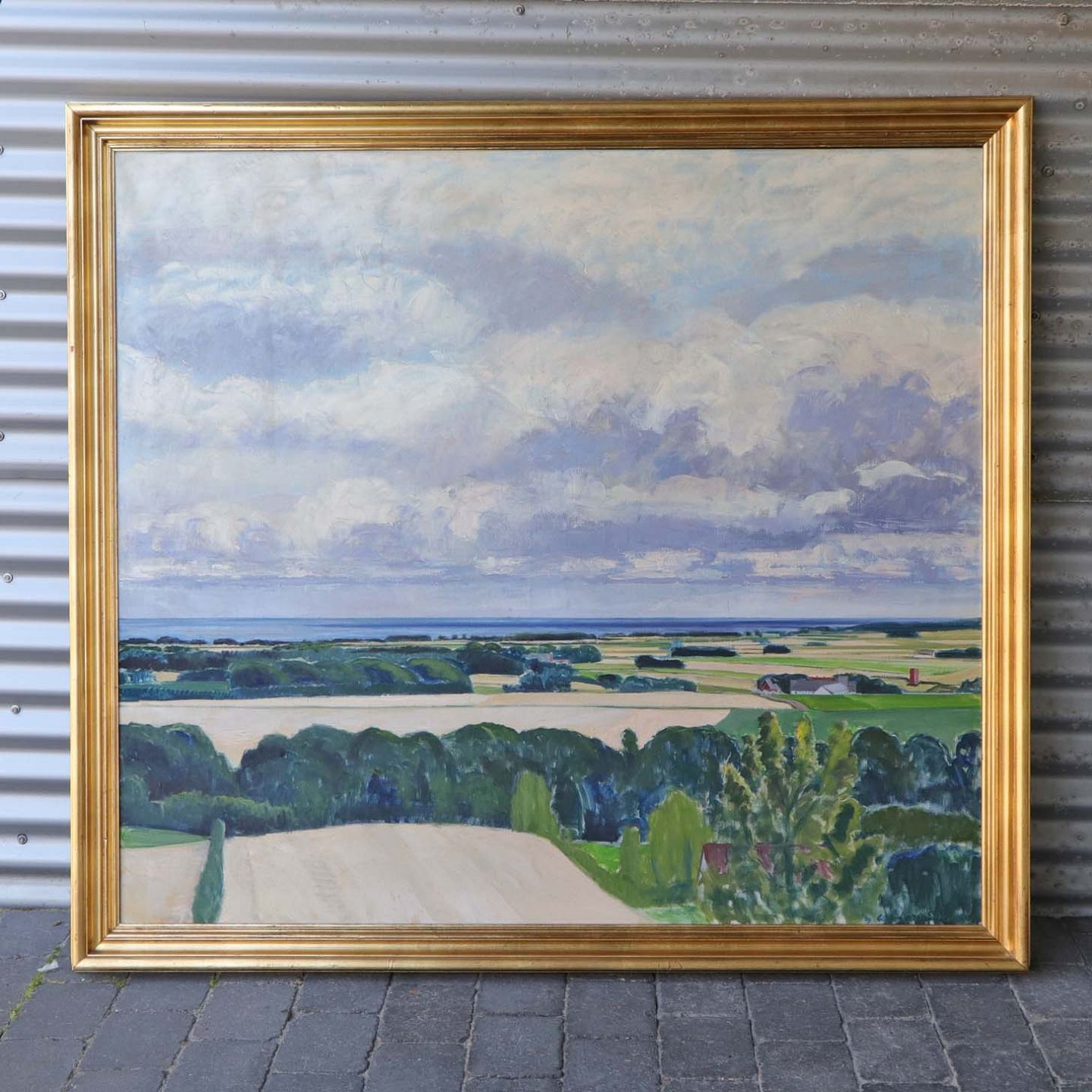 Stort maleri på lærred i gyldenmalet træramme med motiv af landskab med udsigt over marker, gårde, hav og himmel