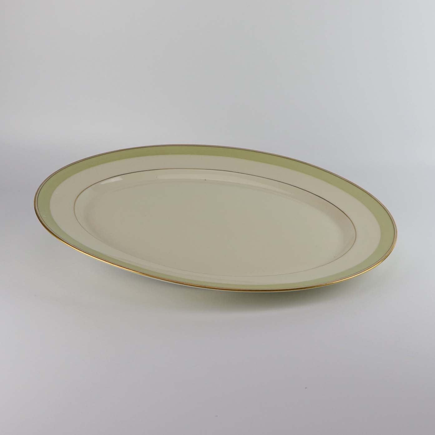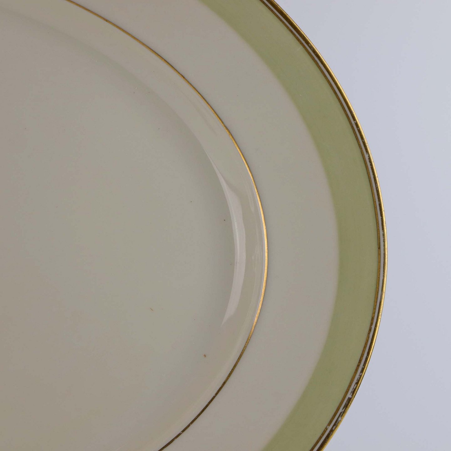 Stellet er fremstillet i glat cremefarvet porcelæn med lysegrøn dekoration og guldkant.
