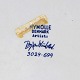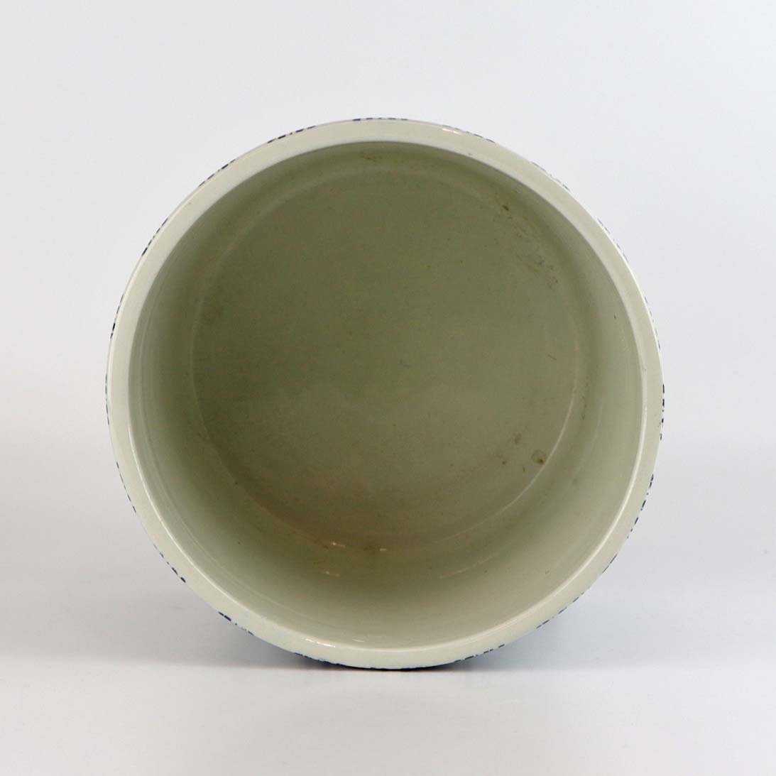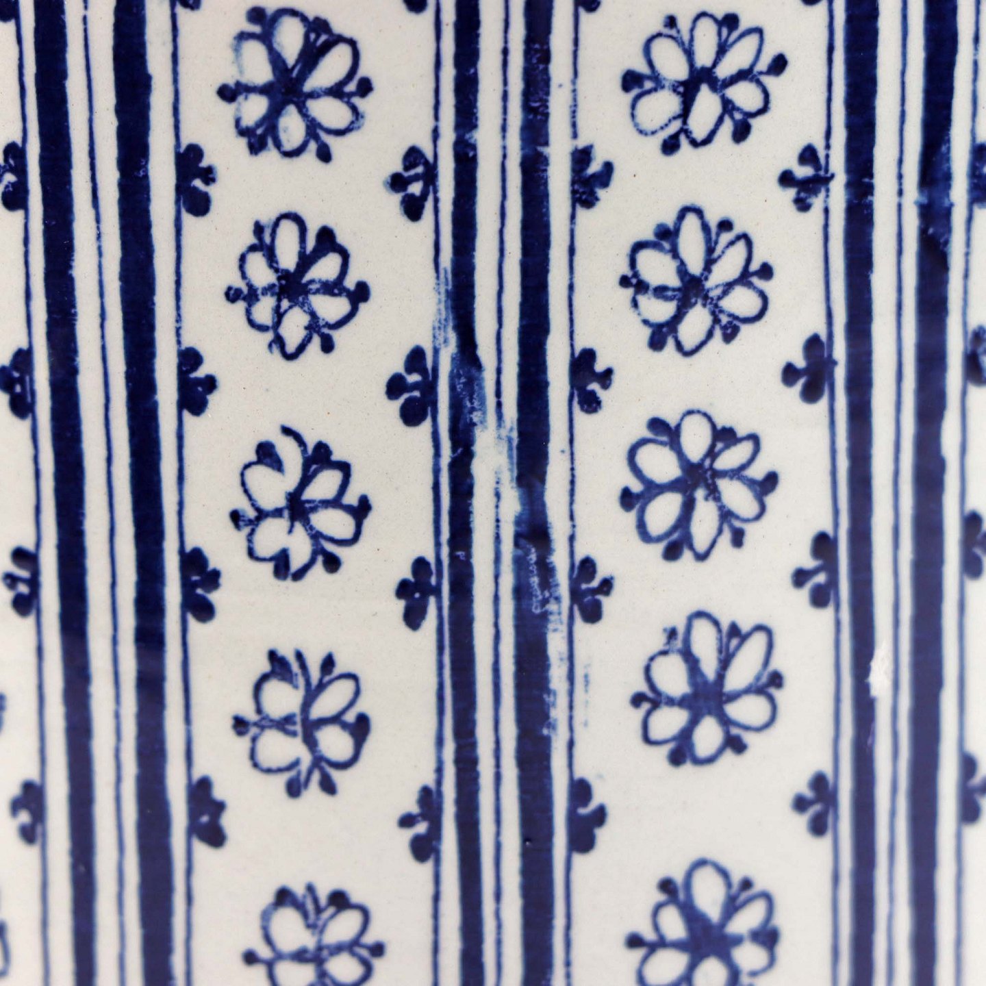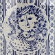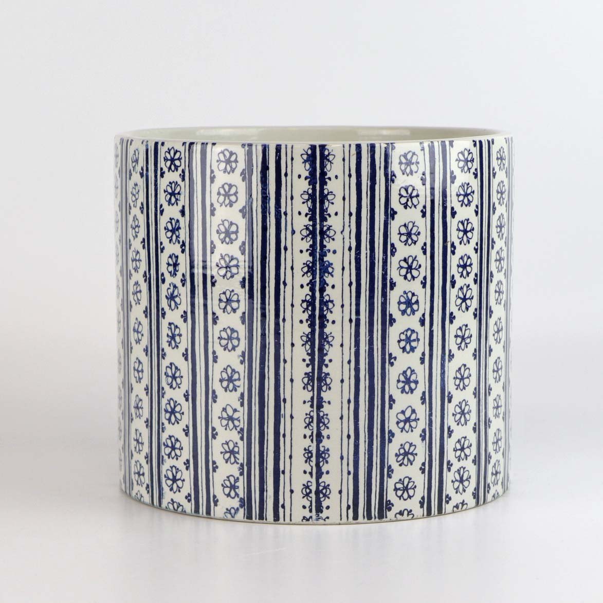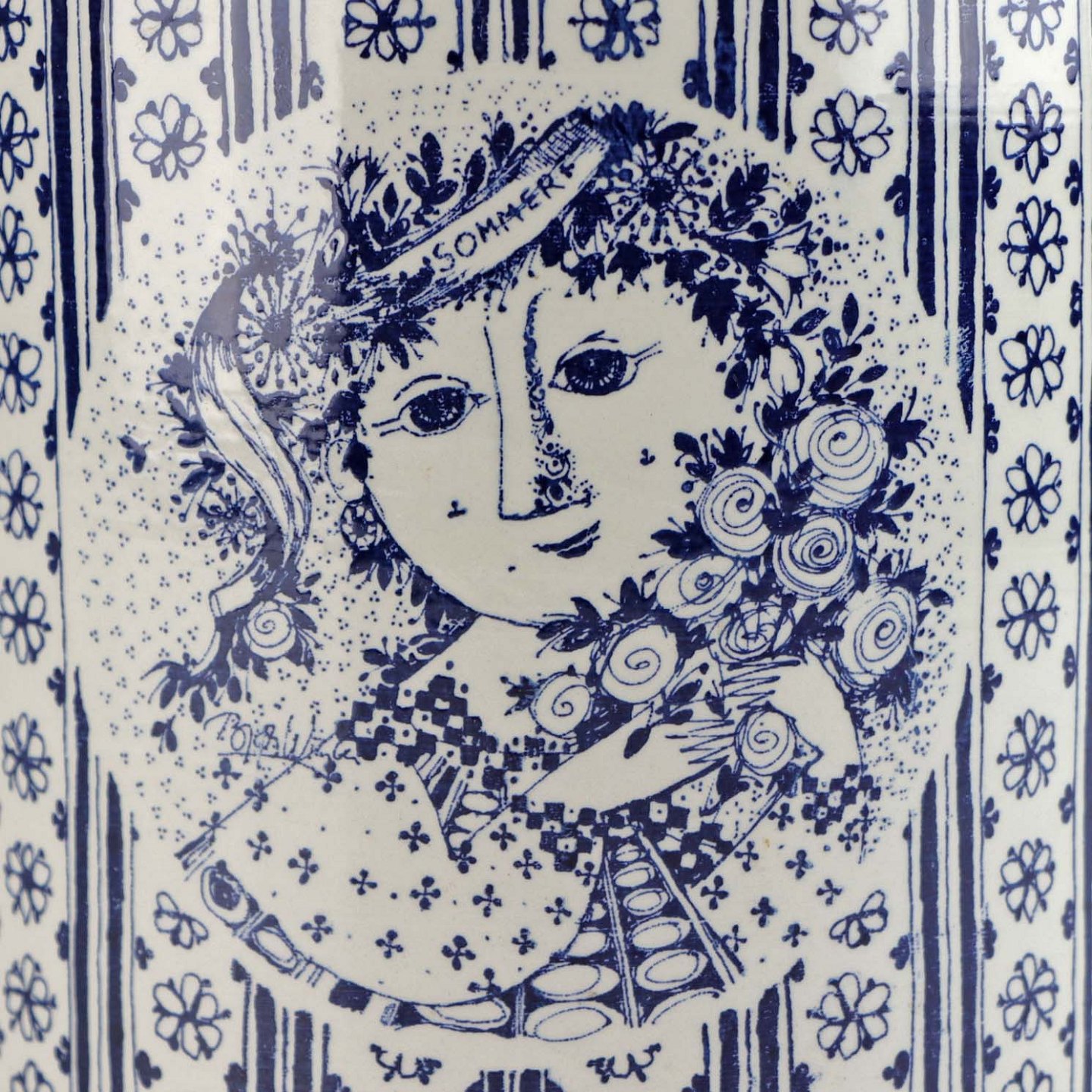 Urtepotteskjuler i porcelæn med motiv i blå streg af kvinde med en buket blomster i hånd med titlen Sommer. Nr. 3024-699