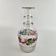 Mundblæst karaffel af glas, dekoreret med emaljemalede frise indeholdende roser, blade og forskellige blomster. Revne i nederste del.