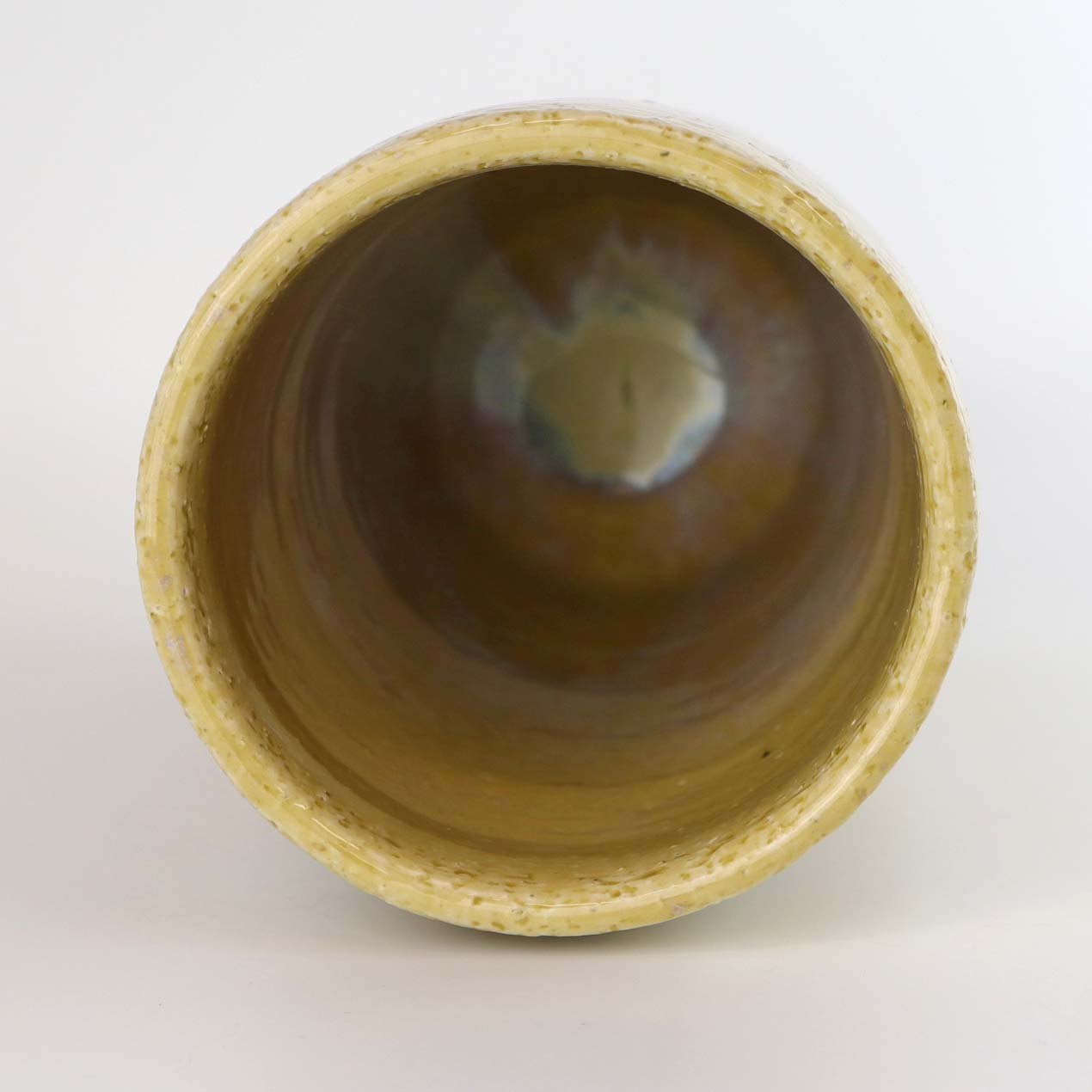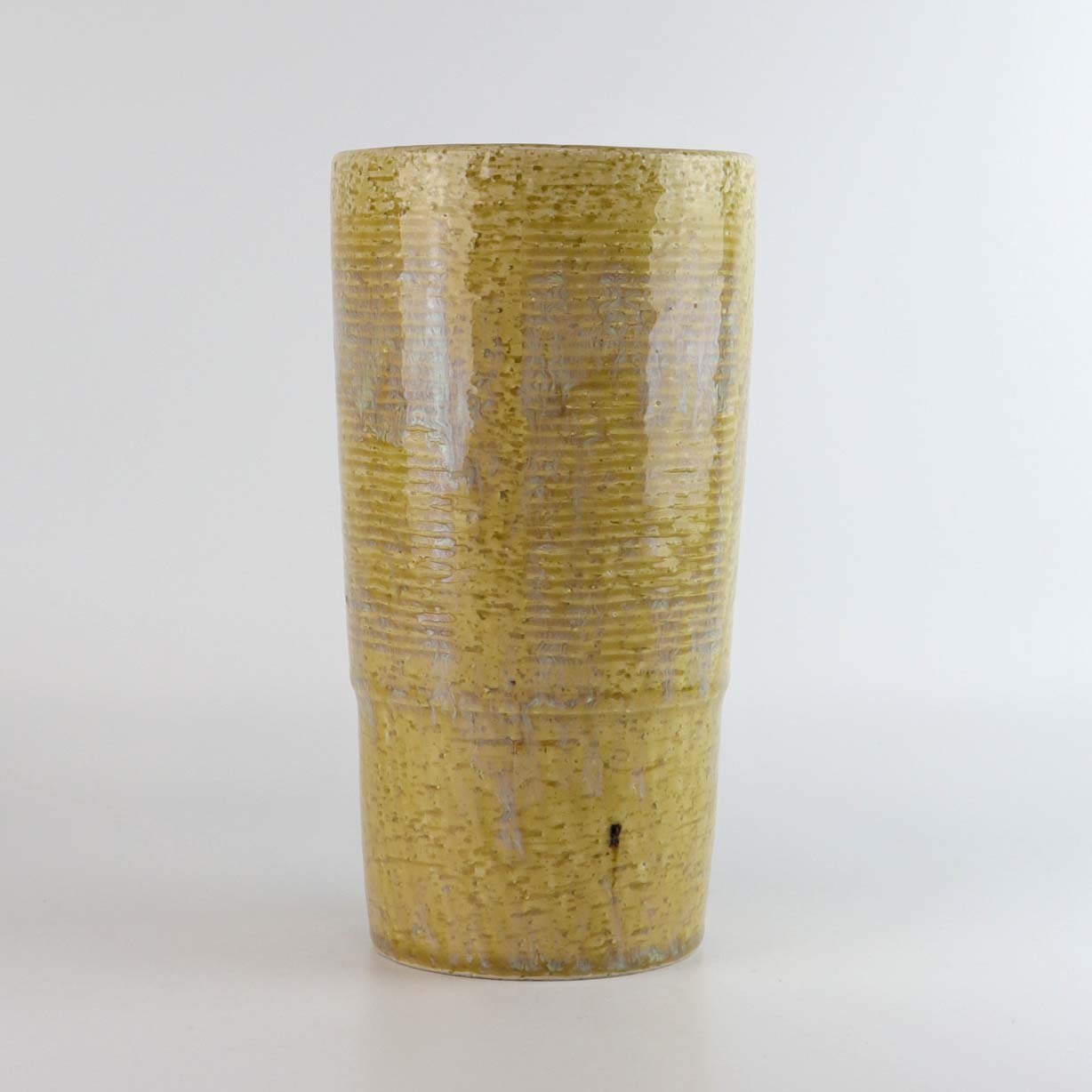 Cylinderformet vase i stentøj med gul glasur og let stribet mønster. Nr. C4