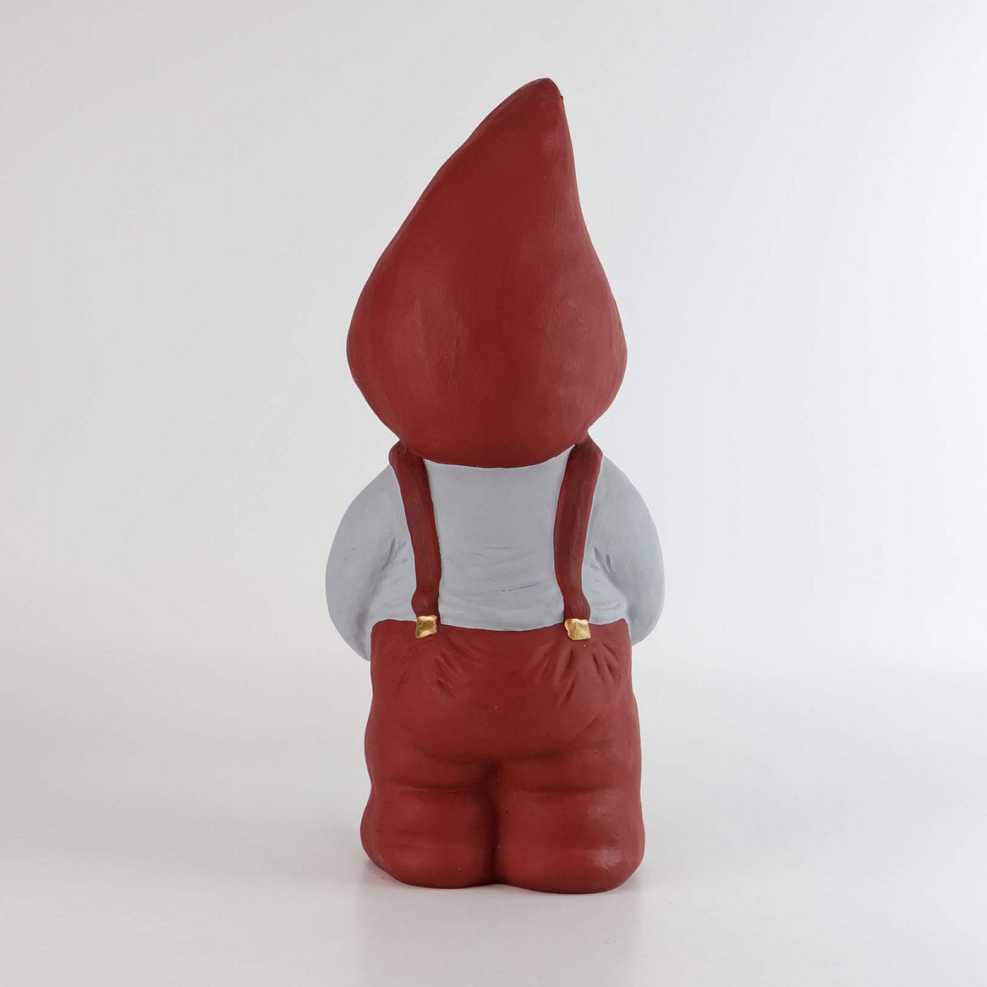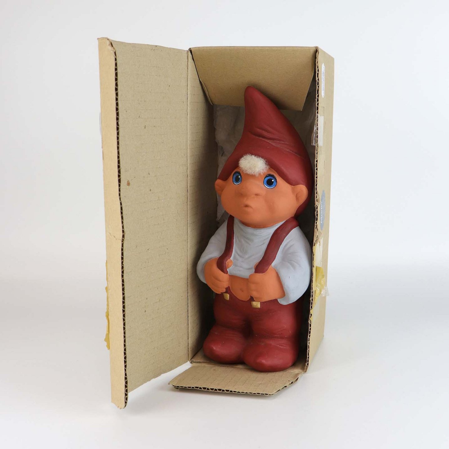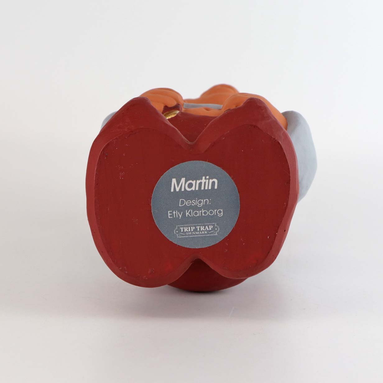 Figur af Nissen Martin, som har hænderne omkring selerne der holder hans røde bukser oppe og er iført rød nissehue. Figuren kommer med tilhørende boks.